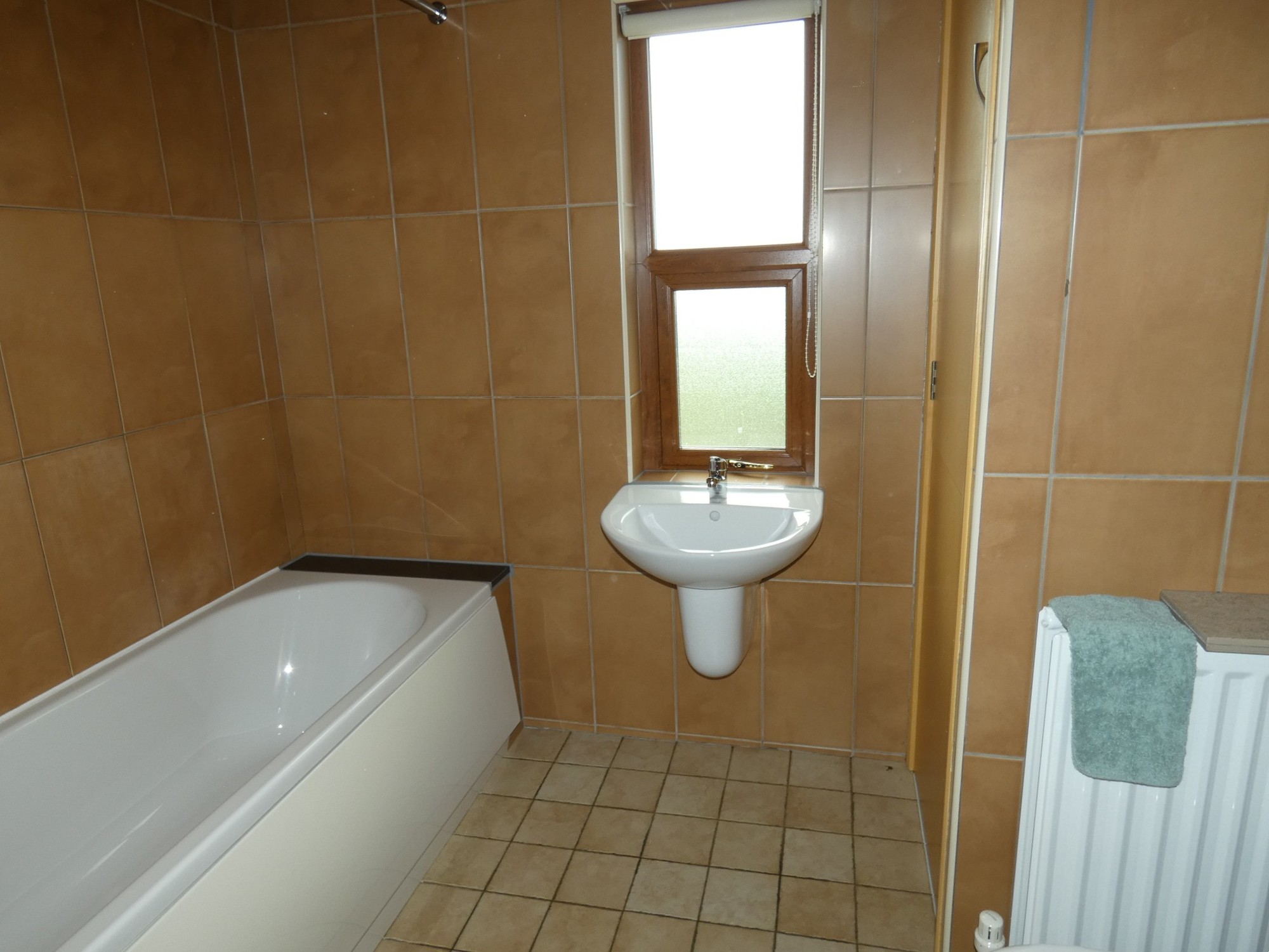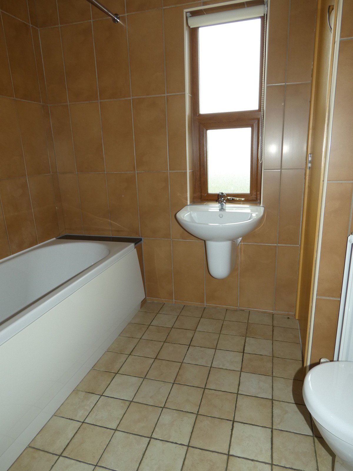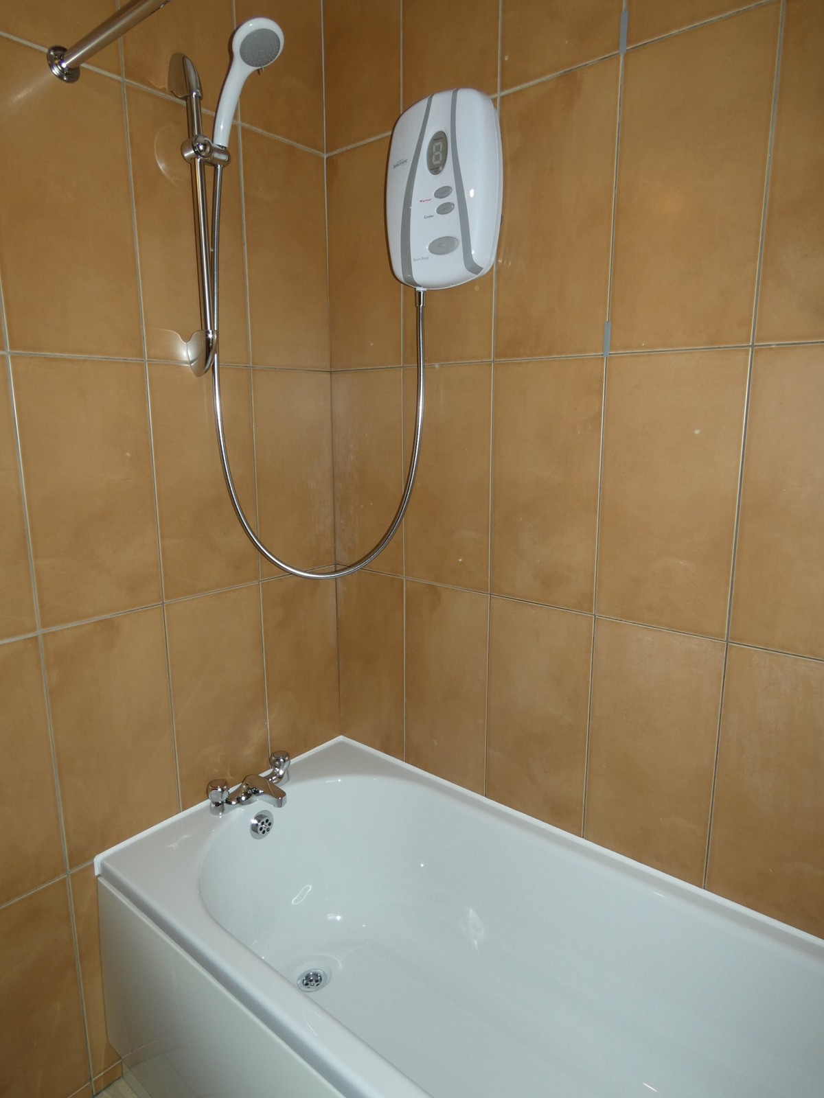 Fitted suite including a wall mounted wash hand basin, a w.c, an airing cupboard, tiled floor, tiled walls and a panel bath with a tiled surround and an electric shower over.