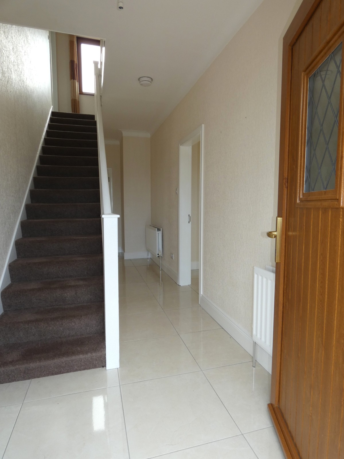 Partly glazed upvc front door with glazed side panels, contemporary tiled flooring, ceiling coving and doors to the main living rooms.