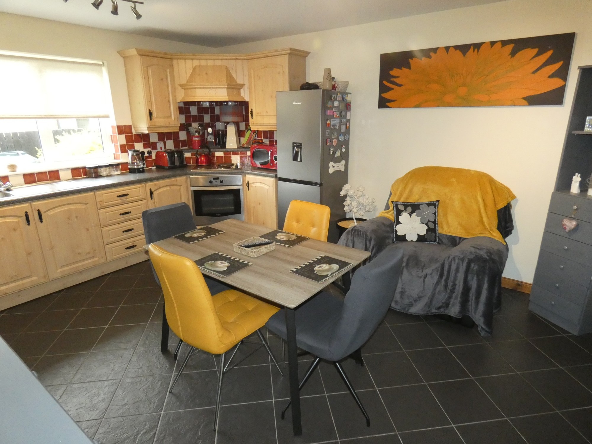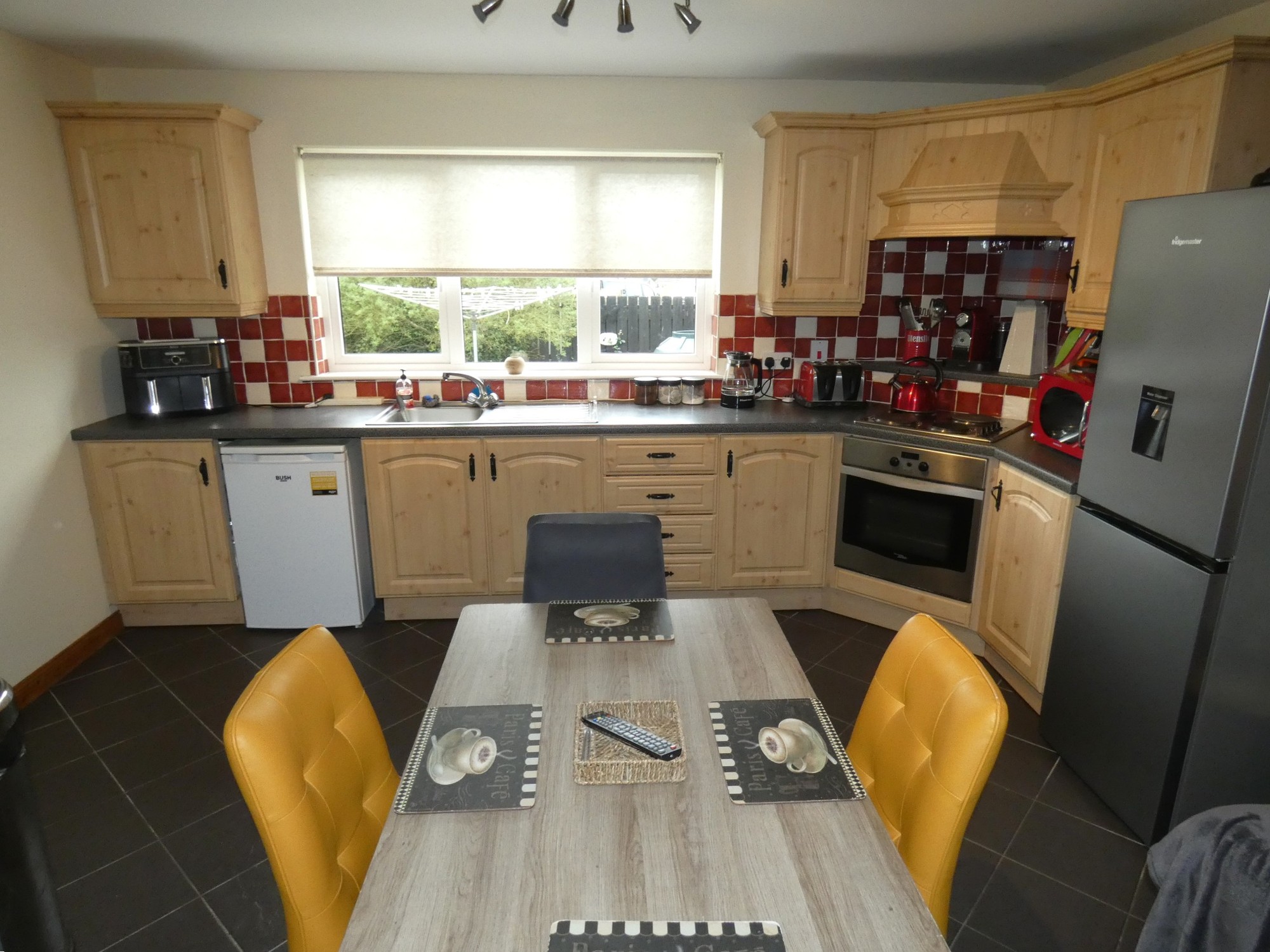 With a superb range of fitted eye and low level units, single bowl and drainer stainless steel sink, tiled between the worktop and the eye level units, electric oven and hob with an extractor canopy over, space for a fridge and a fridge/freezer, high level T.V. point, tiled flooring and a door to the utility room.