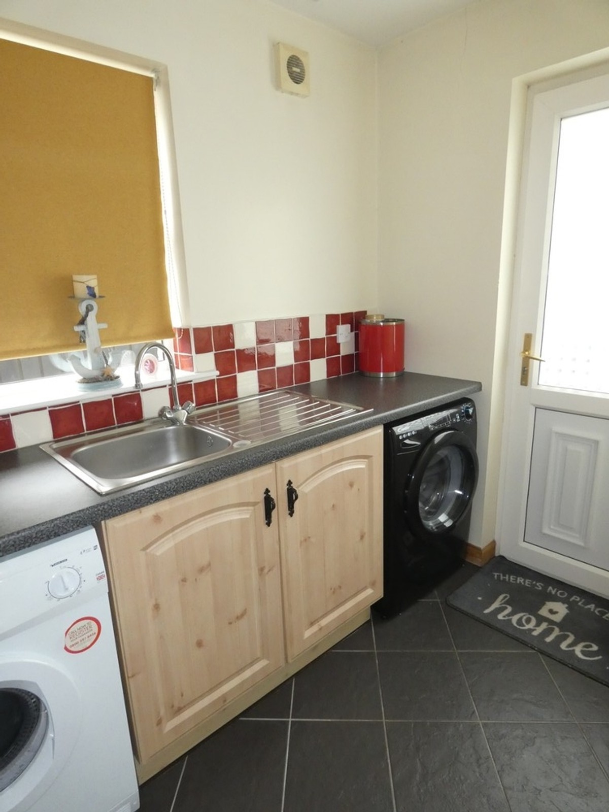 With a fitted double low level unit, stainless steel sink, tiled splashback around the worktop, plumbed for automatic washing machine, space for a tumble dryer and a partly glazed Upvc door to the rear.