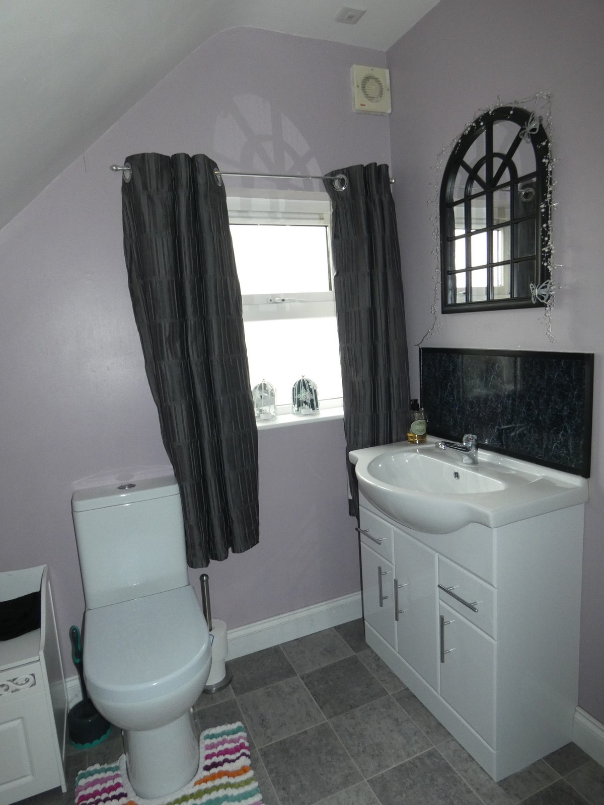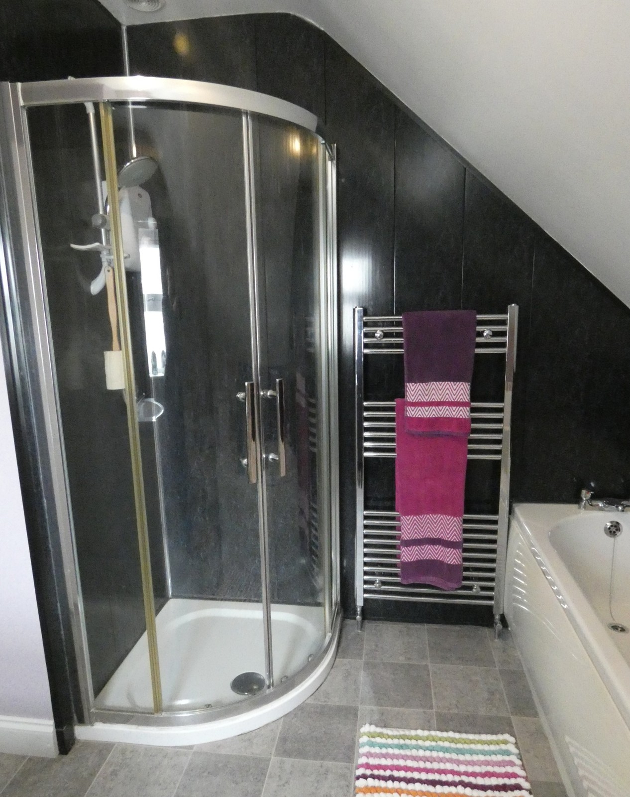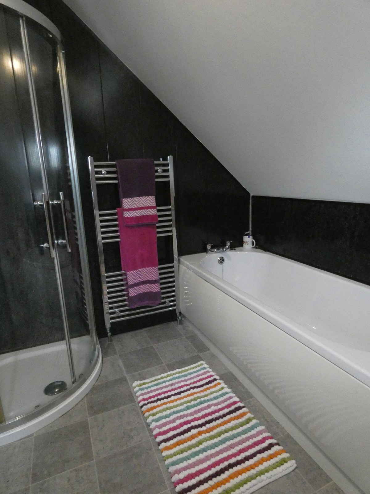 A super family bathroom comprising a WC, a large vanity unit with storage below and a panelled splashback, panel bath with a splashback, heated towel rail, extractor fan and a panelled shower cubicle with a Redring power shower.