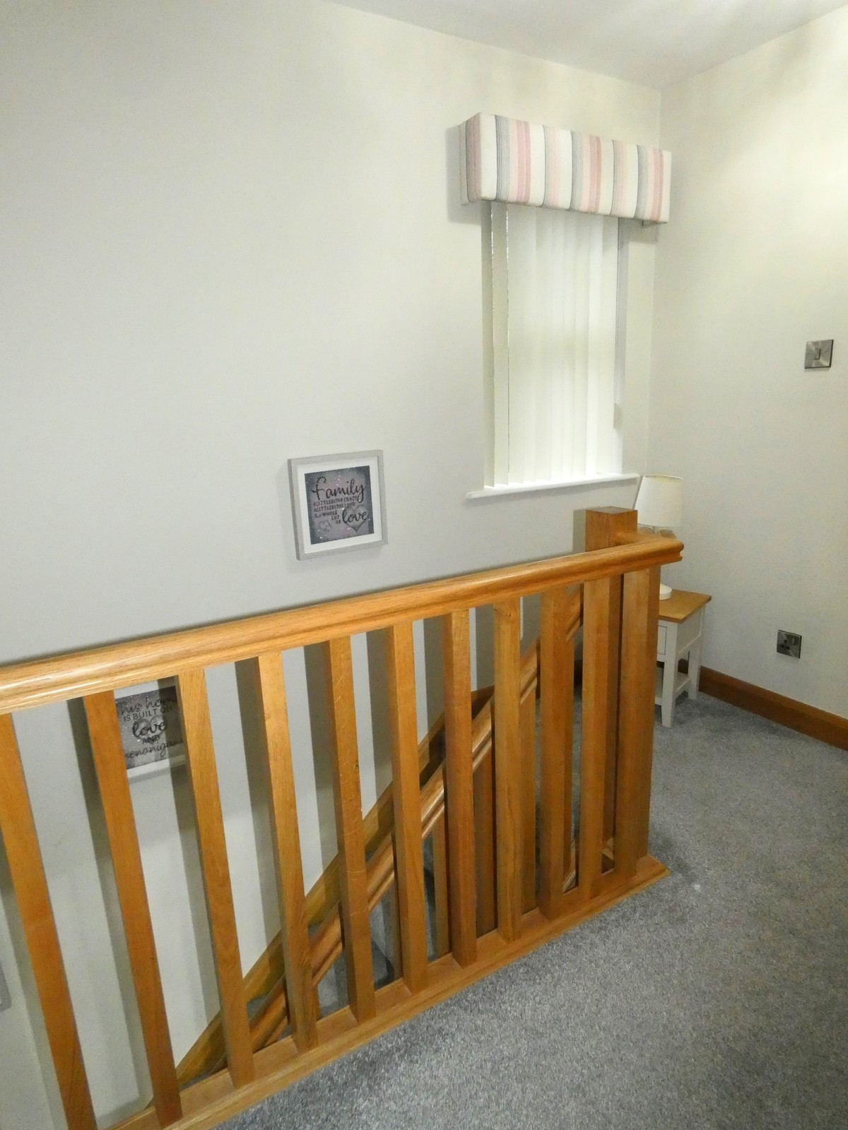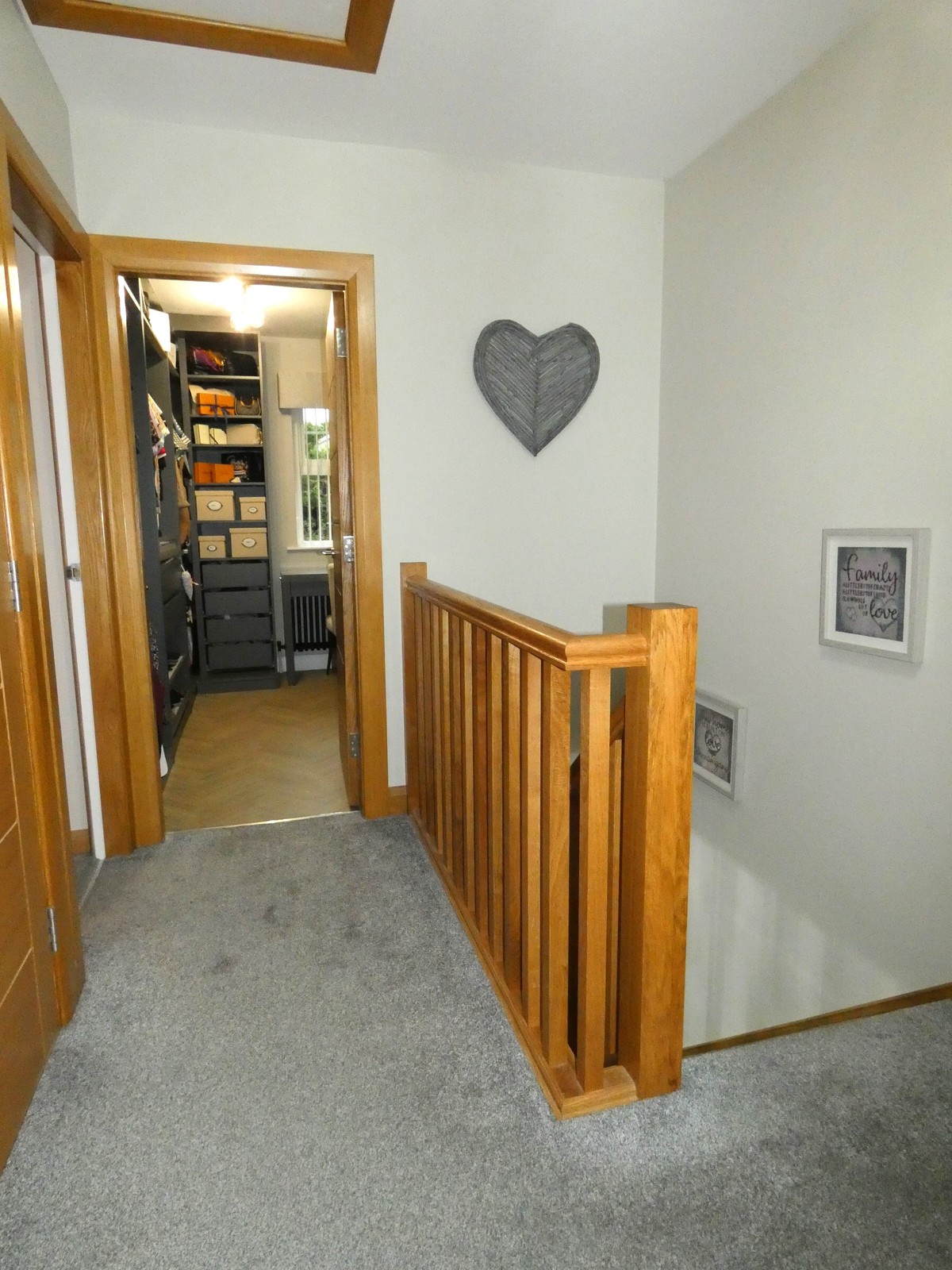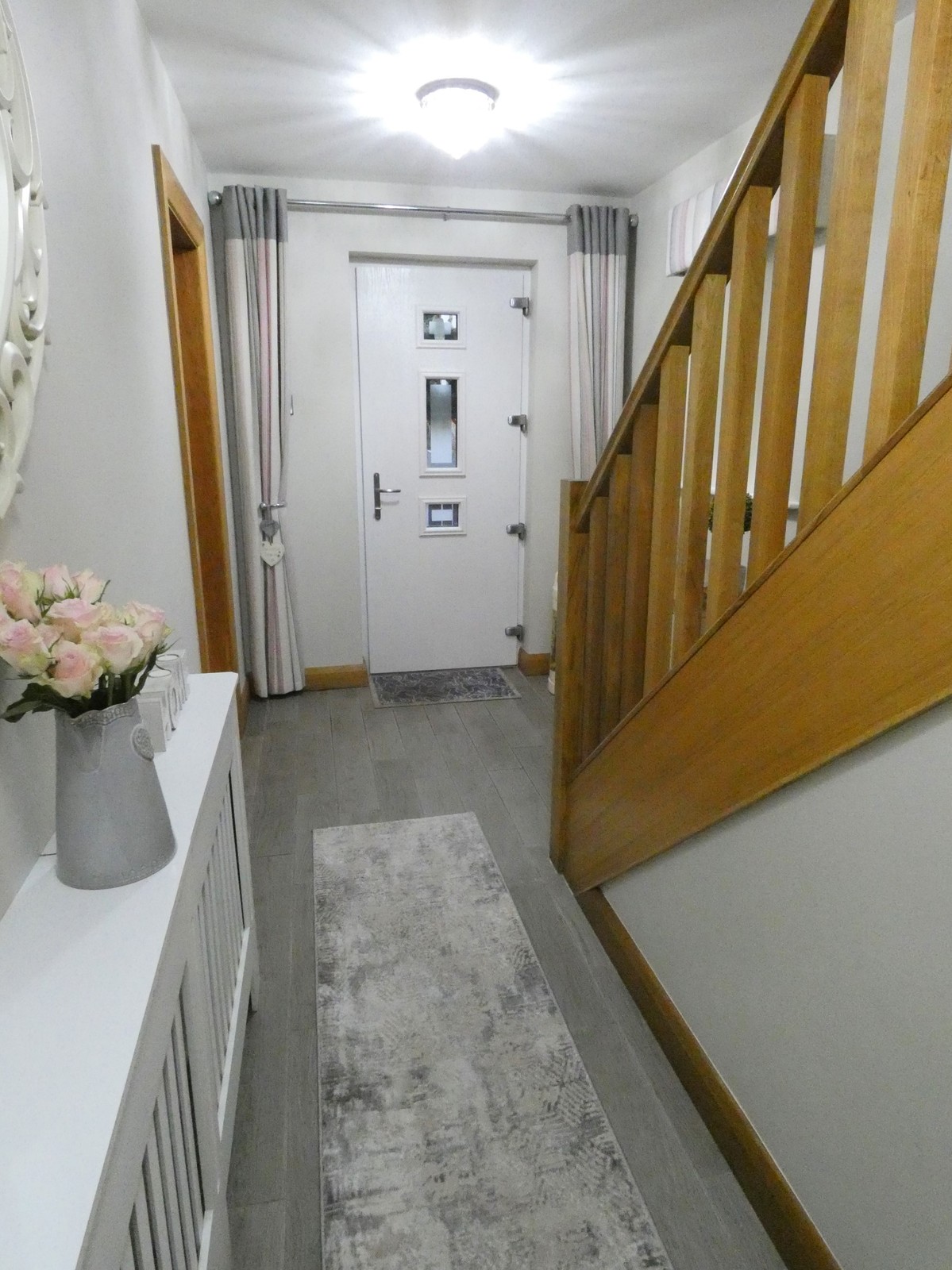 Partly glazed composite front door, attractive tiled flooring and a feature oak balustrade staircase to the upper floor with storage below.