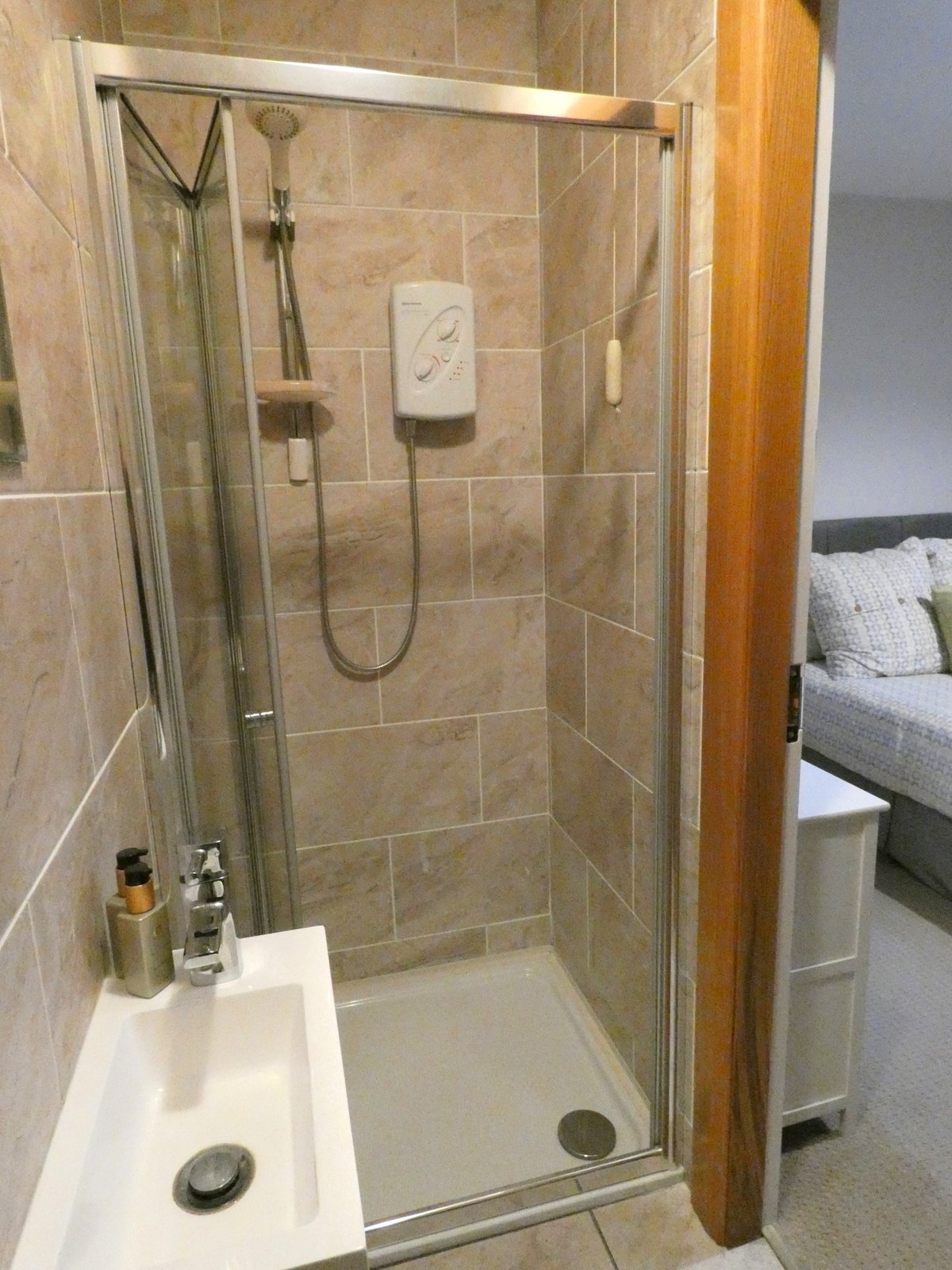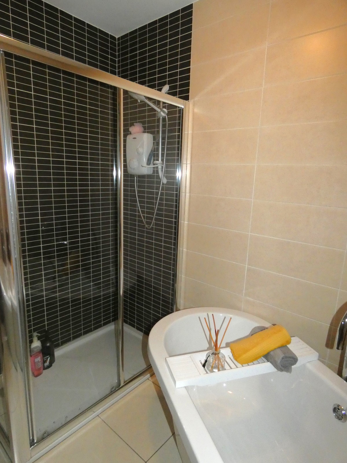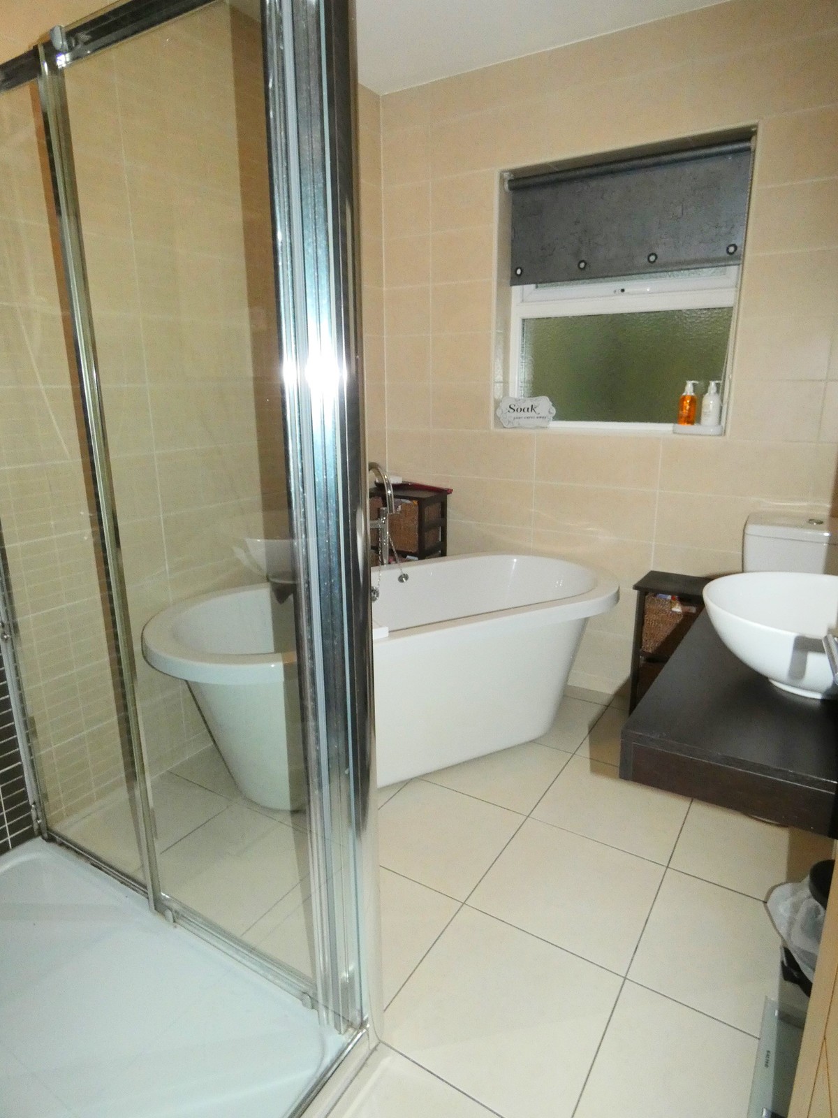 A luxurious family bathroom including a freestanding roll top bath with a mixer tap over, feature vanity unit with a mixer tap, tiled walls, tiled floor, extractor fan and a large tiled shower cubicle with a Redring electric shower.