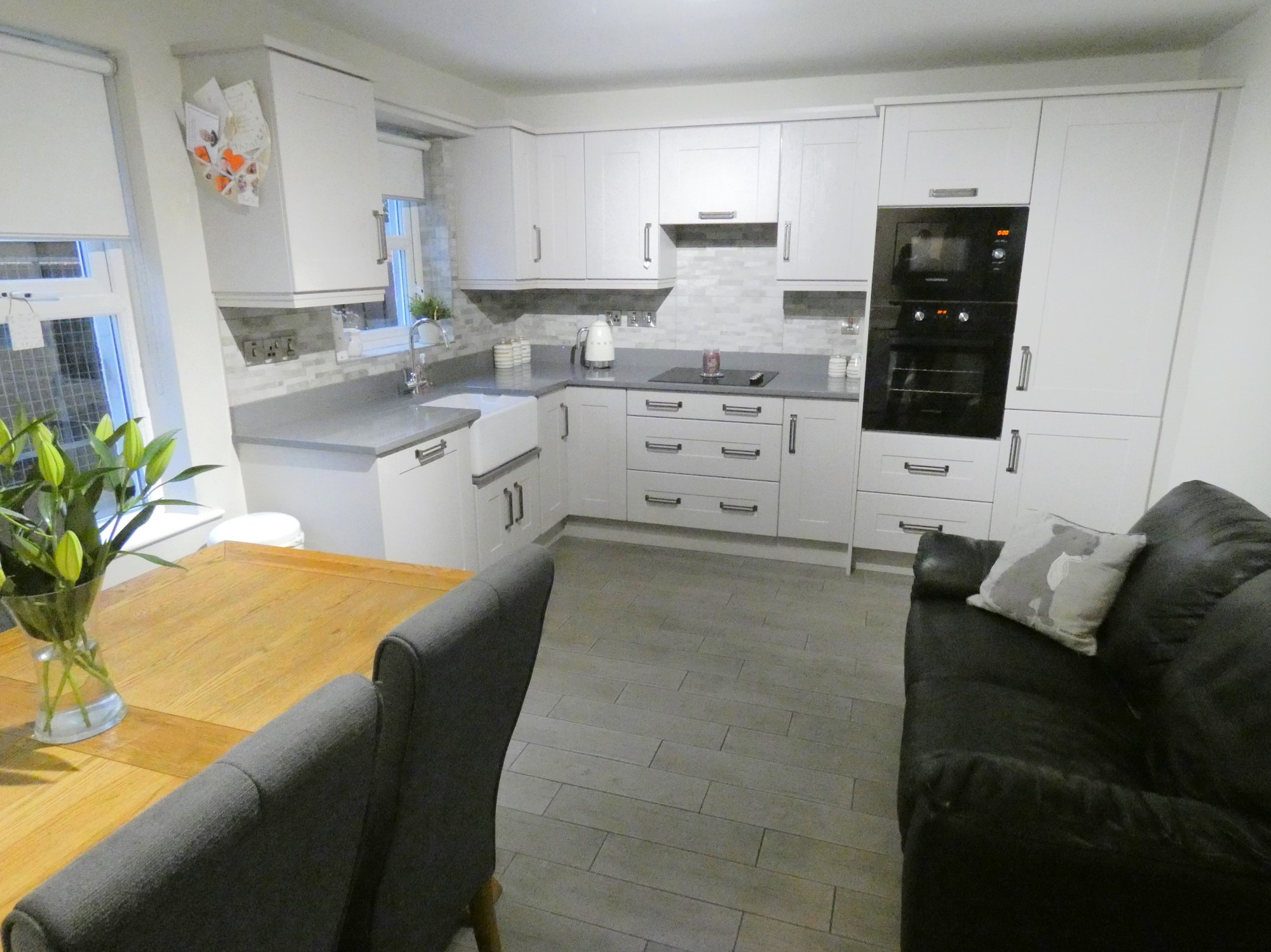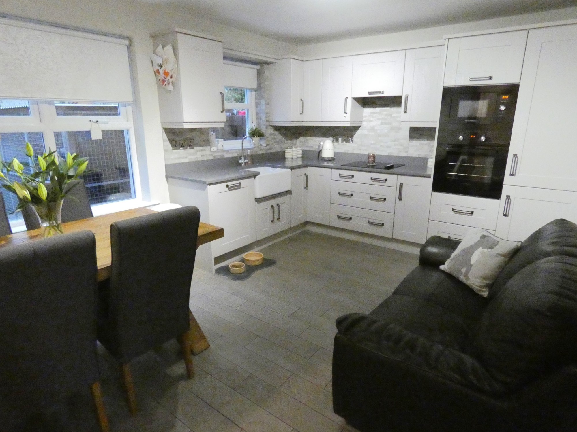 Contemporary kitchen with a range of fitted eye and low level units, Quartz worktops and upstand splashbacks with a Belfast style sink, tiled between the splashbacks and the eye level units, eye level oven and microwave, ceramic hob with an extractor canopy over, integrated fridge/freezer, integrated dishwasher, pan drawers, tiled floor, dining area overlooking the private rear garden and a door to the utility room.