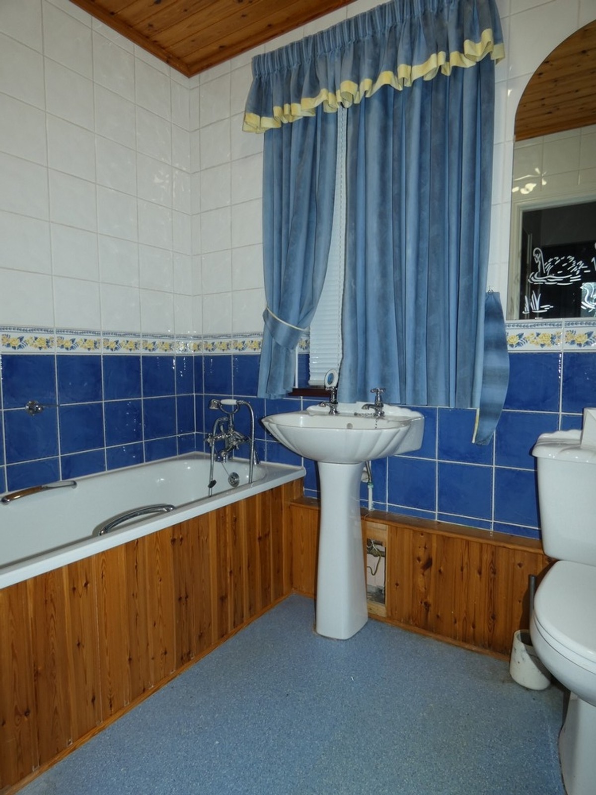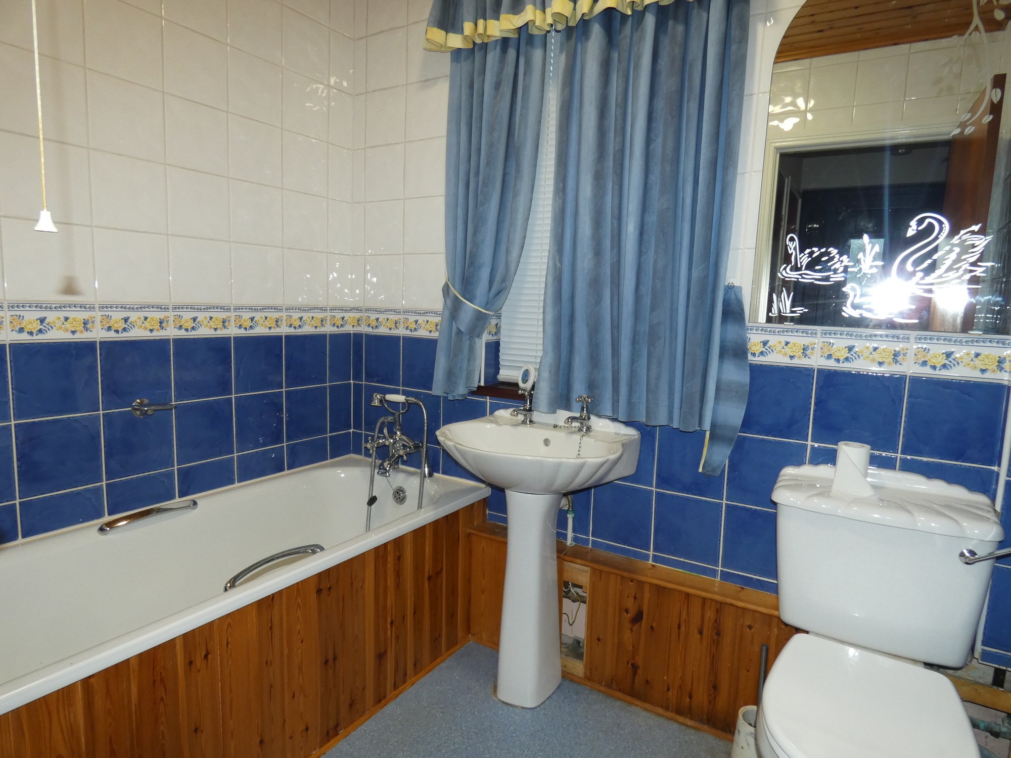 Fitted suite including a panel bath with a telephone hand shower attachment, w.c, pedestal wash hand basin and tiled walls.