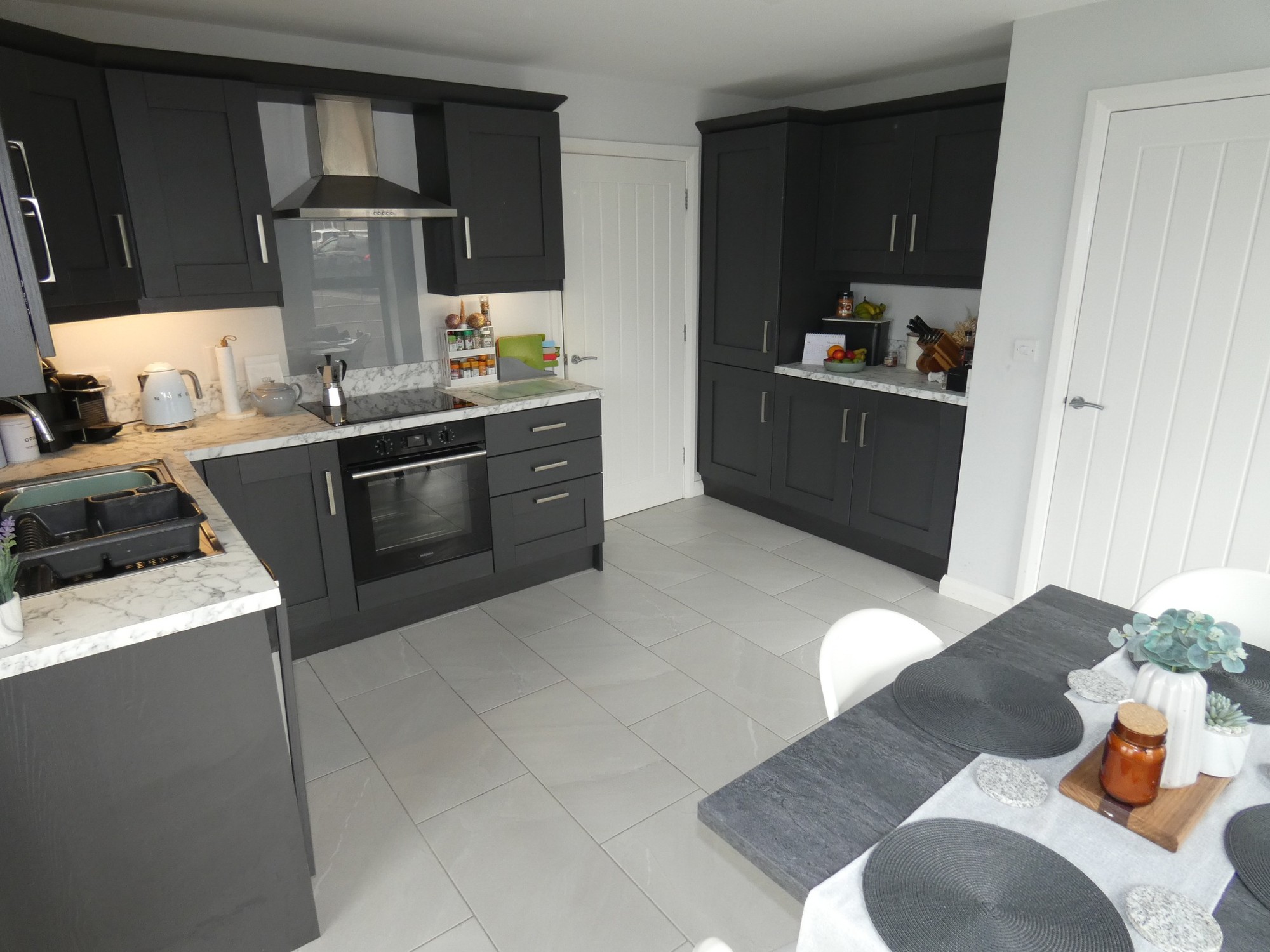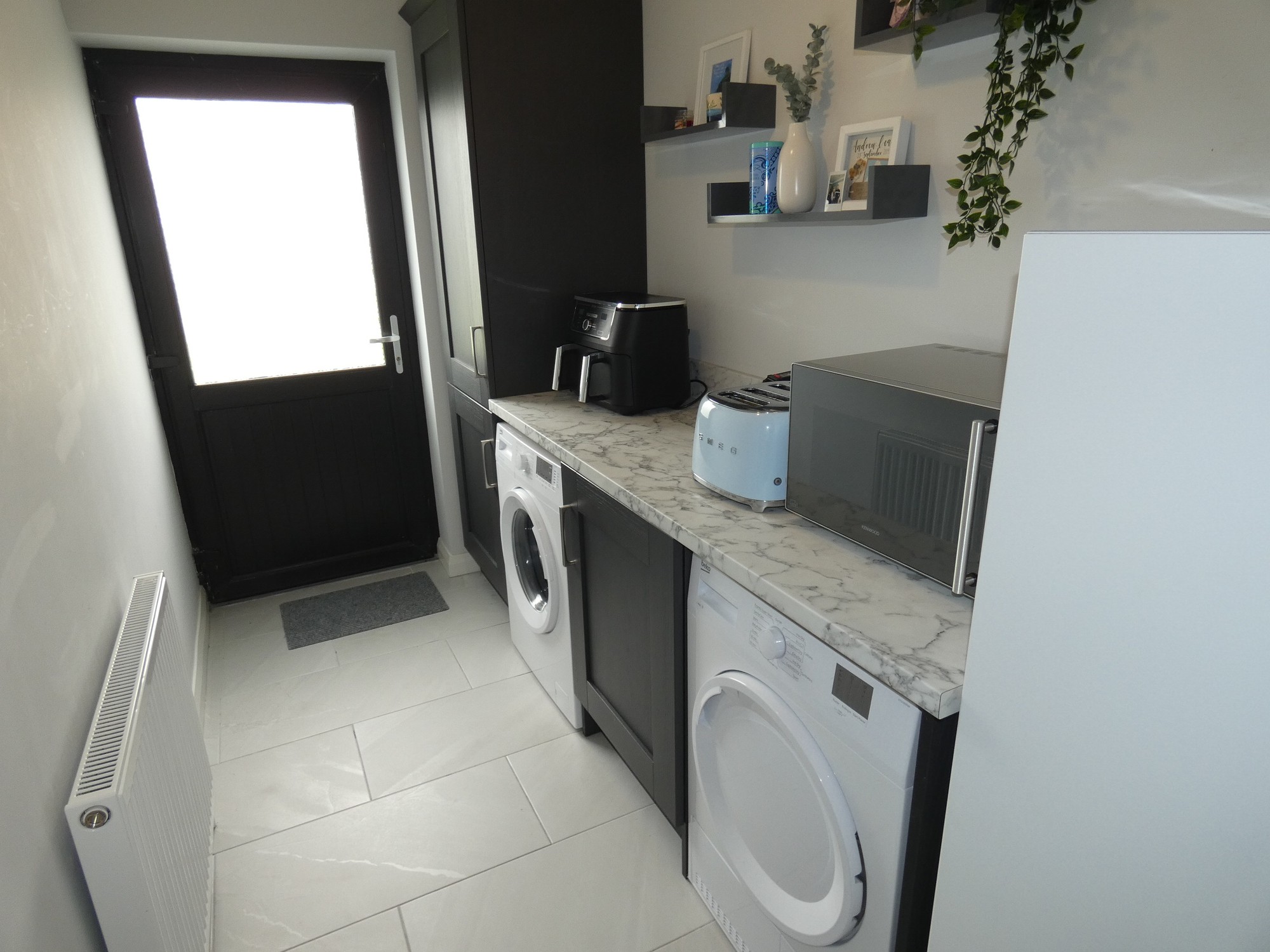 Contemporary units matching the kitchen and a granite effect worktop with a matching splashback, larder unit, plumbed for an automatic washing machine, space for a tumble dryer, tiled floor and a partly glazed door to the rear.