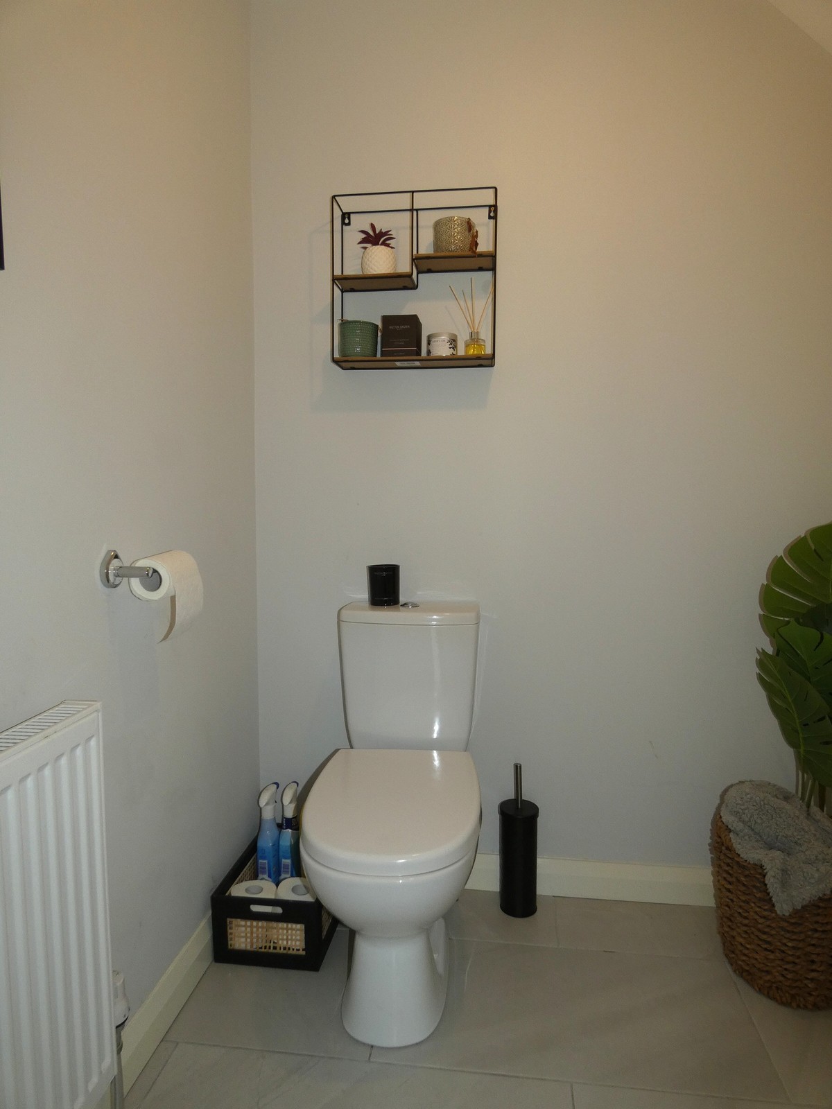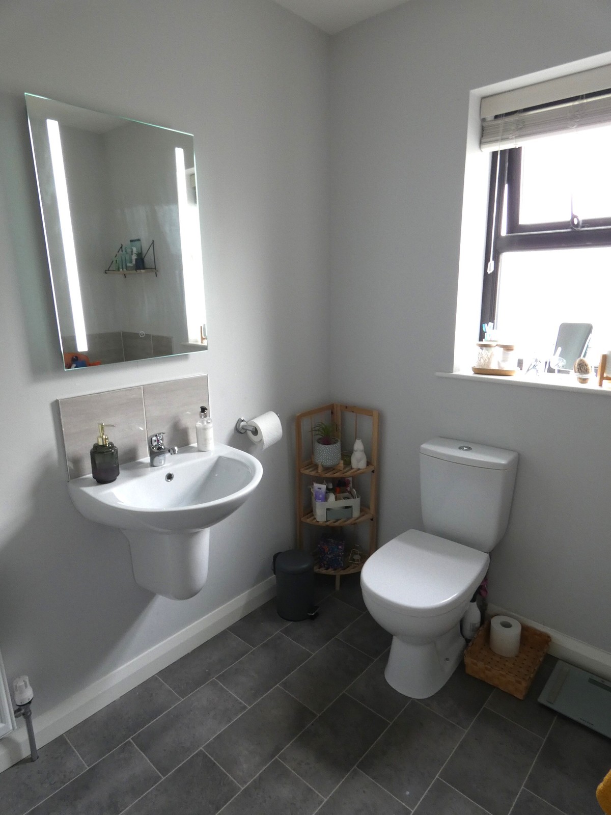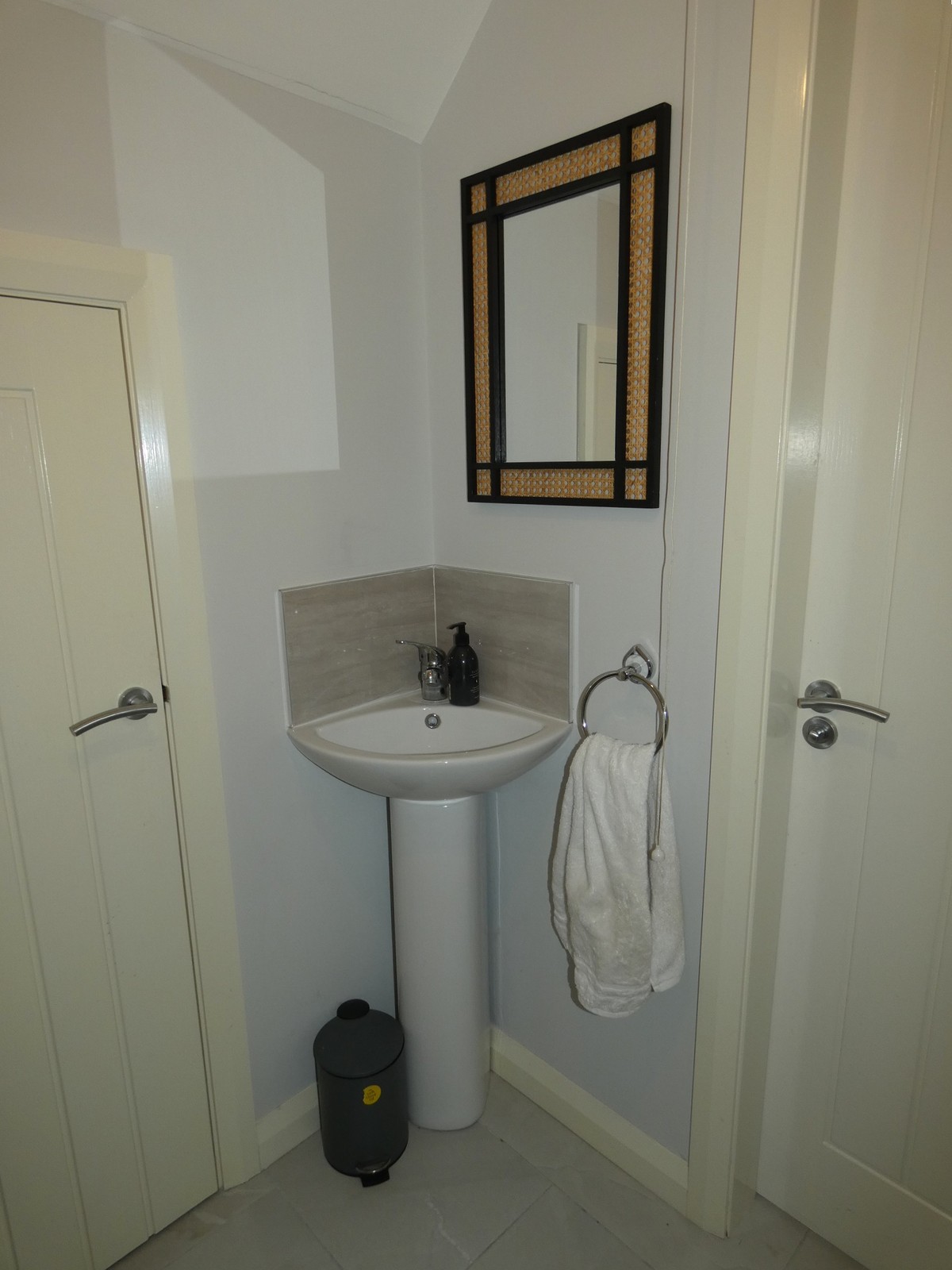 With a w.c, a corner pedestal wash hand basin with a tiled splashback; a tiled floor, extractor fan and a useful storage cupboard below the stairs.