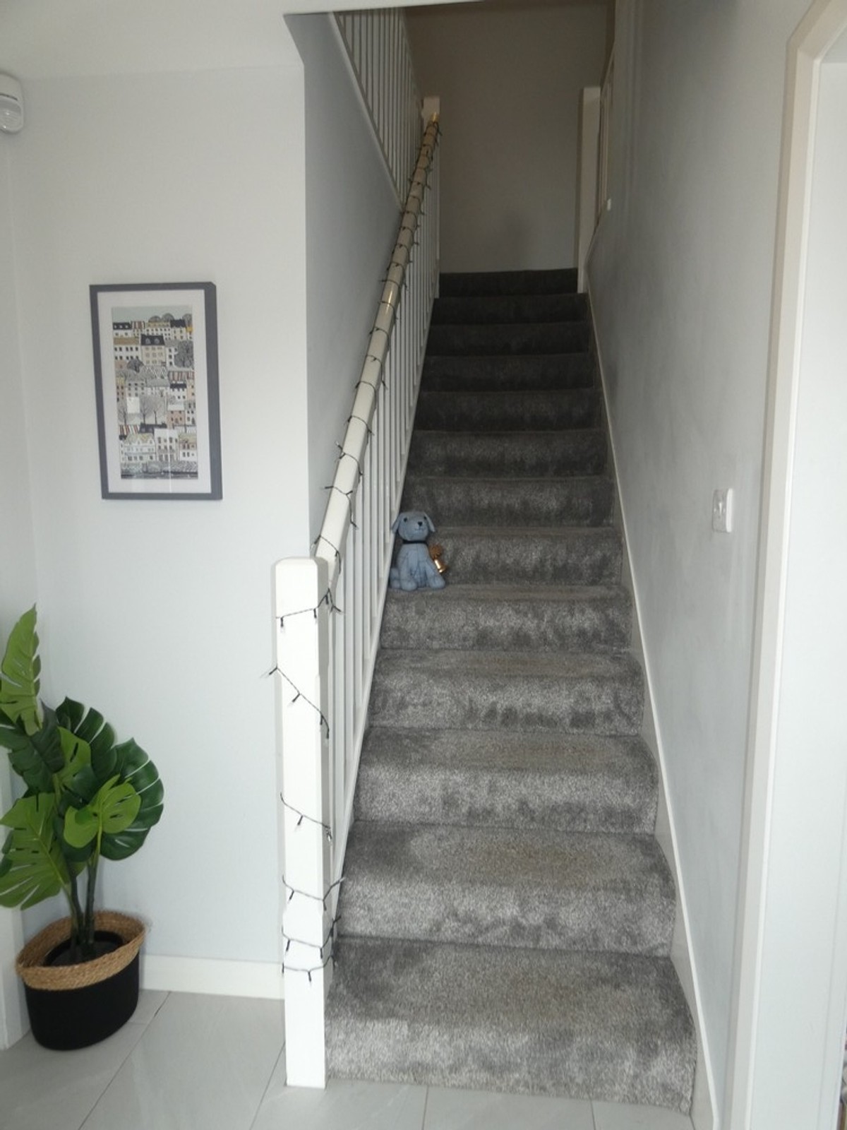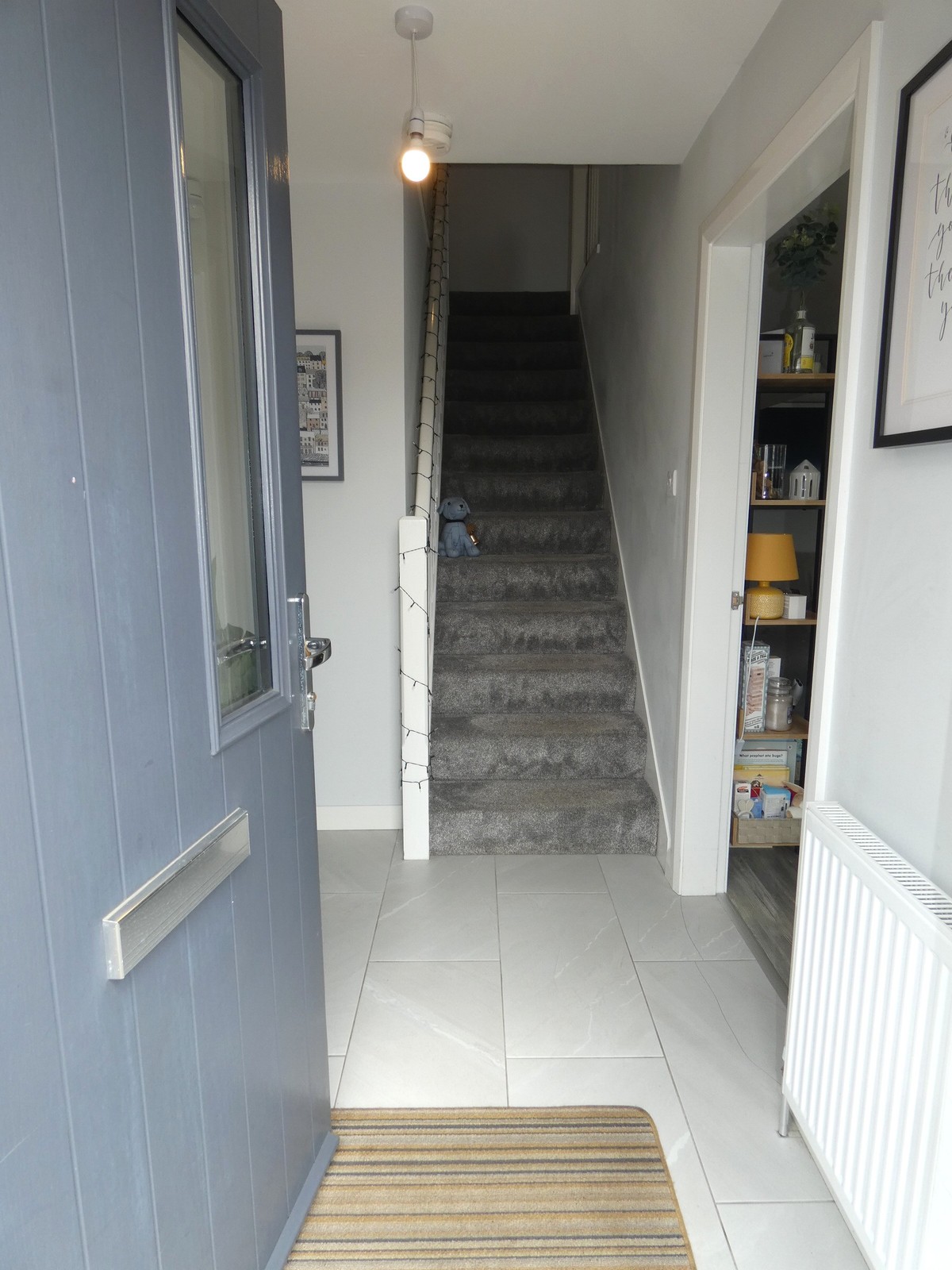 Quality partly glazed composite front door, attractive tiled flooring and stairs to the upper floor accommodation.