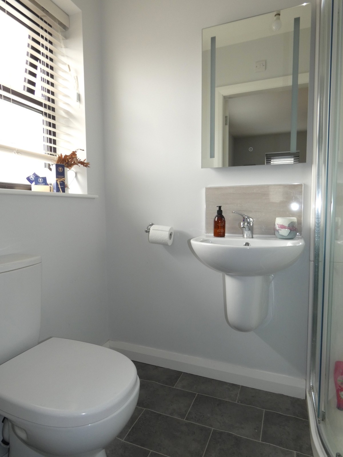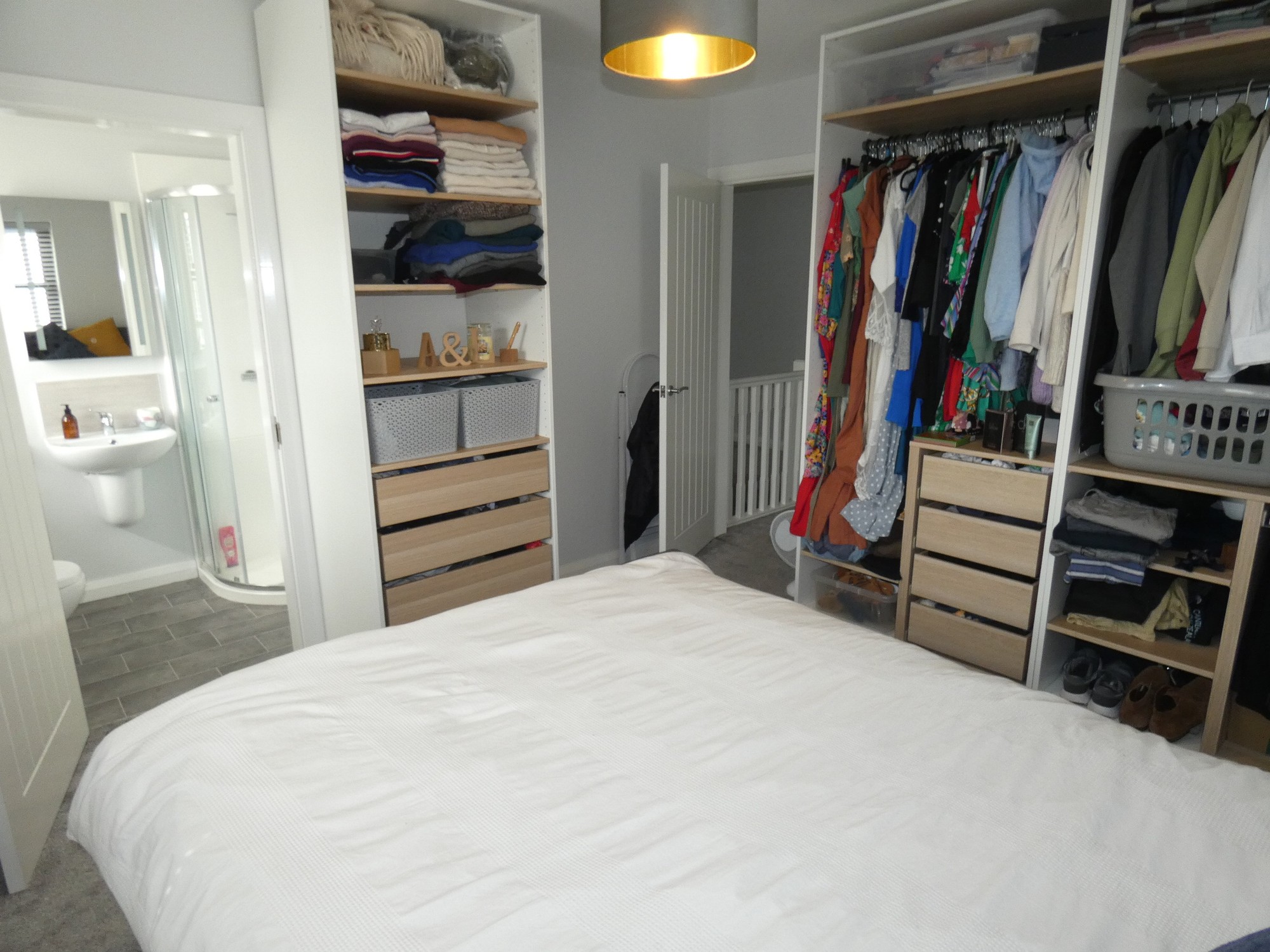 A super double aspect master bedroom with an Ensuite including a w.c, a wall mounted wash hand basin with a tiled splashback, extractor fan and a corner pod shower cubicle with a mains mixer shower.