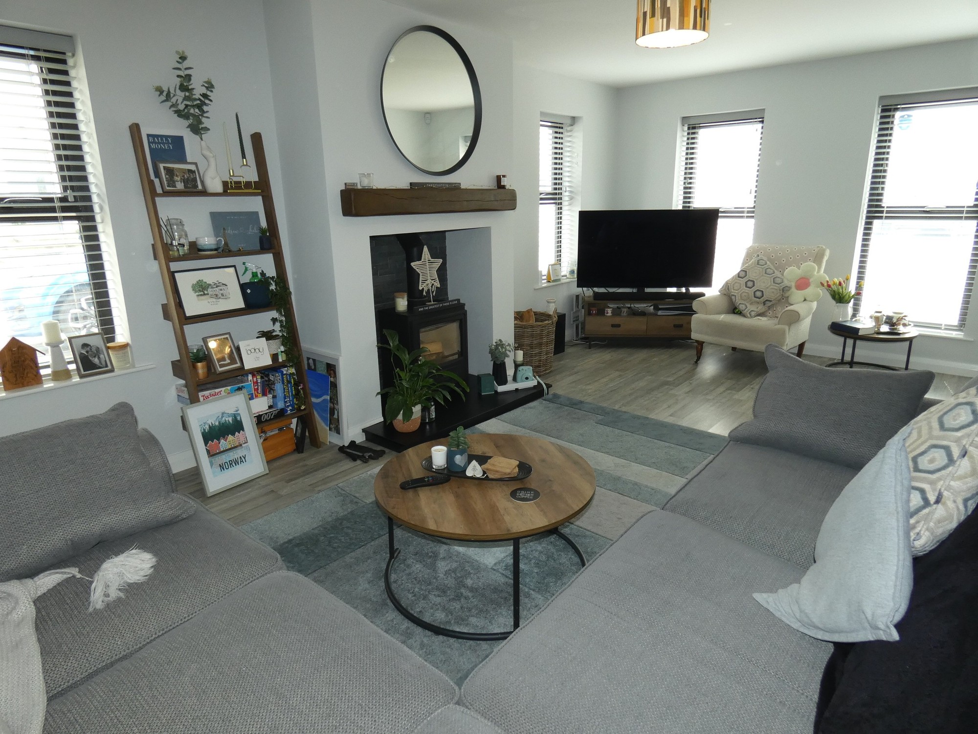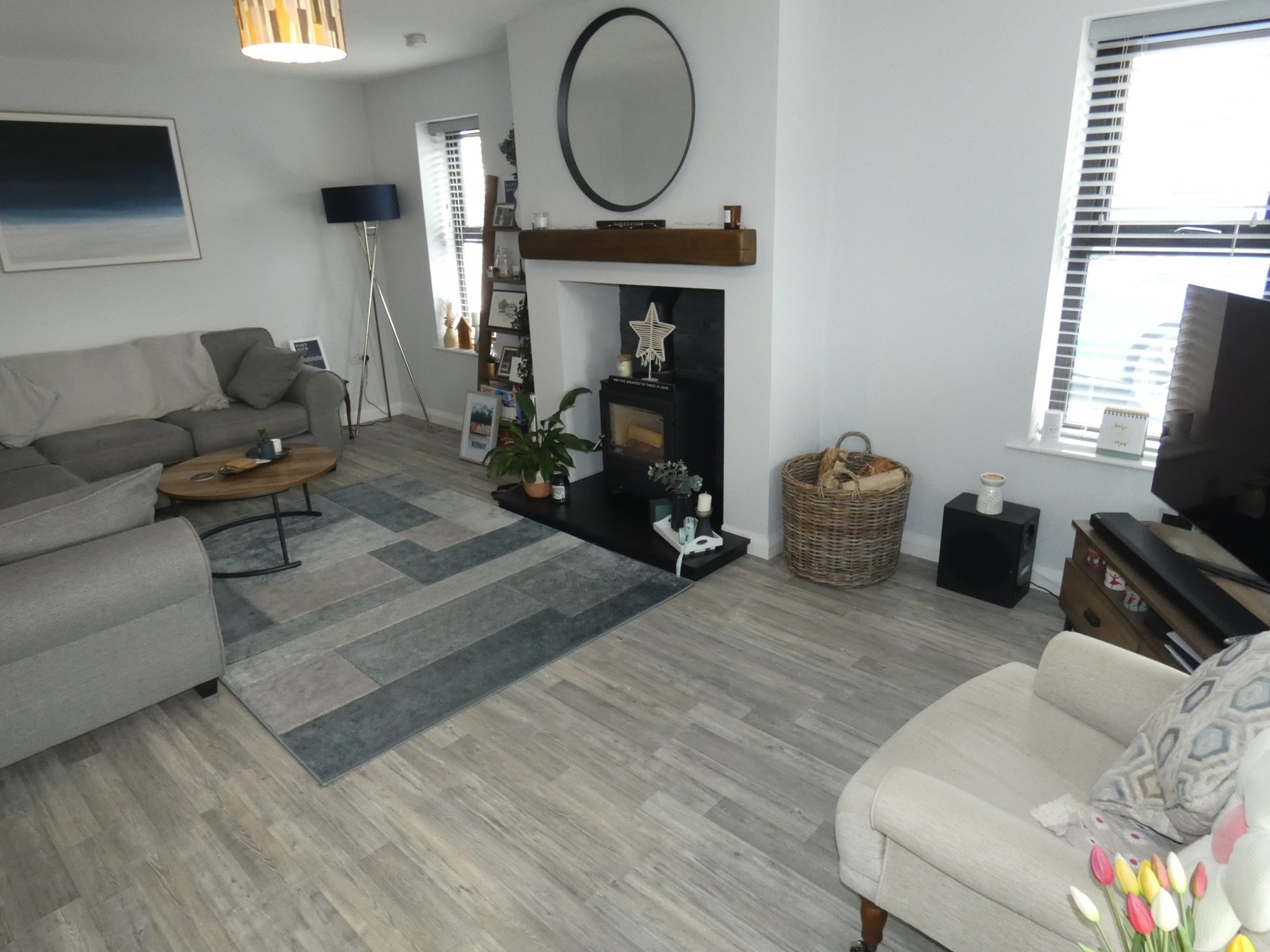 A super living room - triple aspect with 4 windows overlooking the avenue to the front, âHamletâ quality wood burning stove inset with a feature slate effect background with a tiled hearth, provision for a T.V. and attractive wooden flooring.