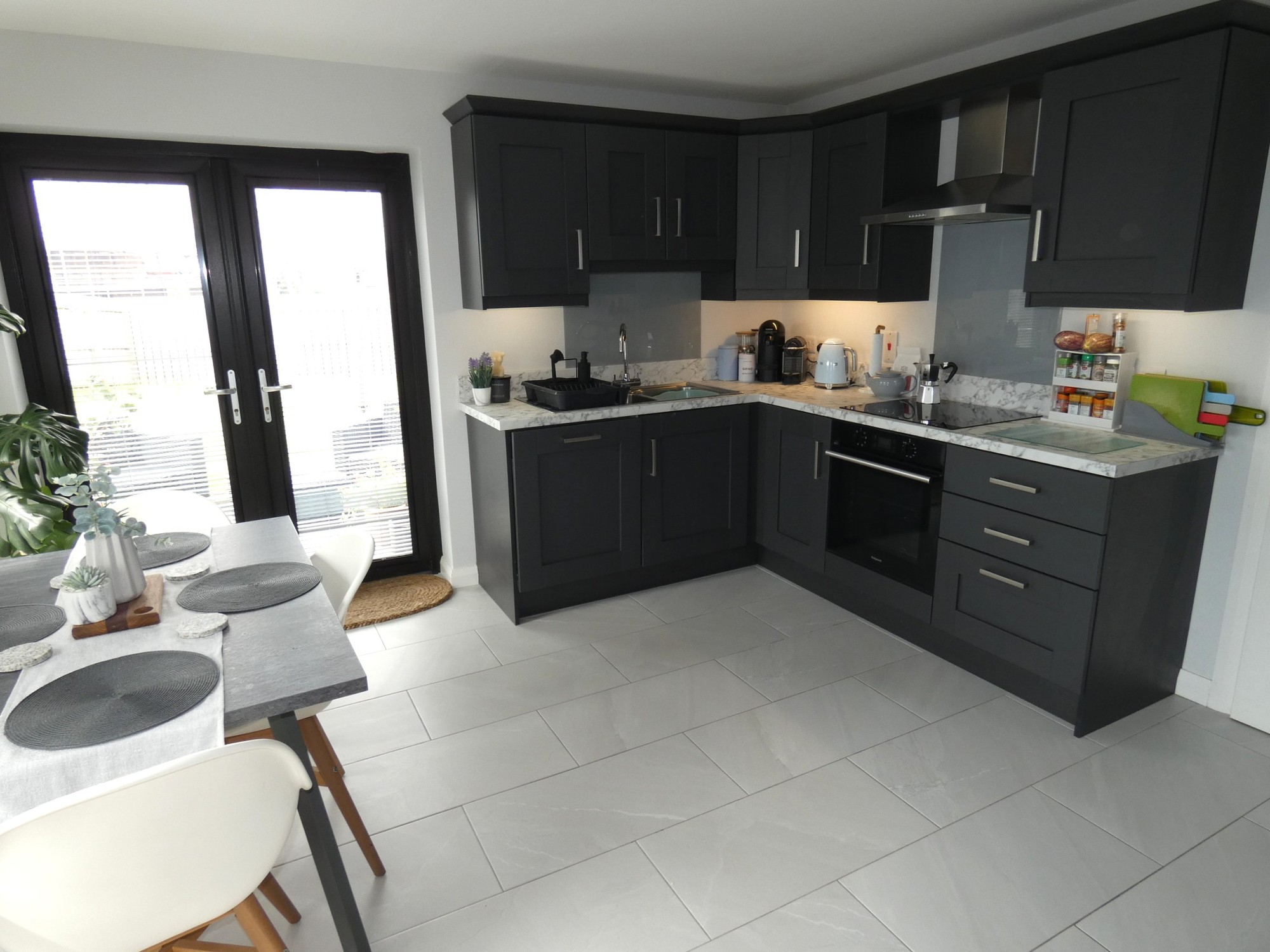 With a range of contemporary fitted eye and low level units, granite effect worktop with a matching upstand splashback, bowl and a half stainless steel sink, electric fan oven, induction ceramic hob with a splashback and a stainless steel extractor fan over, integrated fridge/freezer, integrated dishwasher, contemporary wall mounted radiator, attractive tiled flooring and french doors to the rear garden.