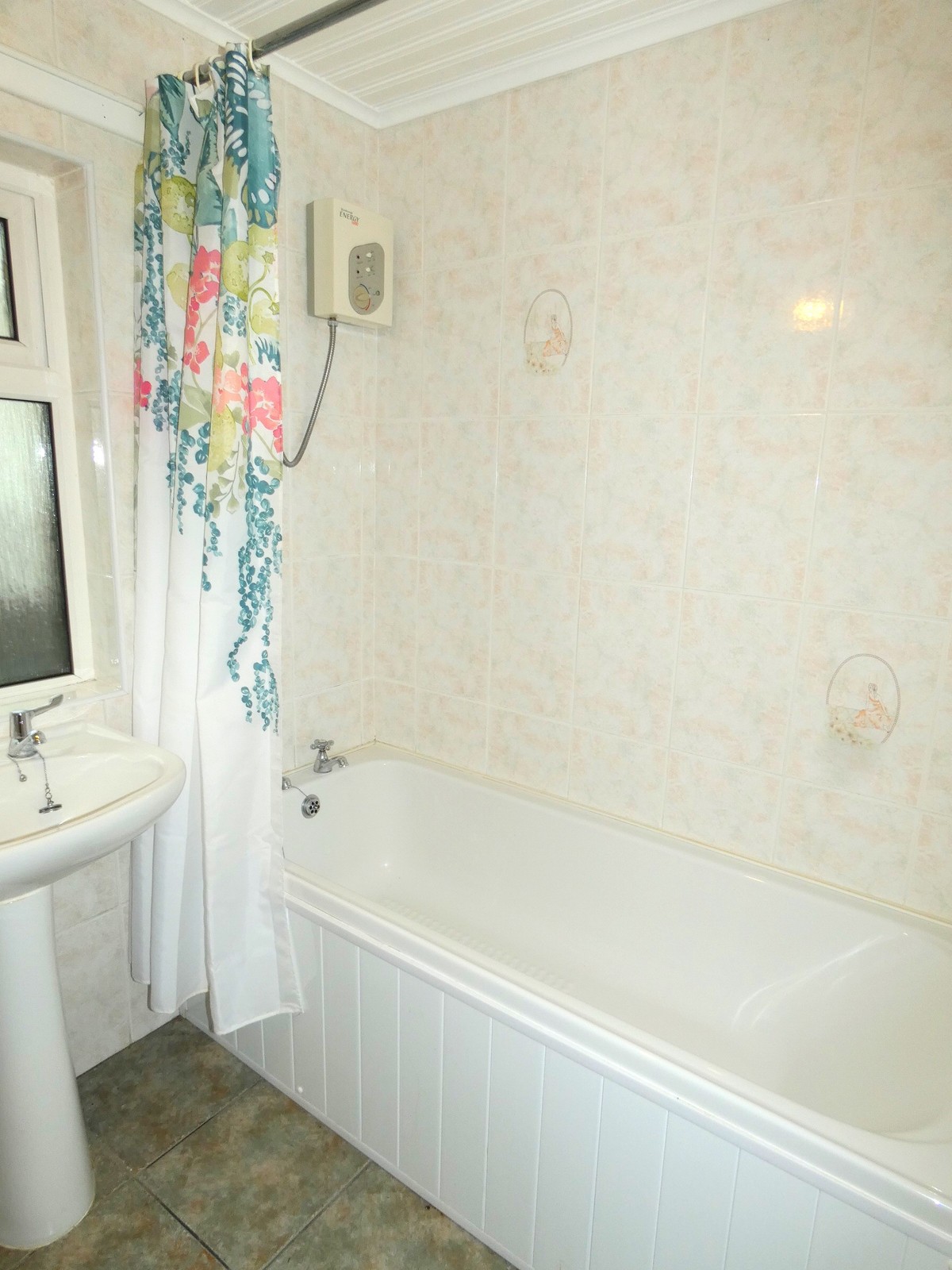 Fitted suite including a pedestal wash hand basin, a w.c, tiled floor, tiled walls, a painted wood sheeted ceiling and a panel bath with an electric shower over.
