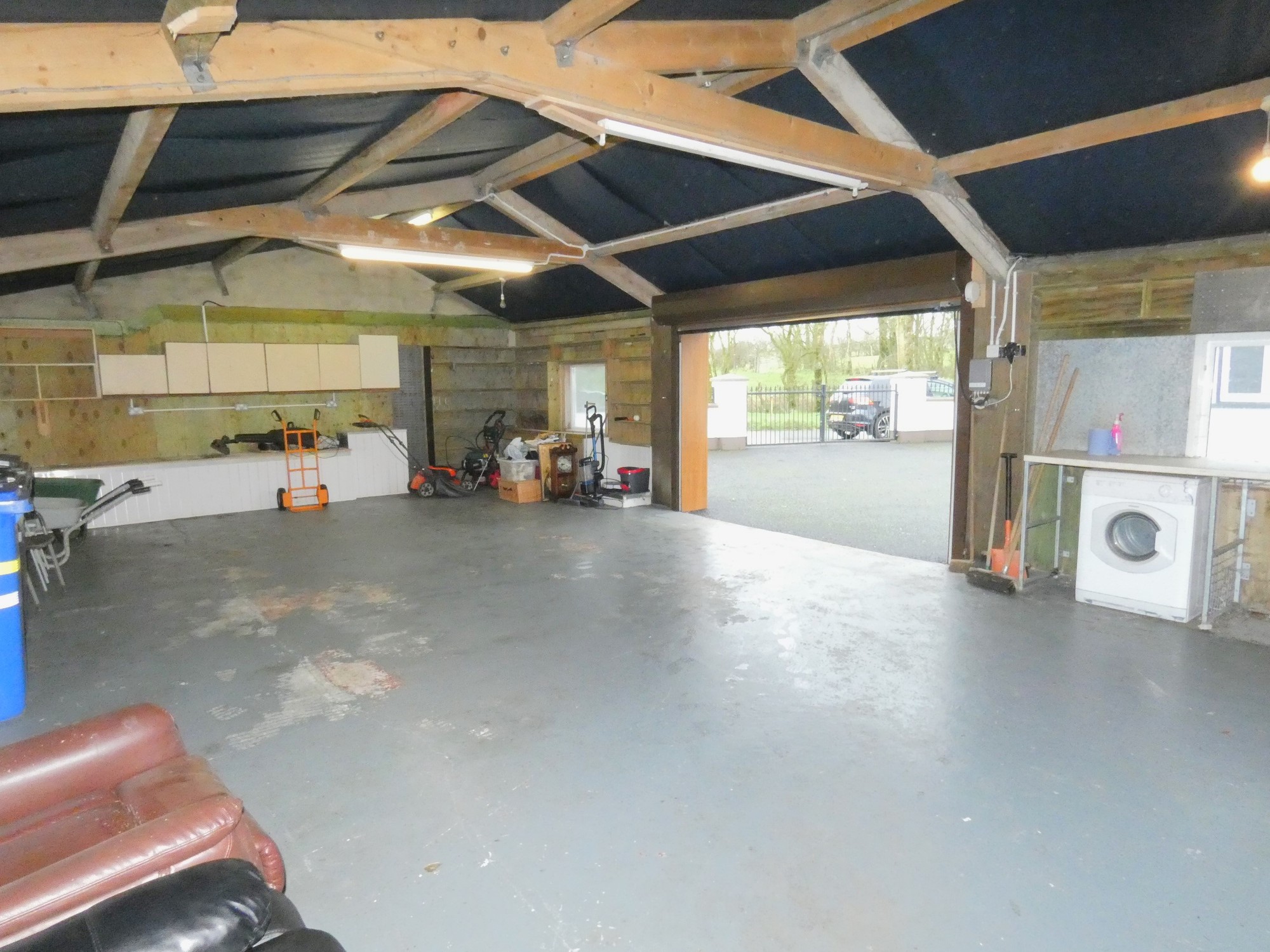 With a pedestrian access door, strip lights, numerous power points, separate w.c, a shower cubicle with an electric shower and open to the garage.