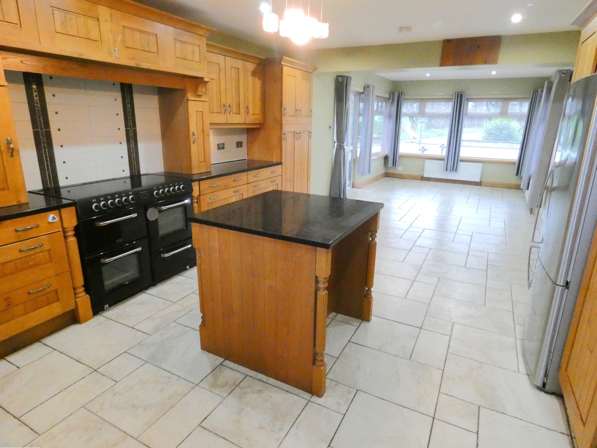 With an extensive range of fitted eye and low level units, granite worktops, inset bowl and a half stainless steel sink, âBellingâ range type cooker (2 ovens, ceramic top with 6 rings, (and a warming drawer) with a beam mantle type surround over and an extractor fan, integrated dishwasher, larder cupboard, numerous pan drawers, space for a fridge/freezer, island unit/breakfast bar with pan drawers, recessed ceiling spotlights, tiled floor and a partly glazed upvc door to the rear.