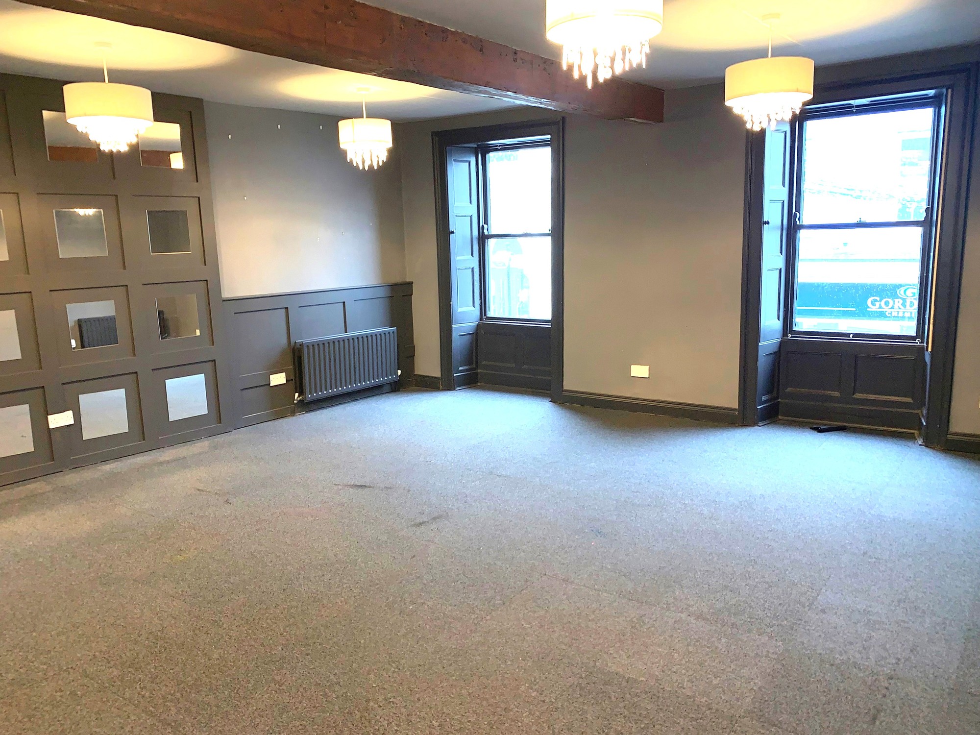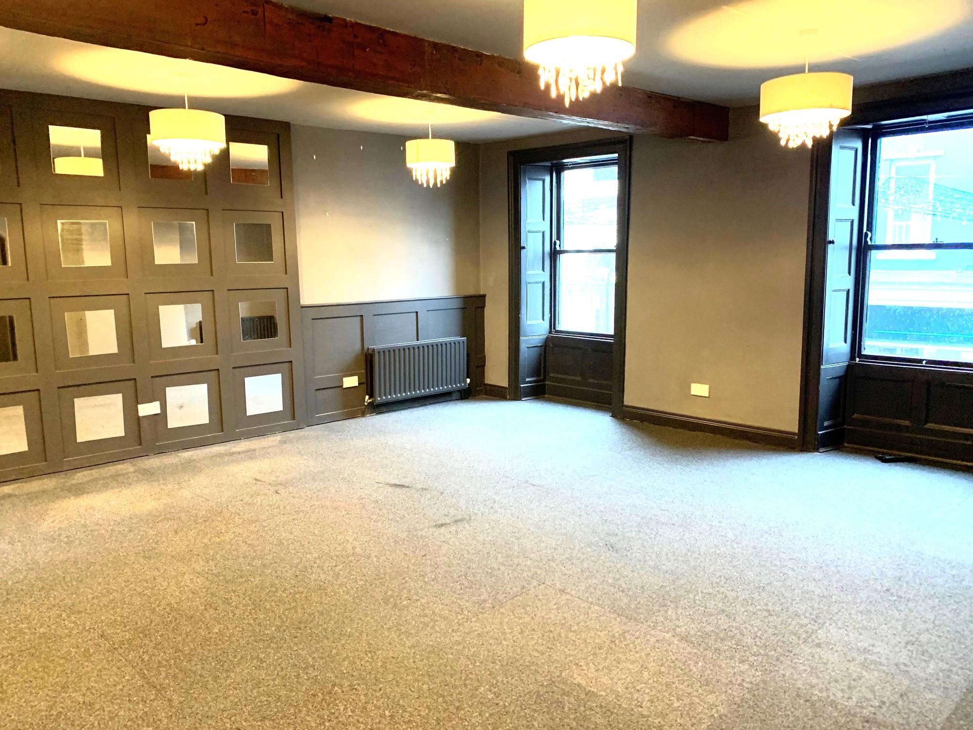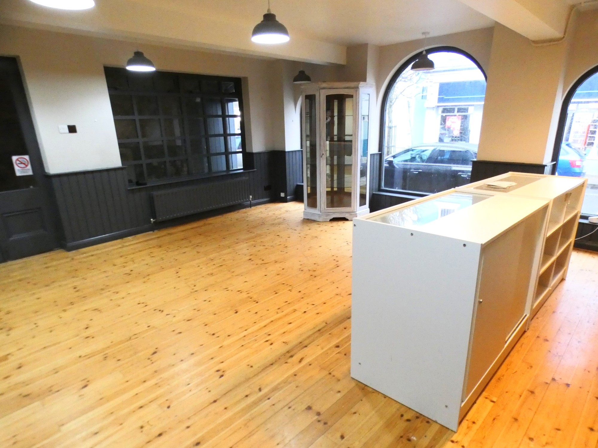 Feature arched glass windows to the front, feature solid wood flooring, partly panelled walls, numerous lights, stairs to the upper floor accommodation and a separate cloakroom.