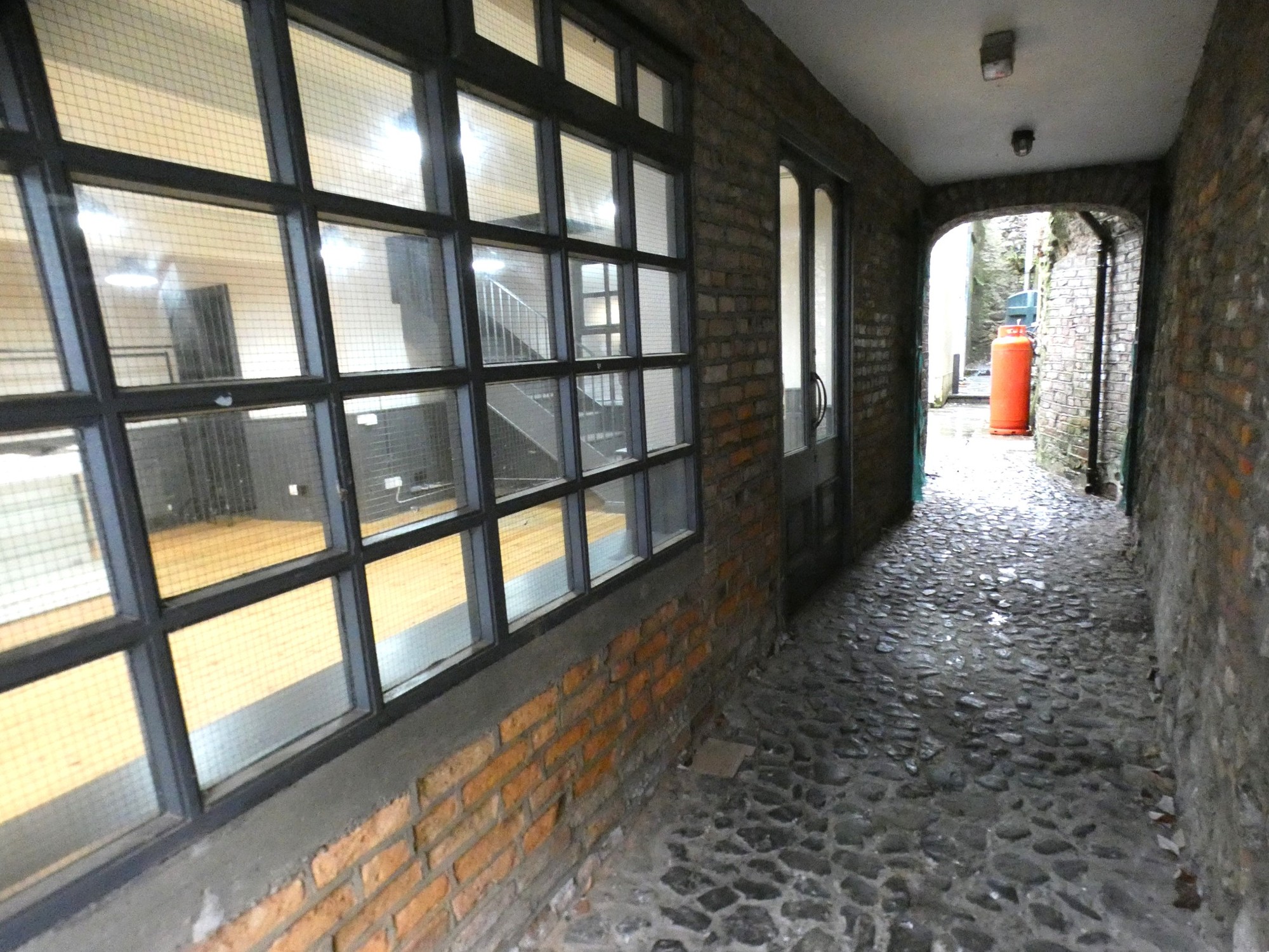 Feature entrance with a cobbled path to double doors into the main shop.