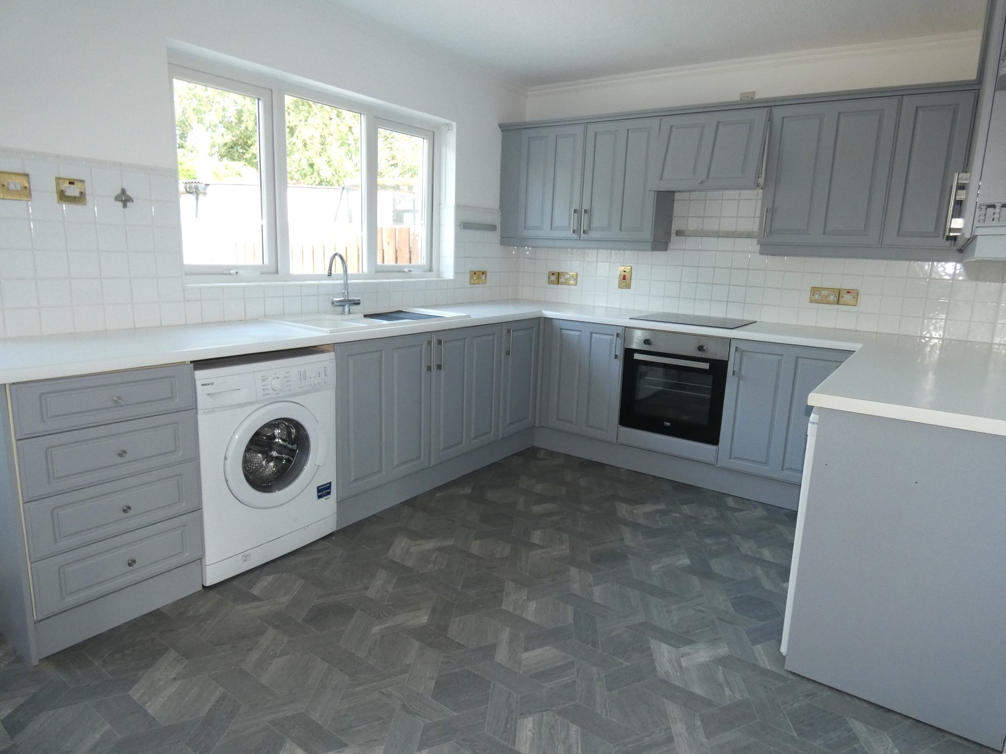 With a good range of painted eye and low level units, tiled between the worktop and the eye level units, contemporary bowl and a half sink unit with a mixer tap, Zanussi touch control ceramic hob, Beko electric oven, extractor canopy, glass display units, drawer pack, plumbed for an automatic washing machine, space for a fridge and a partly glazed door to the private rear garden area.