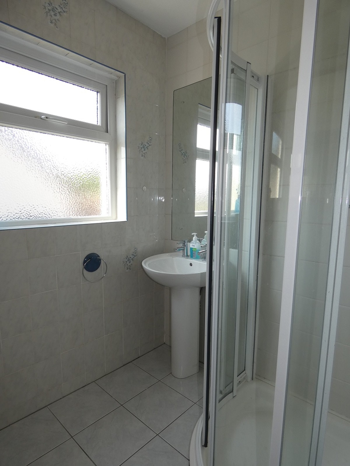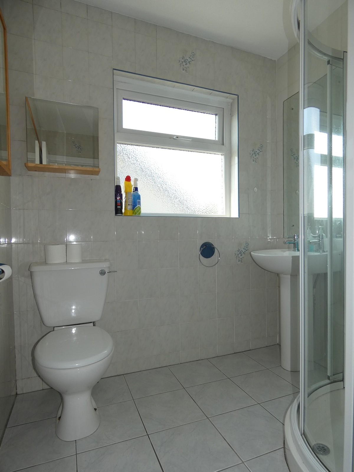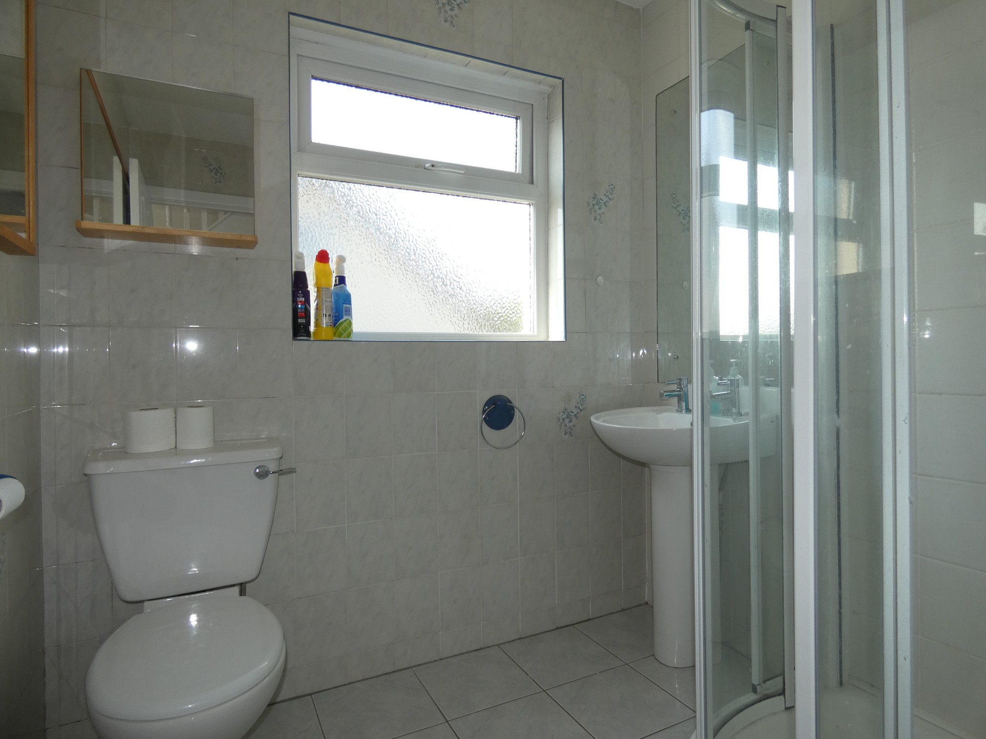 With a w.c. pedestal wash hand basin, tiled walls, tiled floor, fitted mirror and a spacious tiled shower cubicle with a mixer shower and a glazed corner surround.