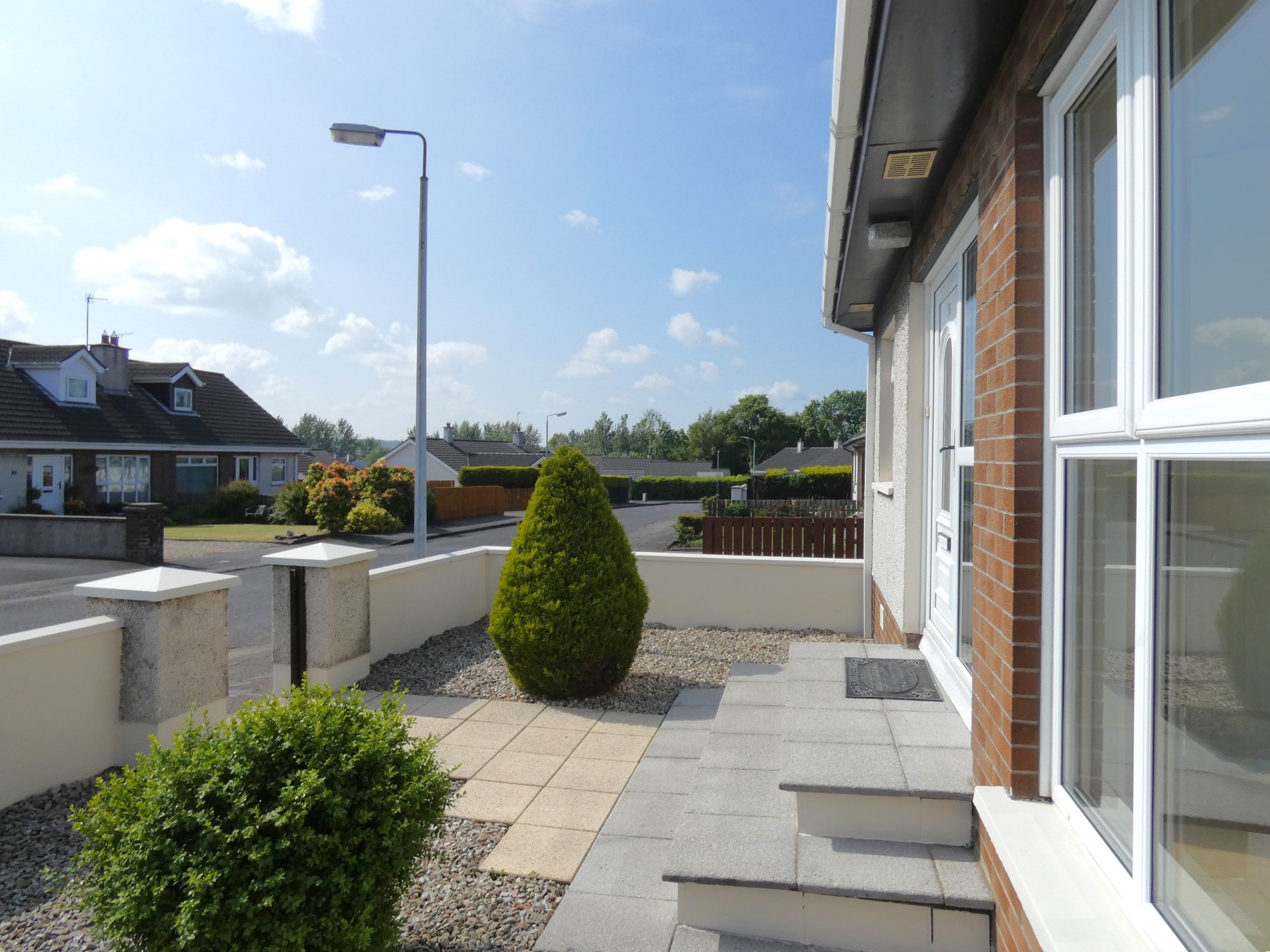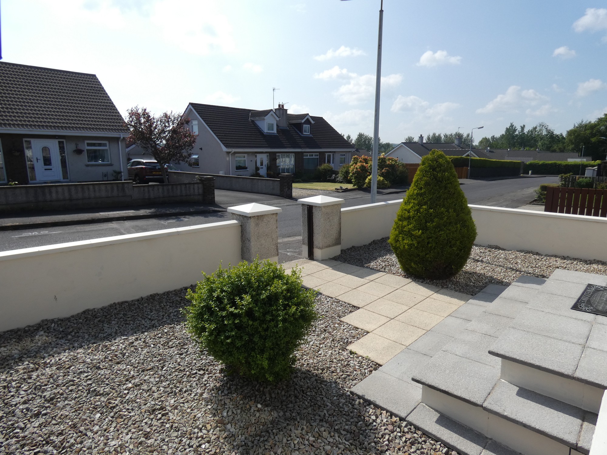 Landscaped front garden area in colour stones with shrubs and a painted low level wall boundary.