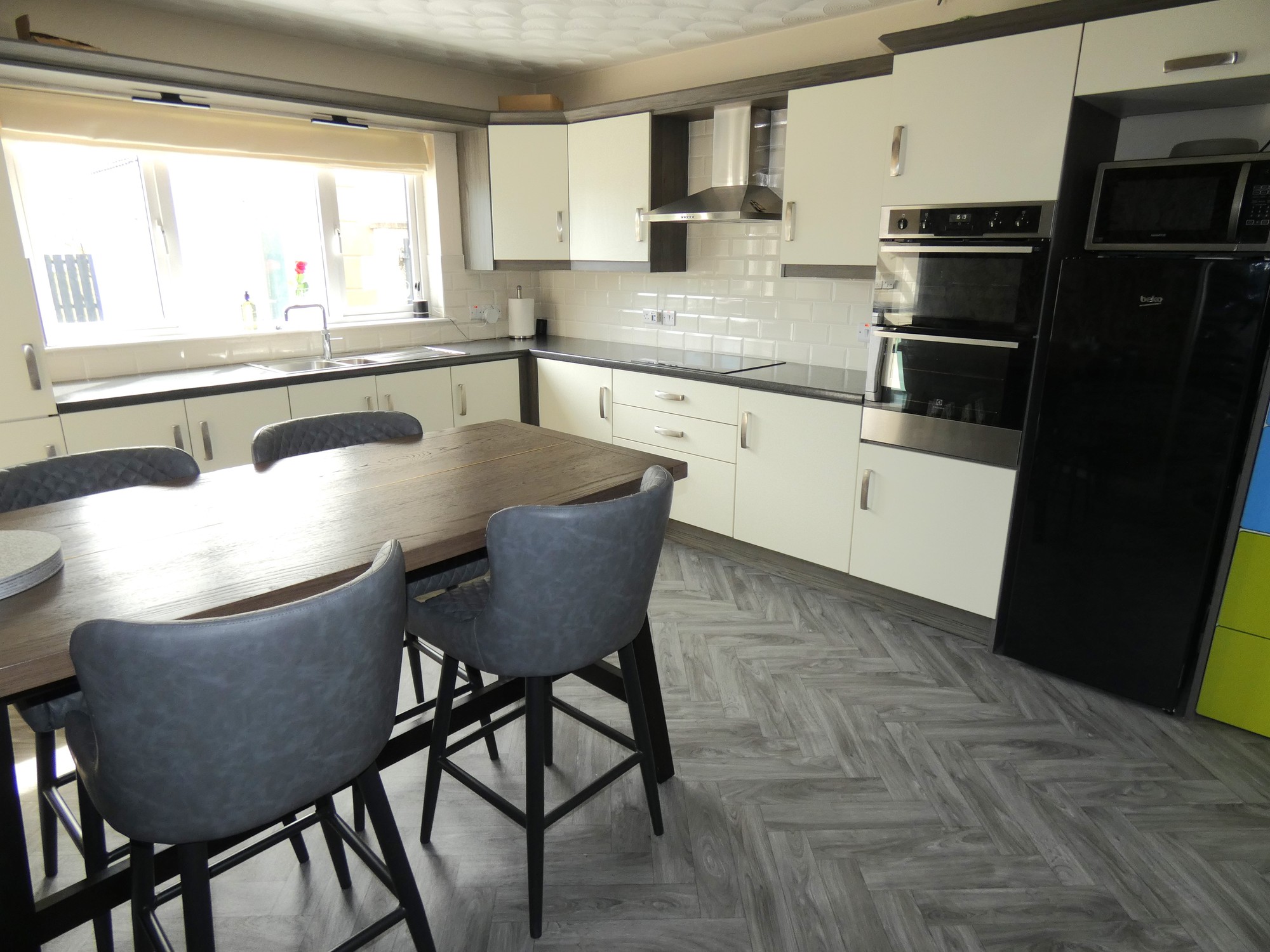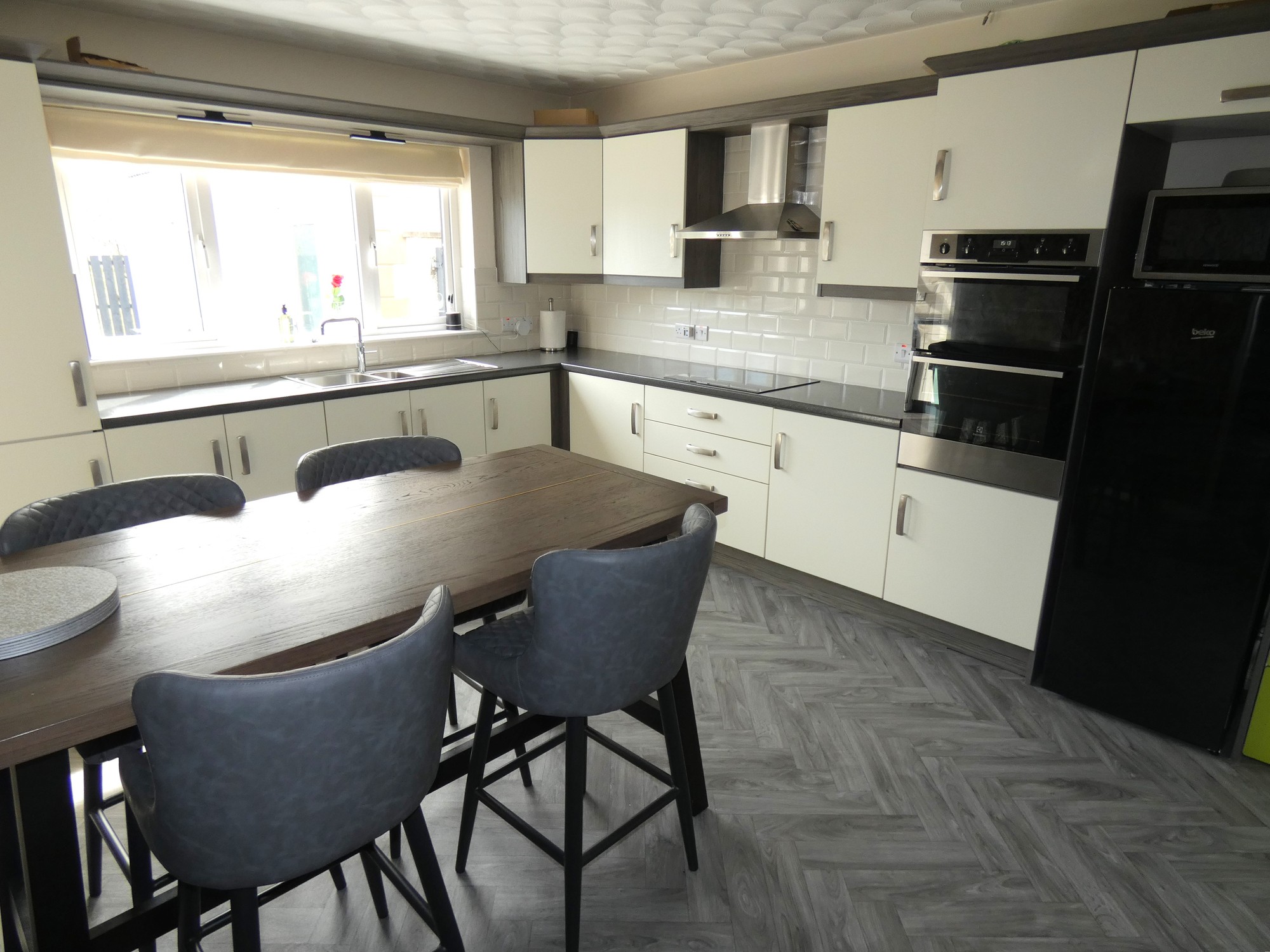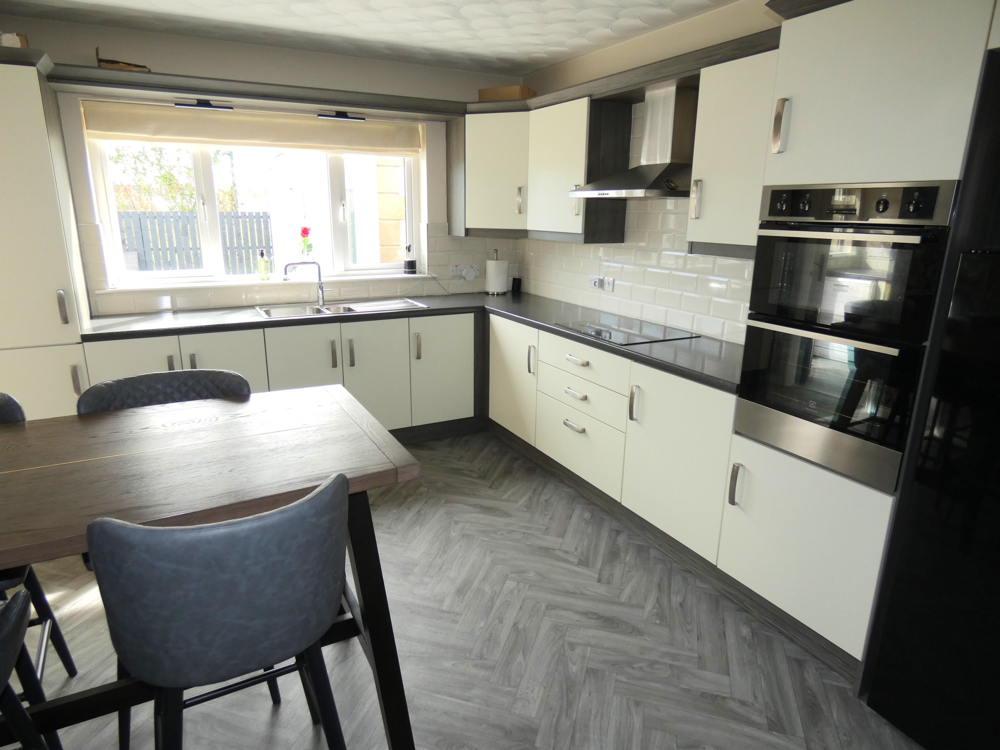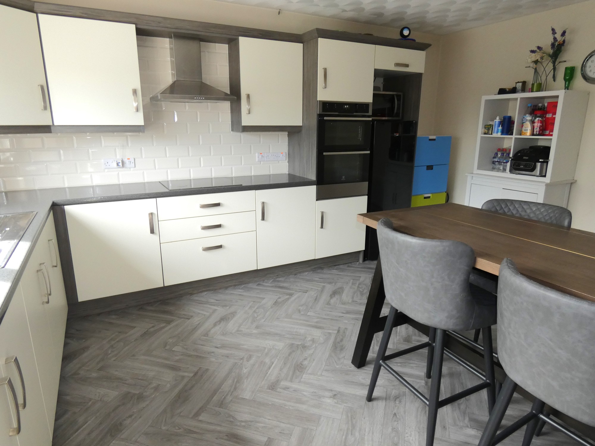 With an extensive range of fitted eye and low level contemporary units, bowl and a half stainless steel sink with a mixer tap, tiled between the worktops and the eye level units, ceramic induction hob with a stainless steel extractor canopy over, tall integrated freezer, eye level double oven, space for an upright fridge/freezer, window pelmet and a door to the utility room.