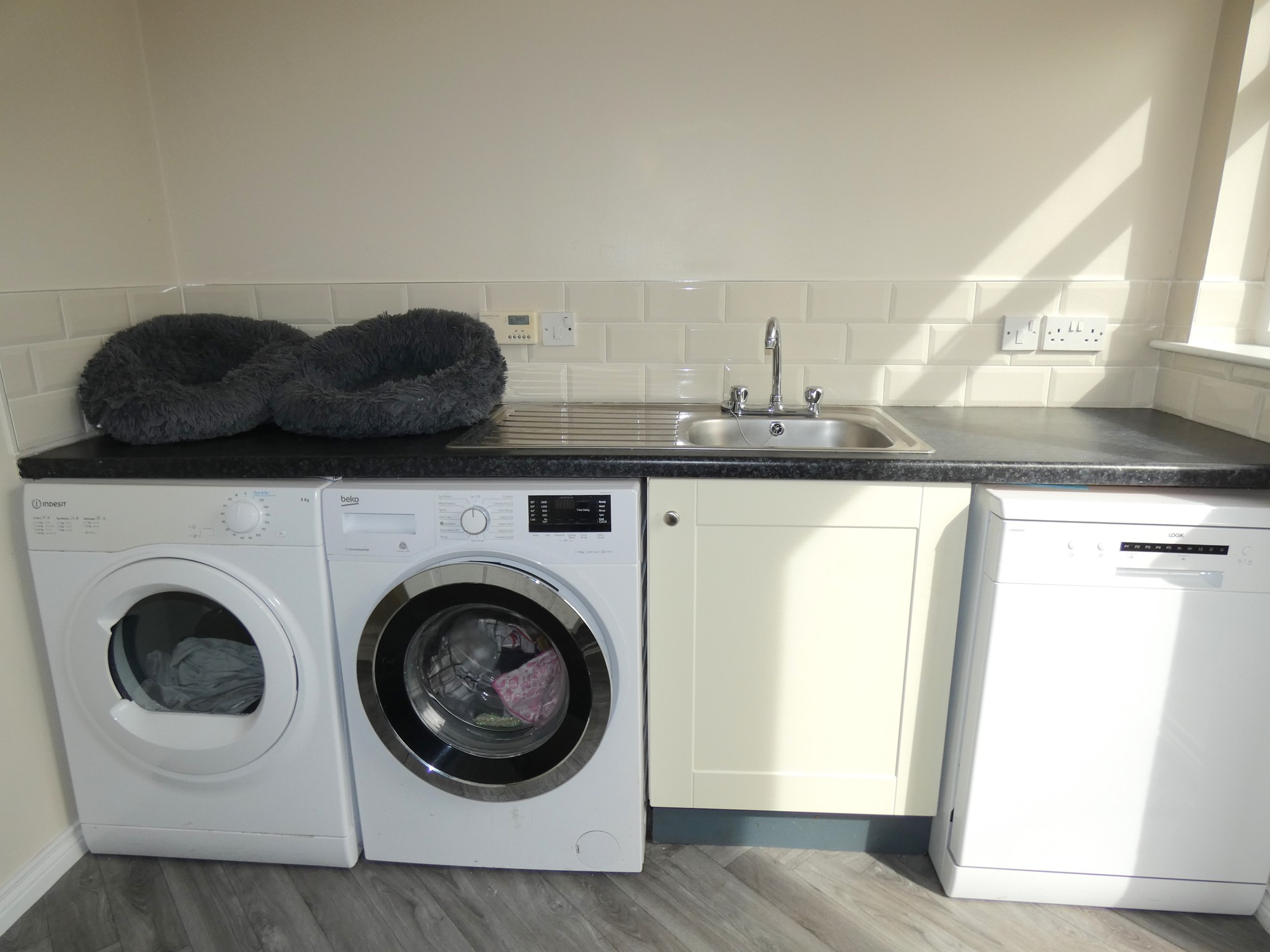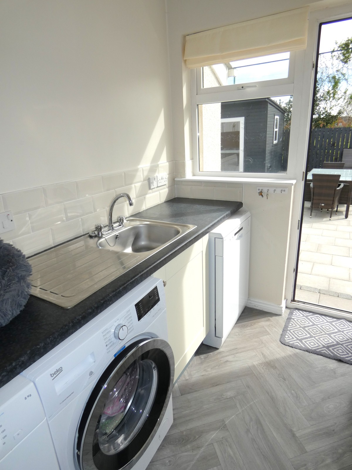 Fitted low level unit and a stainless steel sink, tiled splashback around the worktop, plumbed for an automatic washing machine, space for a tumble dryer, plumbed for a dishwasher and a partly glazed door to the rear.