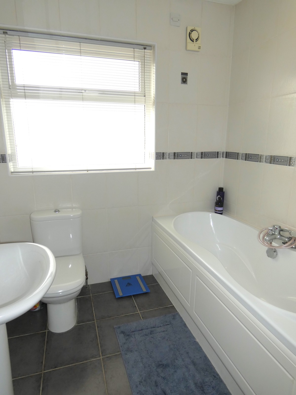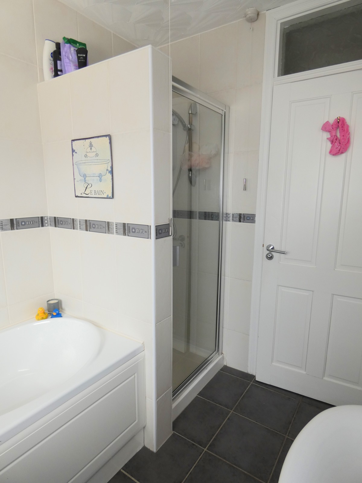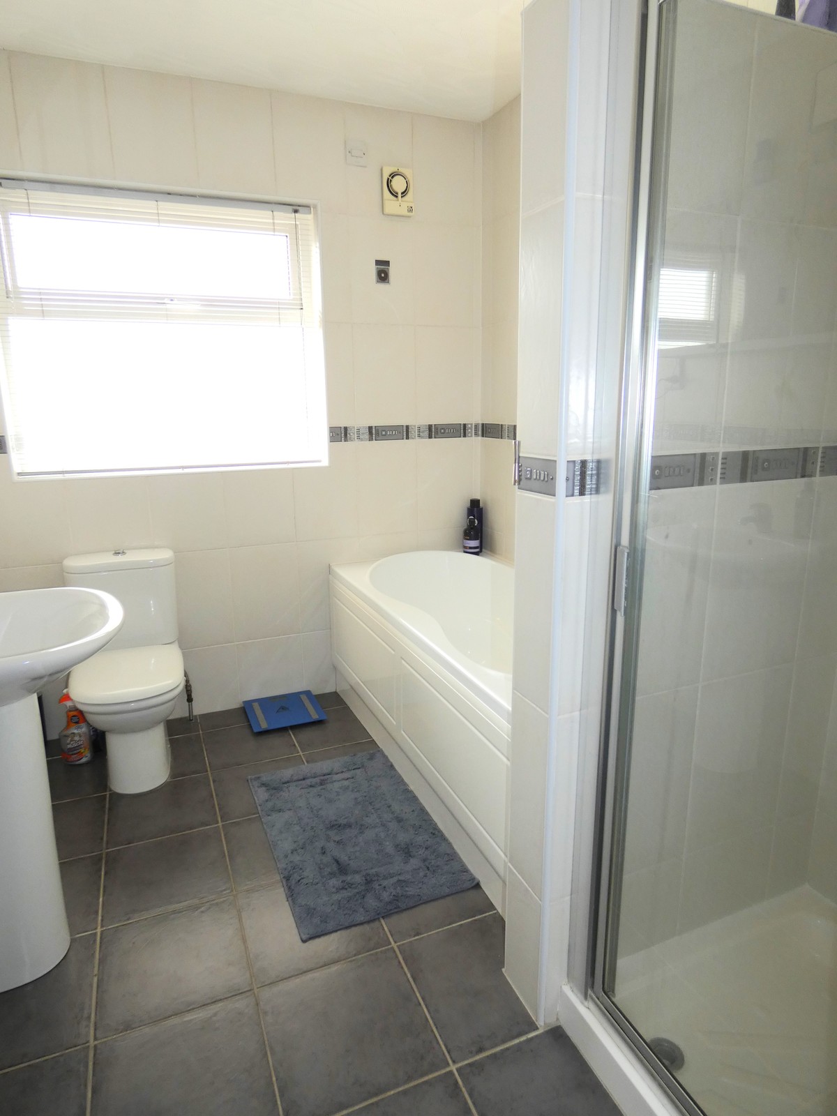 A super family bathroom including a pedestal wash hand basin, a w.c, shaver point, tiled walls, tiled floor, extractor fan, a panel bath with a mixer tap and a tiled shower cubicle with a Redring electric shower.