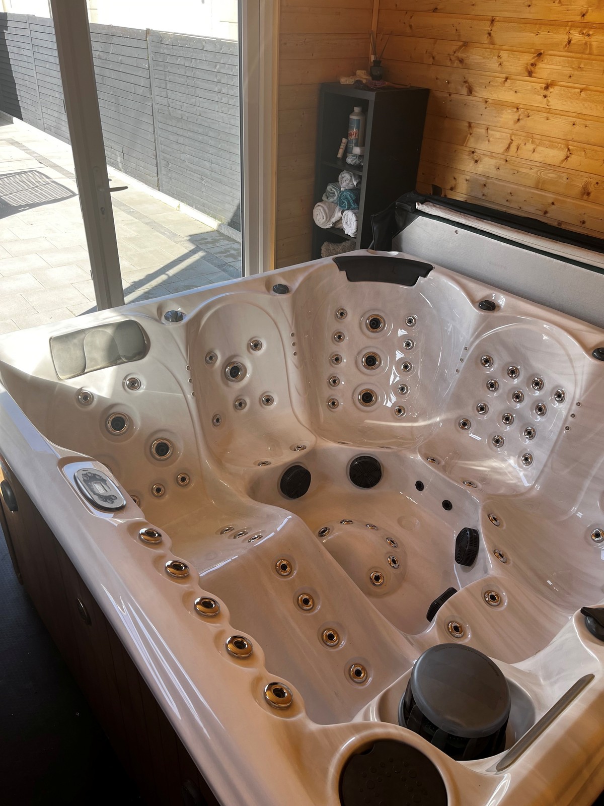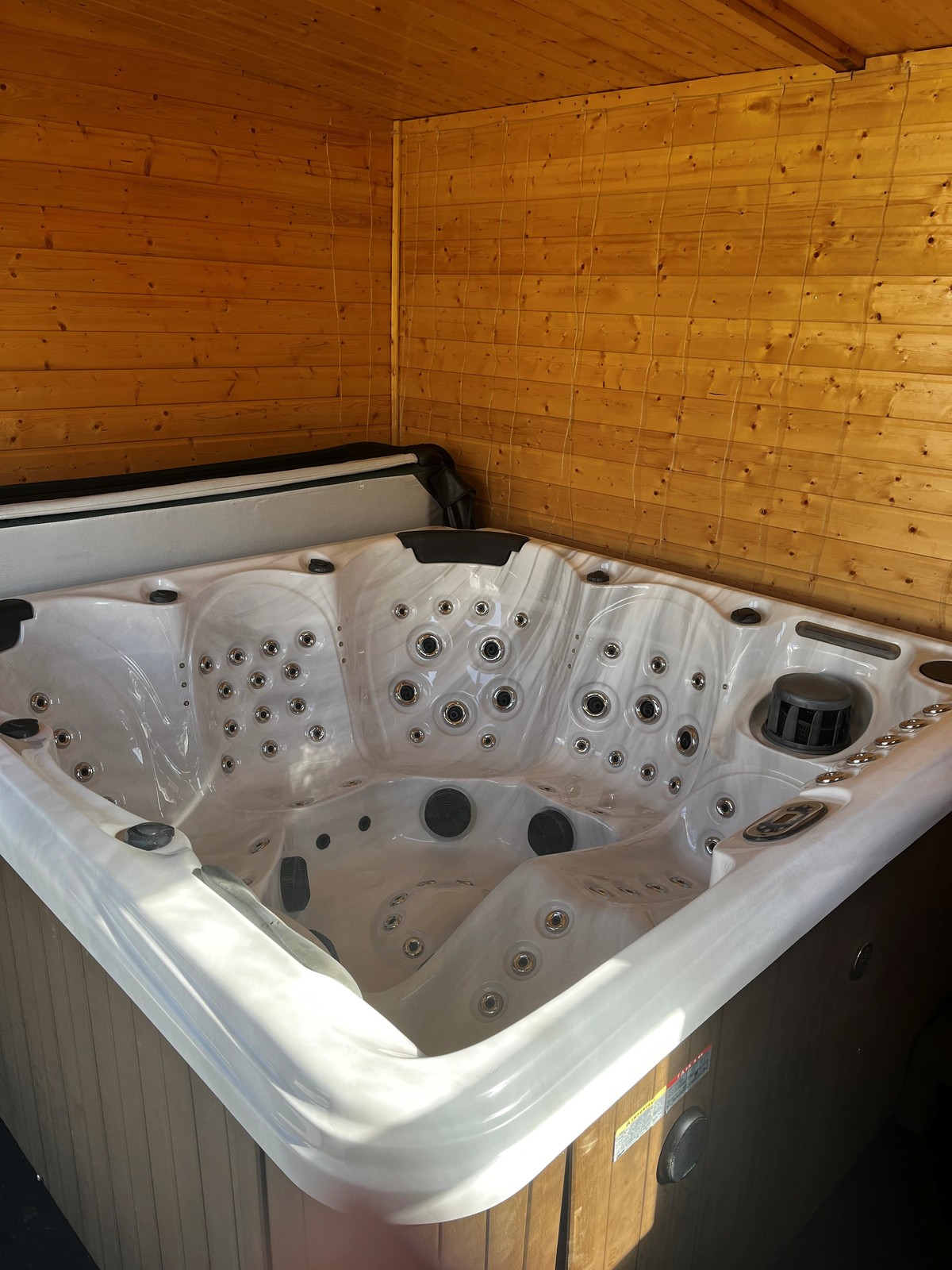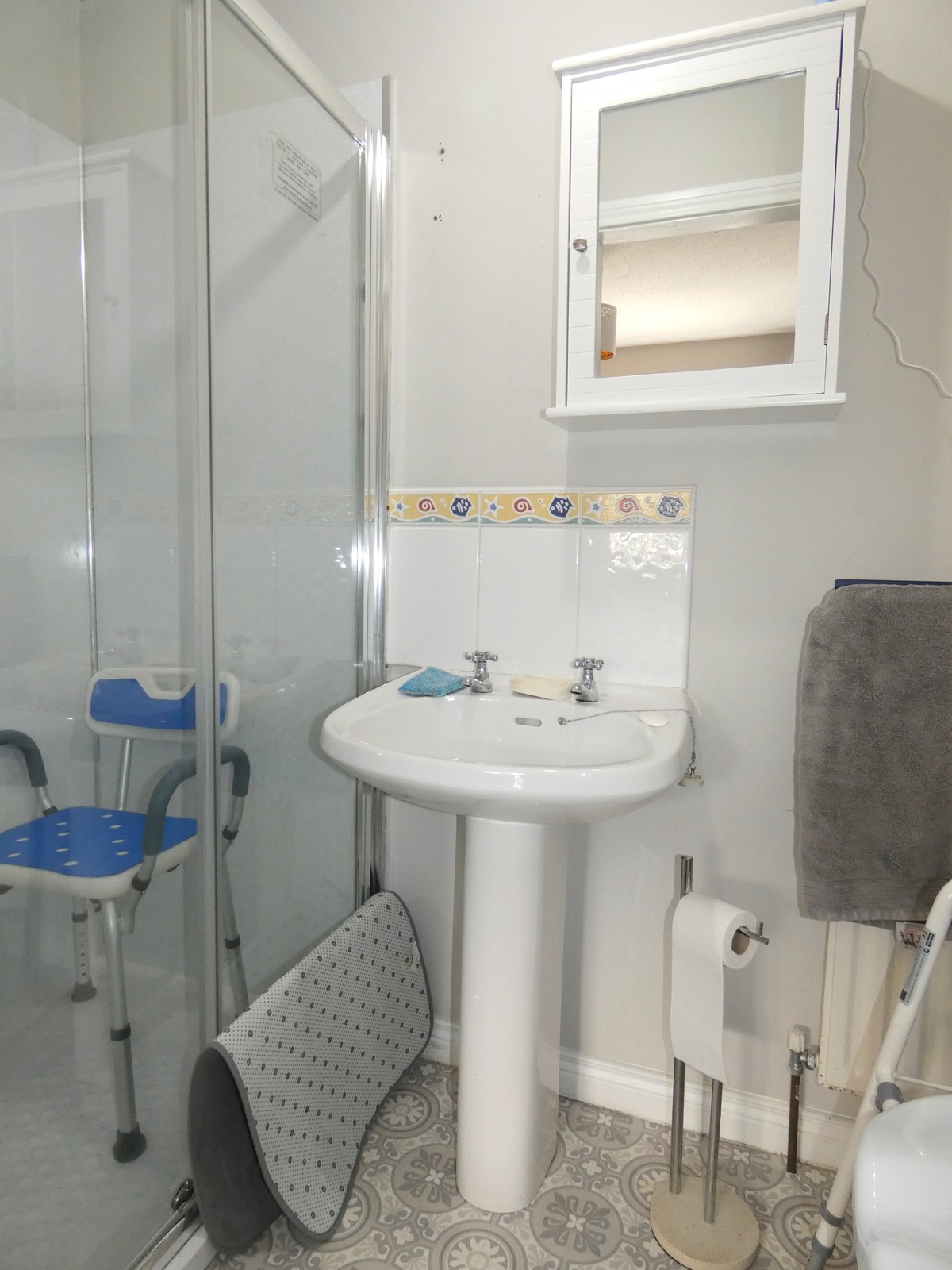 A super family bathroom including a pedestal wash hand basin, a w.c, shaver point, tiled walls, tiled floor, extractor fan, a panel bath with a mixer tap and a tiled shower cubicle with a Redring electric shower.