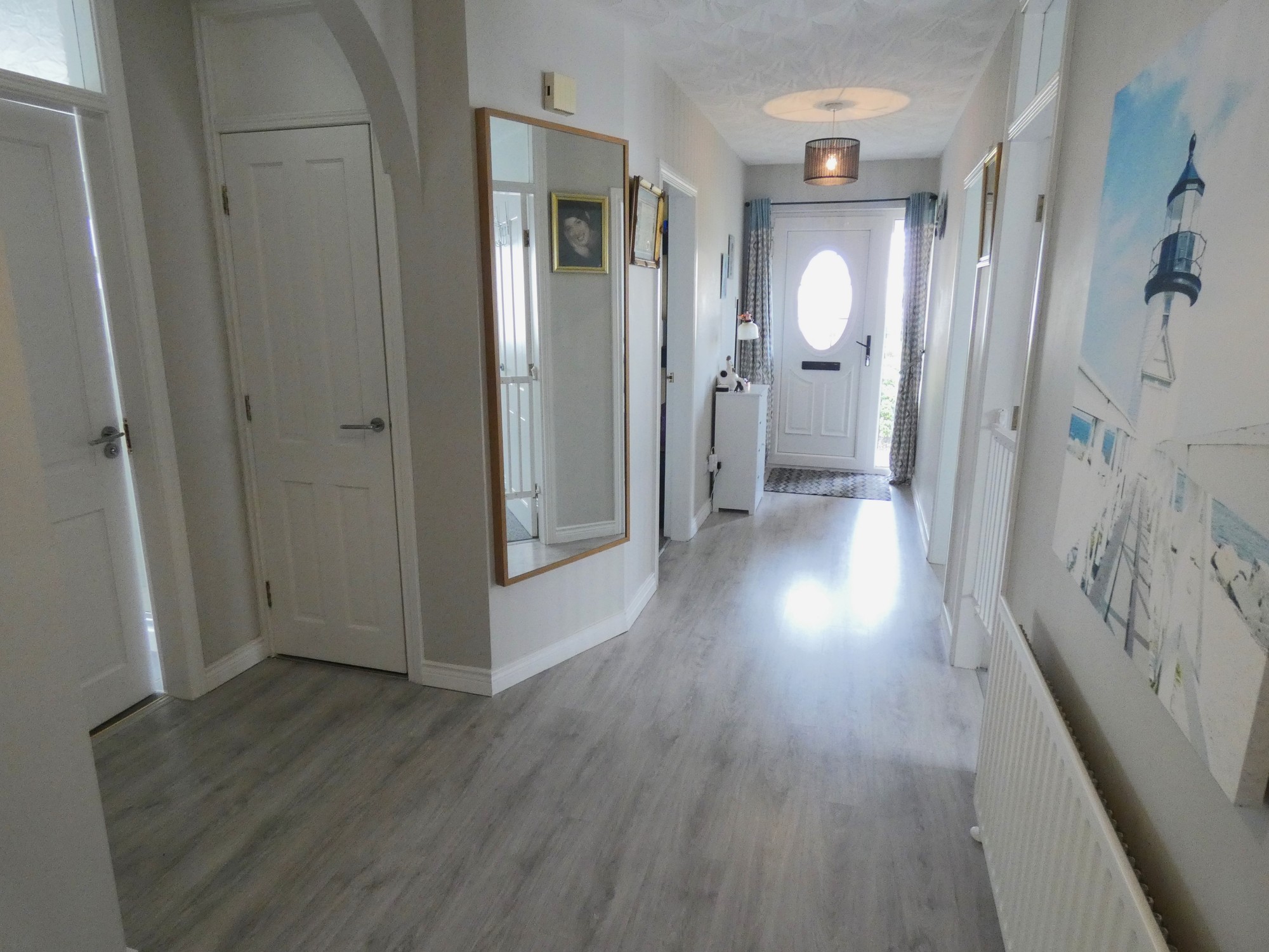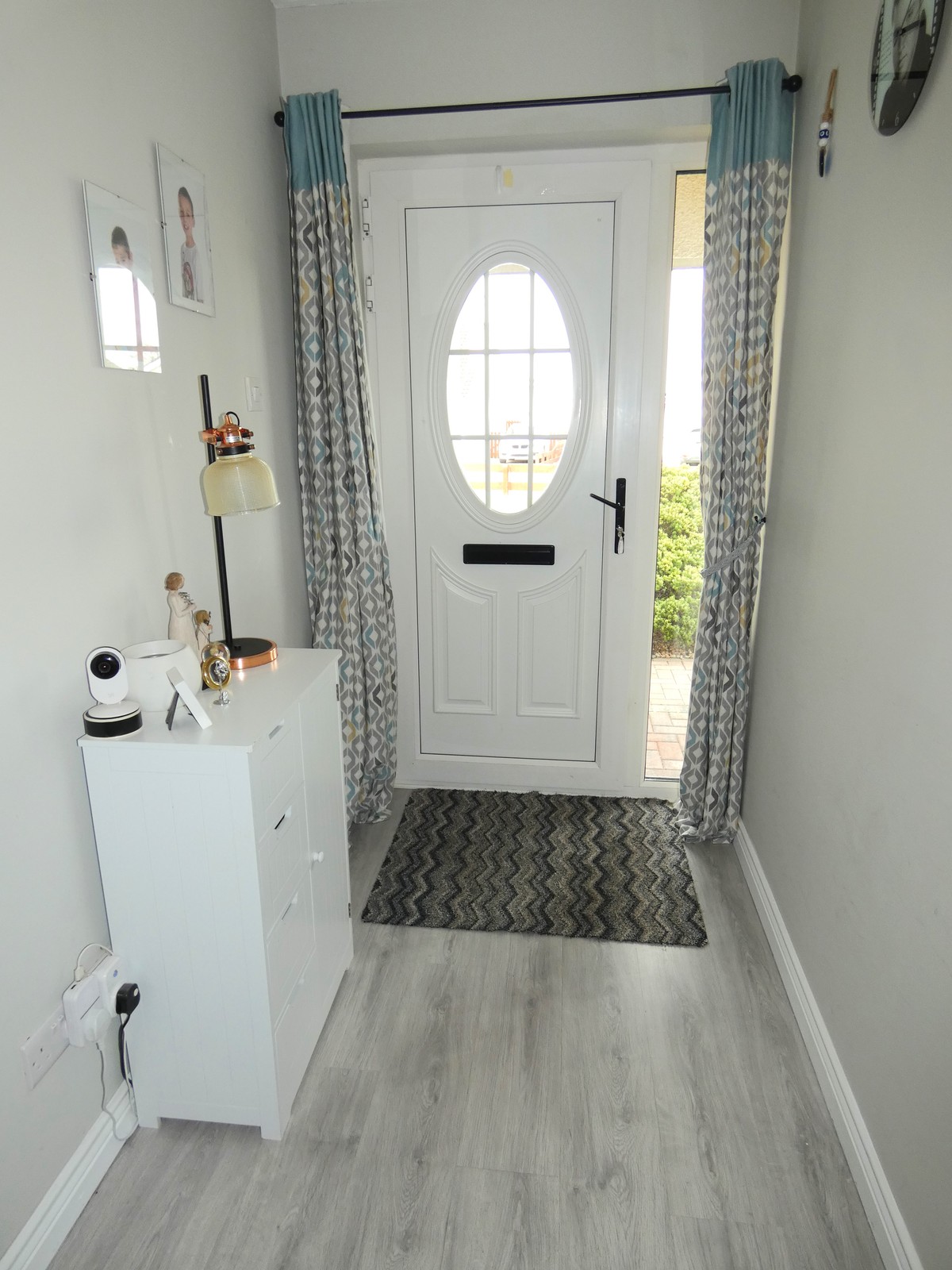 Partly glazed upvc front door with a glazed side panel, contemporary wood flooring, a cloaks cupboard and a separate airing cupboard.