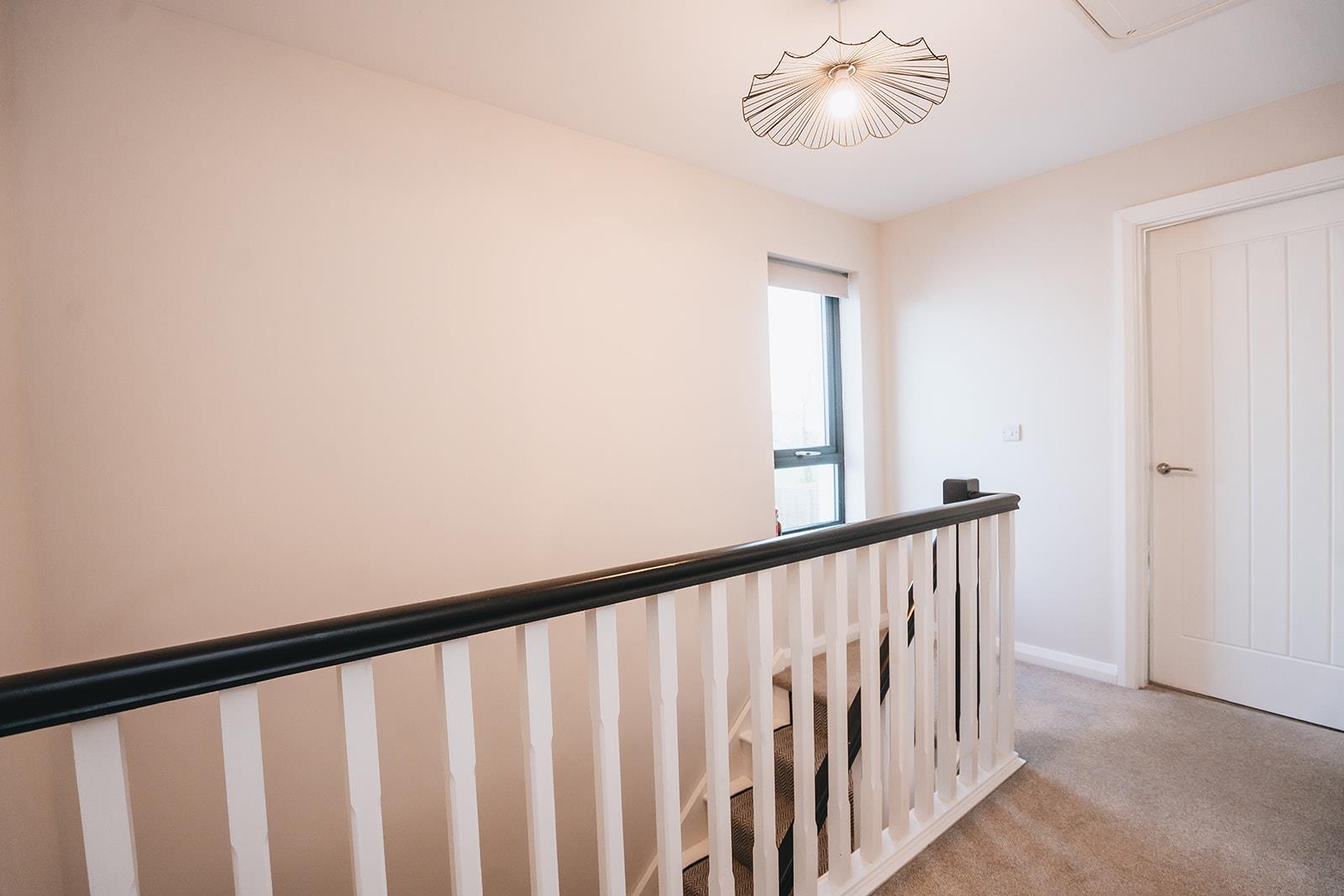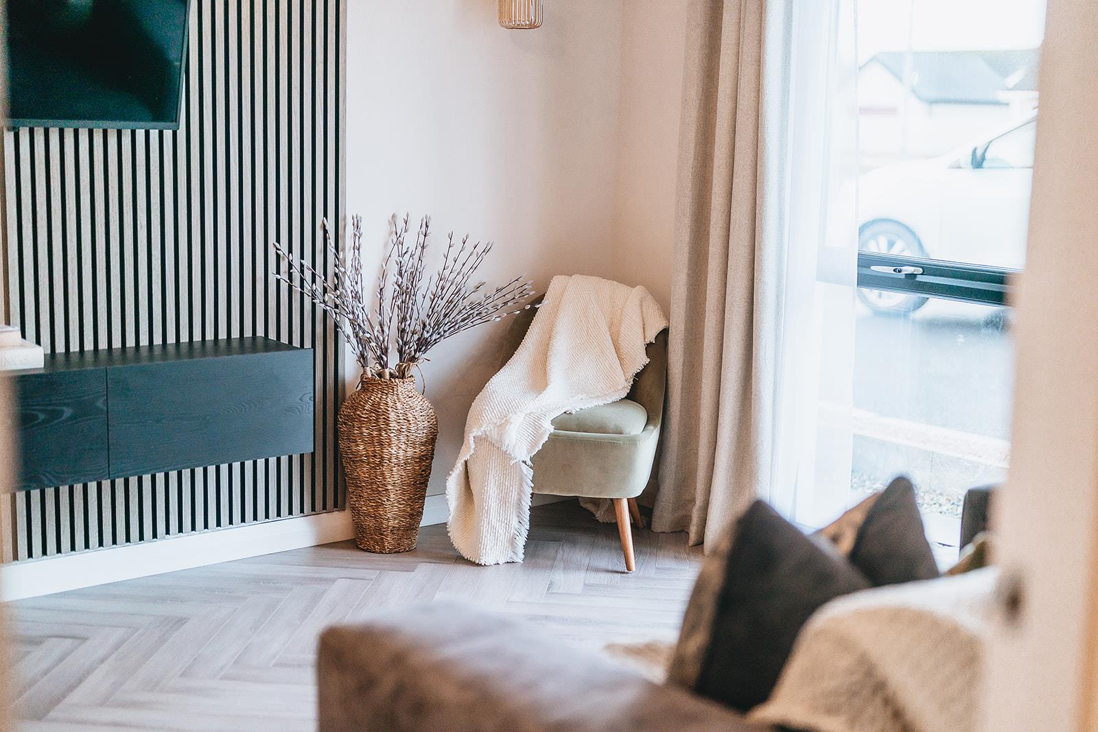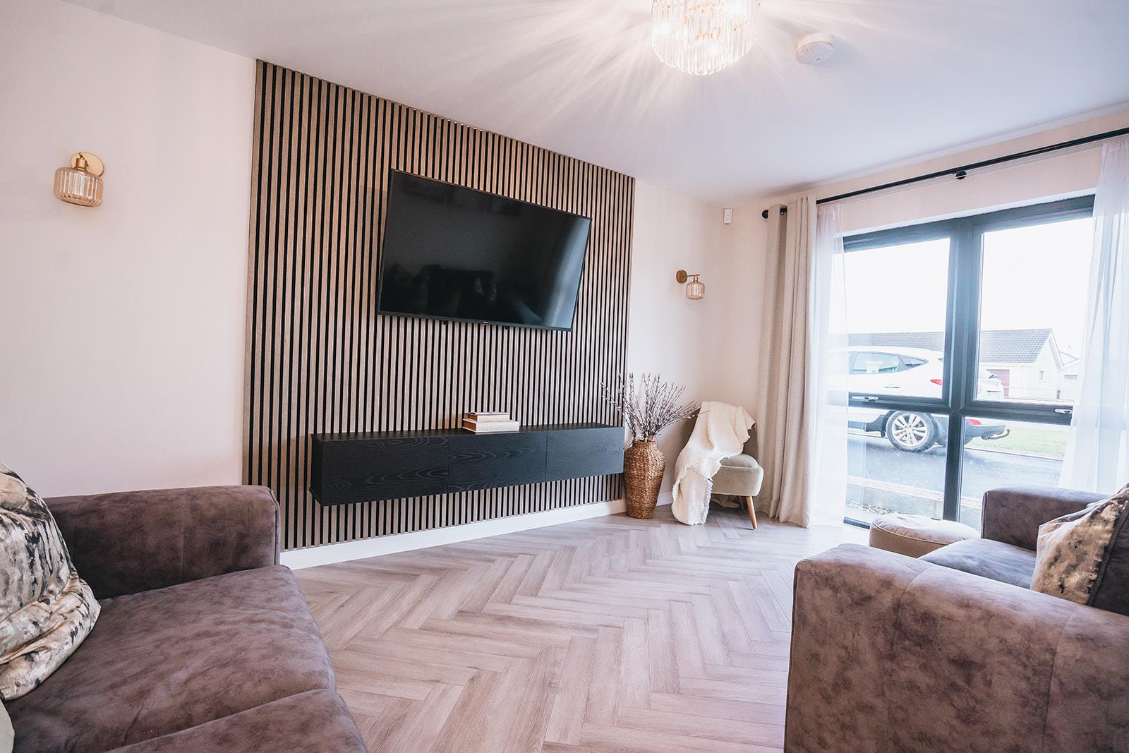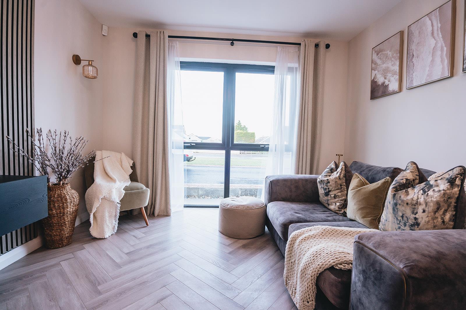 A bright spacious lounge with an aspect to the front of the development and Herringbone wood laminate flooring.