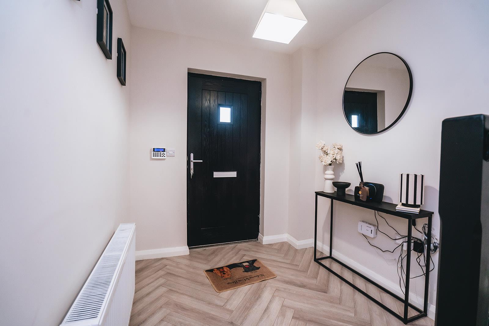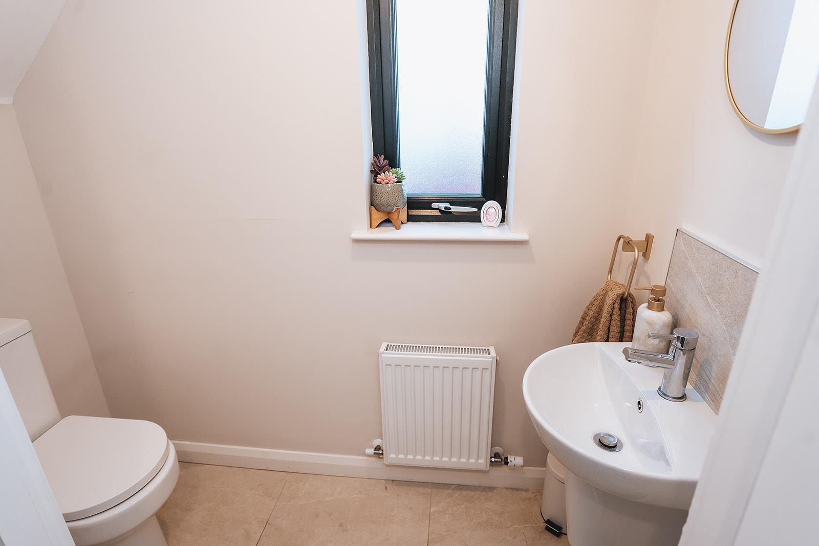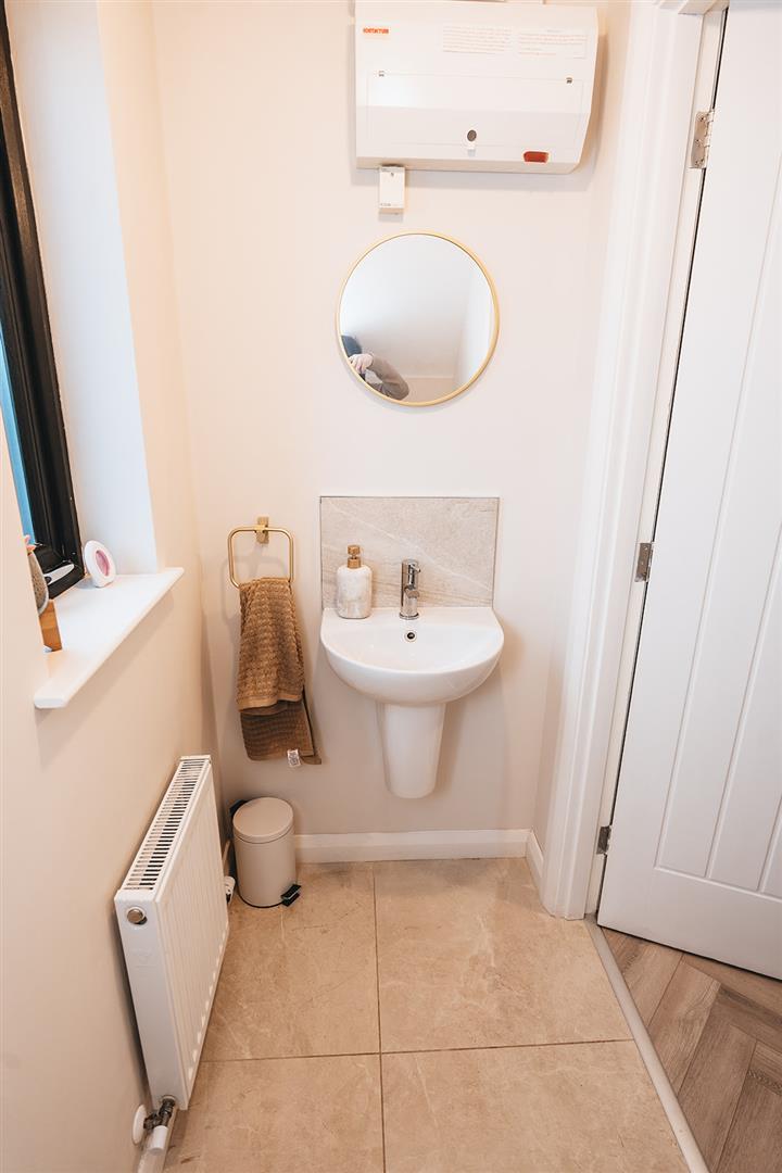 A uPVC double glazed entrance door leads to the reception hall with Herringbone wood laminate flooring, telephone point and separate cloakspace comprising low flush wc, wall hung wash hand basin with tiled splashback and tiled floor.