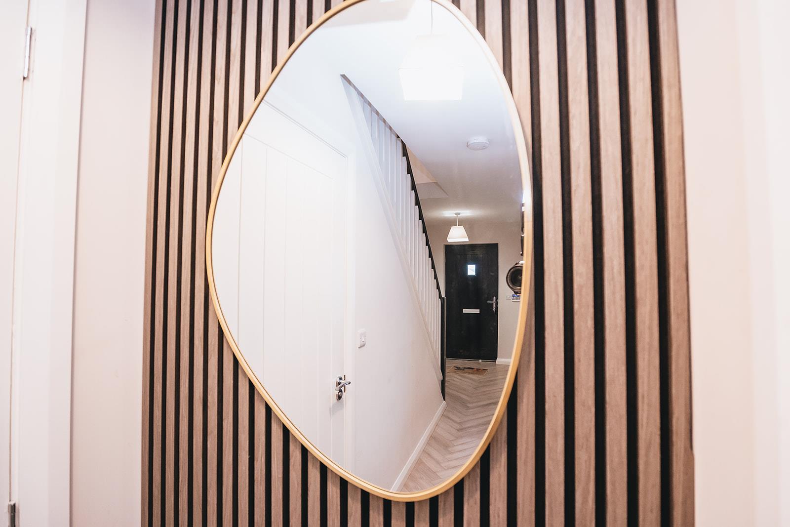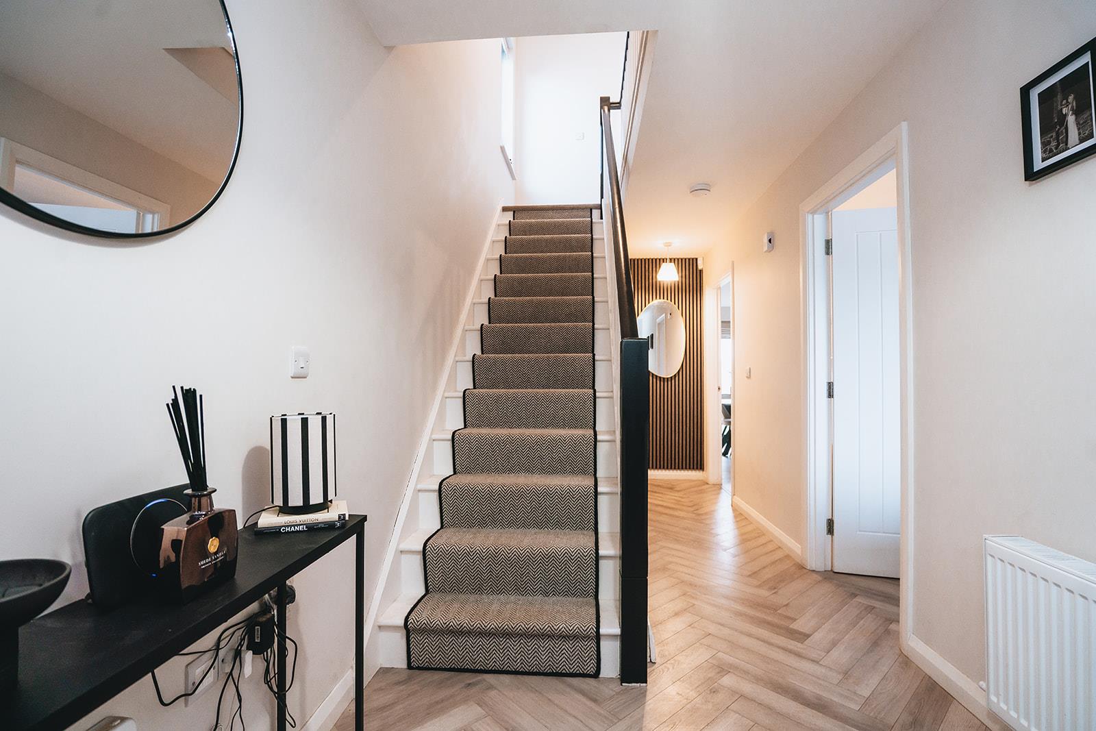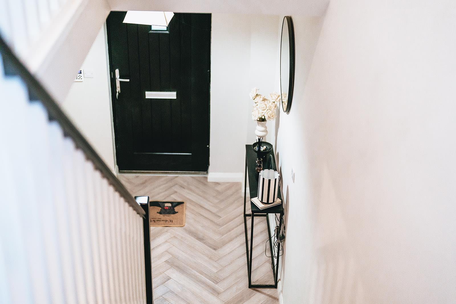 A uPVC double glazed entrance door leads to the reception hall with Herringbone wood laminate flooring, telephone point and separate cloakspace comprising low flush wc, wall hung wash hand basin with tiled splashback and tiled floor.