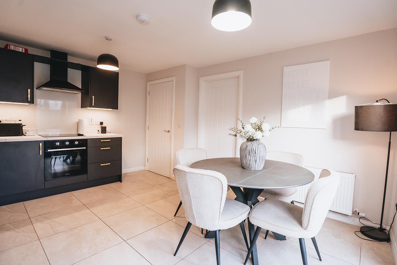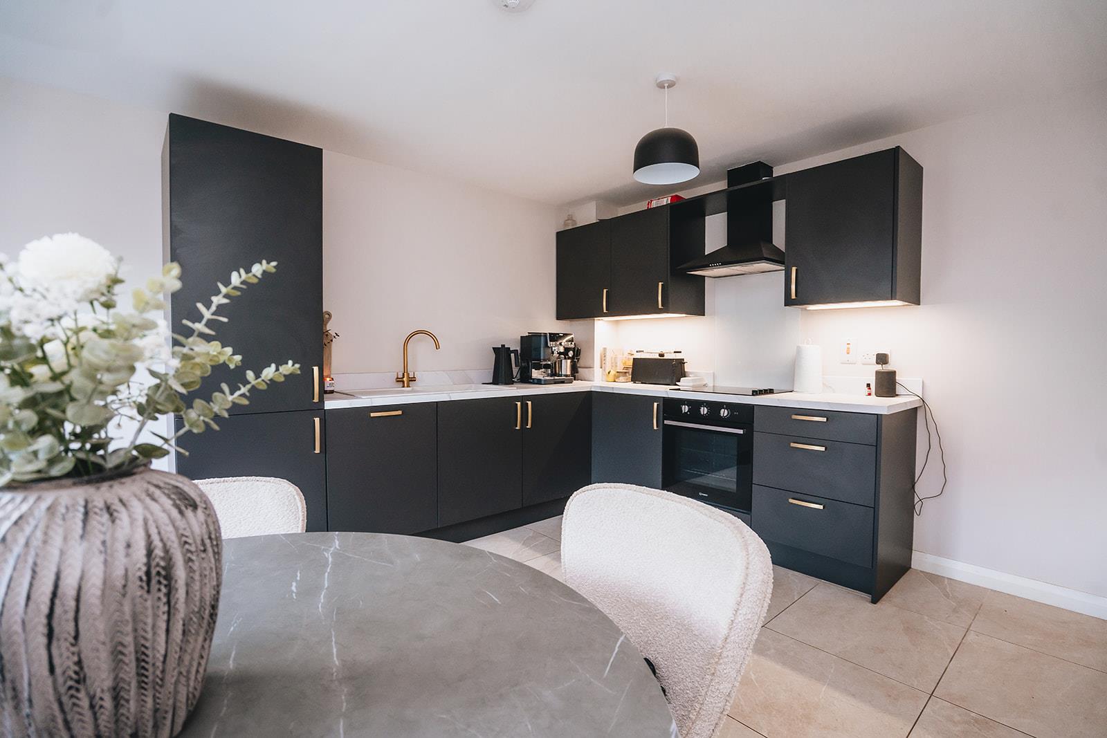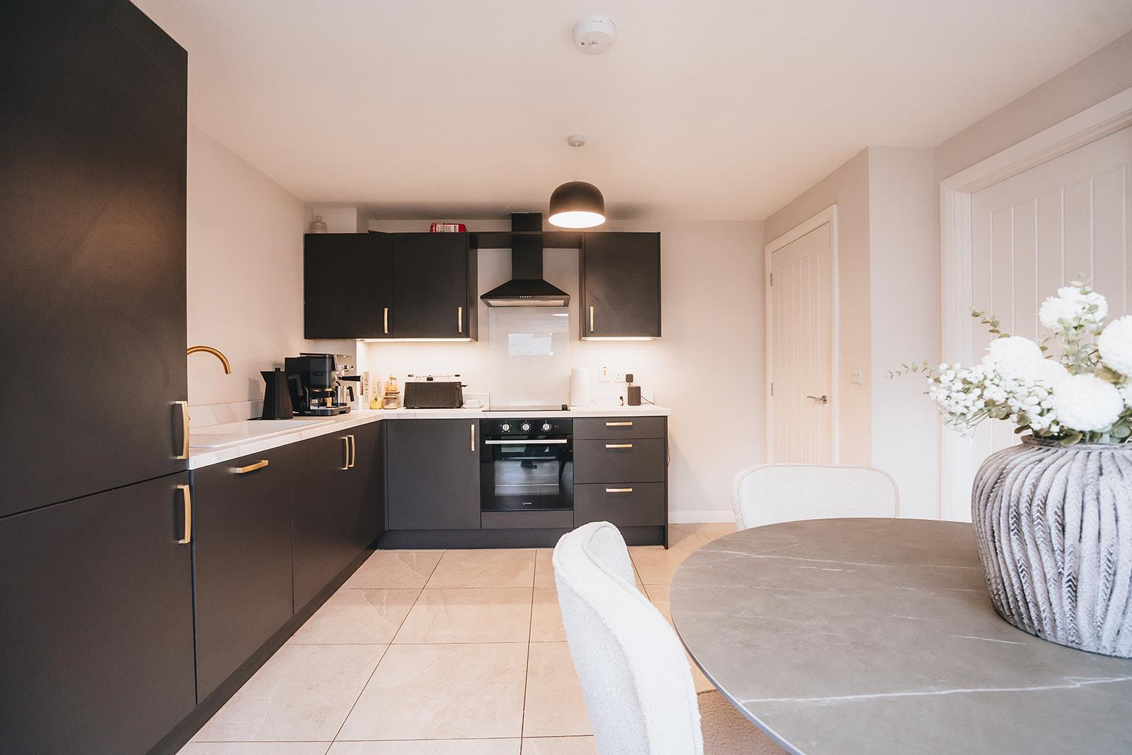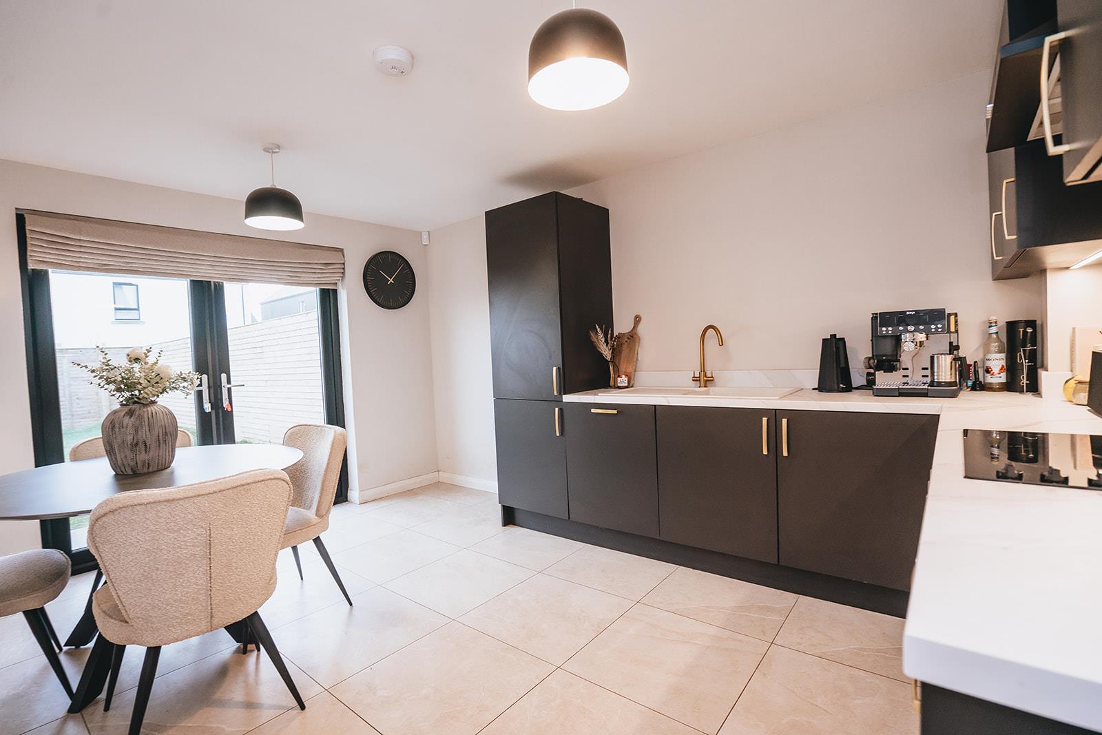 A stunning Exorna kitchen comprising a range of high and low level units, integrated dishwasher and fridge freezer, laminated worksurface with upstand incorporating ceramic sink with mixer tap, electric hob and under oven, extractor canopy, concealed under unit lighting, tiled floor, dining space and French doors to the rear garden area.