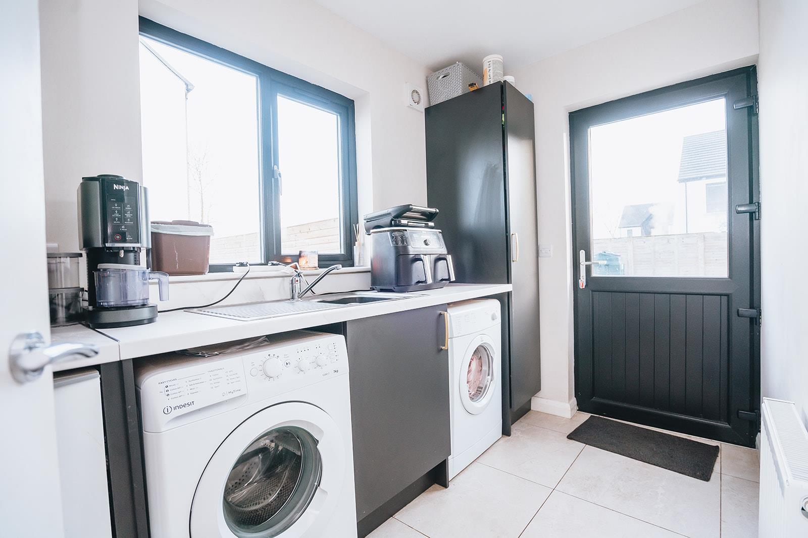 Located just off the Kitchen comprising broom cupboard, laminated worksurface incorporating stainless steel sink inset with under cupboard, plumbed for washing machine, space for tumble dryer, tiled floor and oil fired burner.