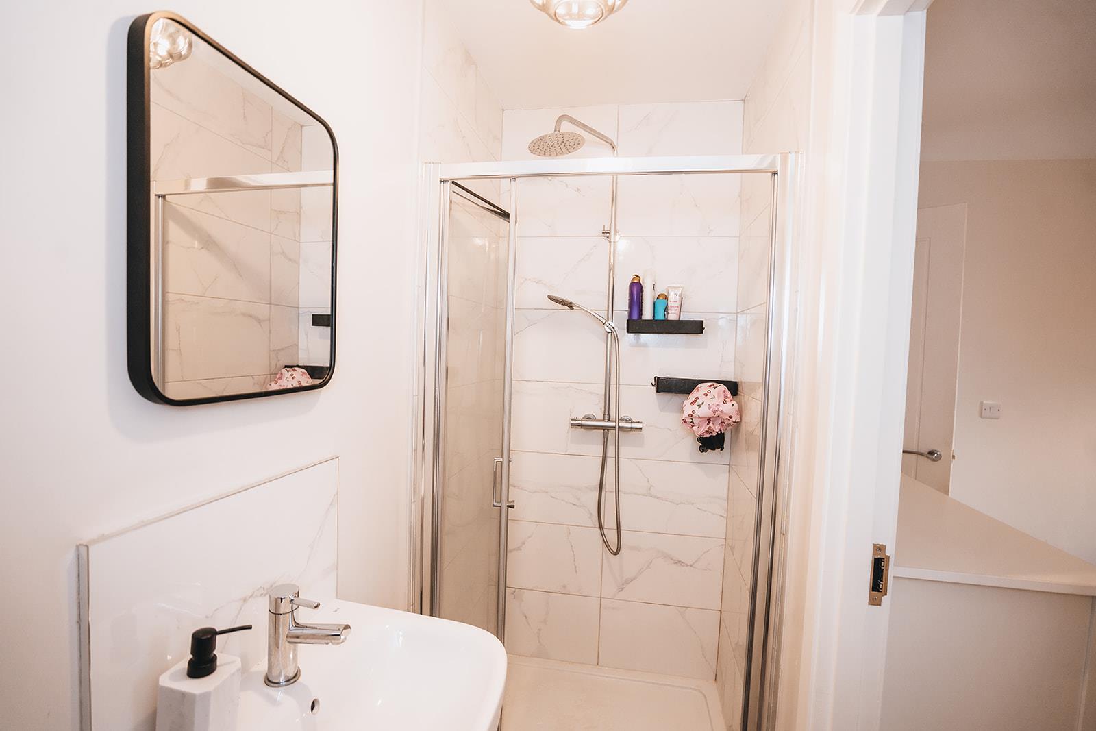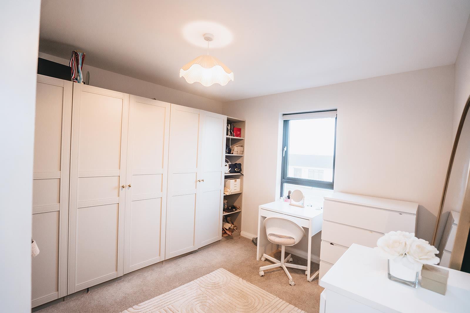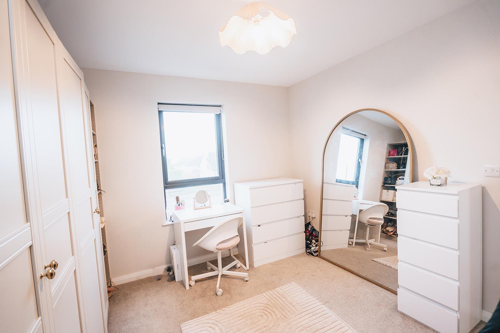 A very generous master bedroom with TV point. En-suite 2.5m x 1.0m comprising low flush wc, wall hung wash hand basin with tiled splashback and mixer tap, tiled shower cubicle with thermostatic shower, tiled floor.