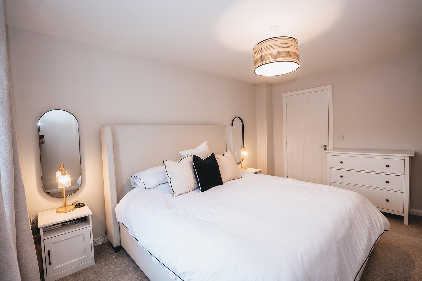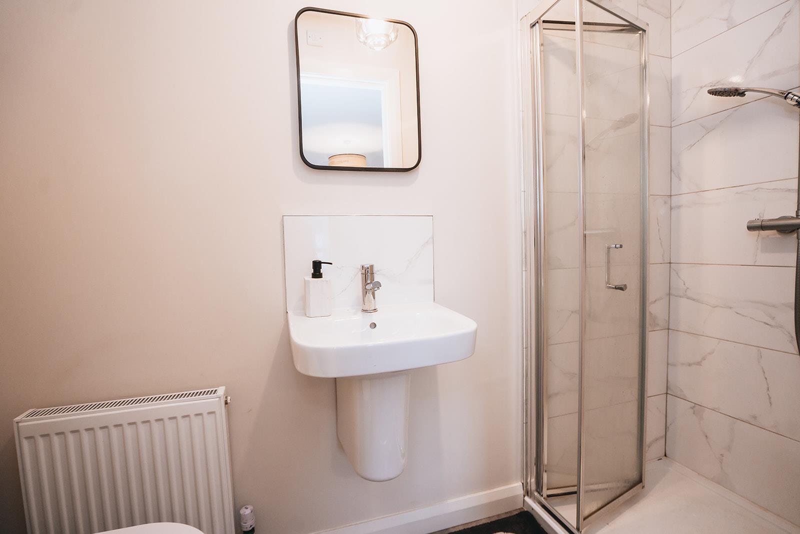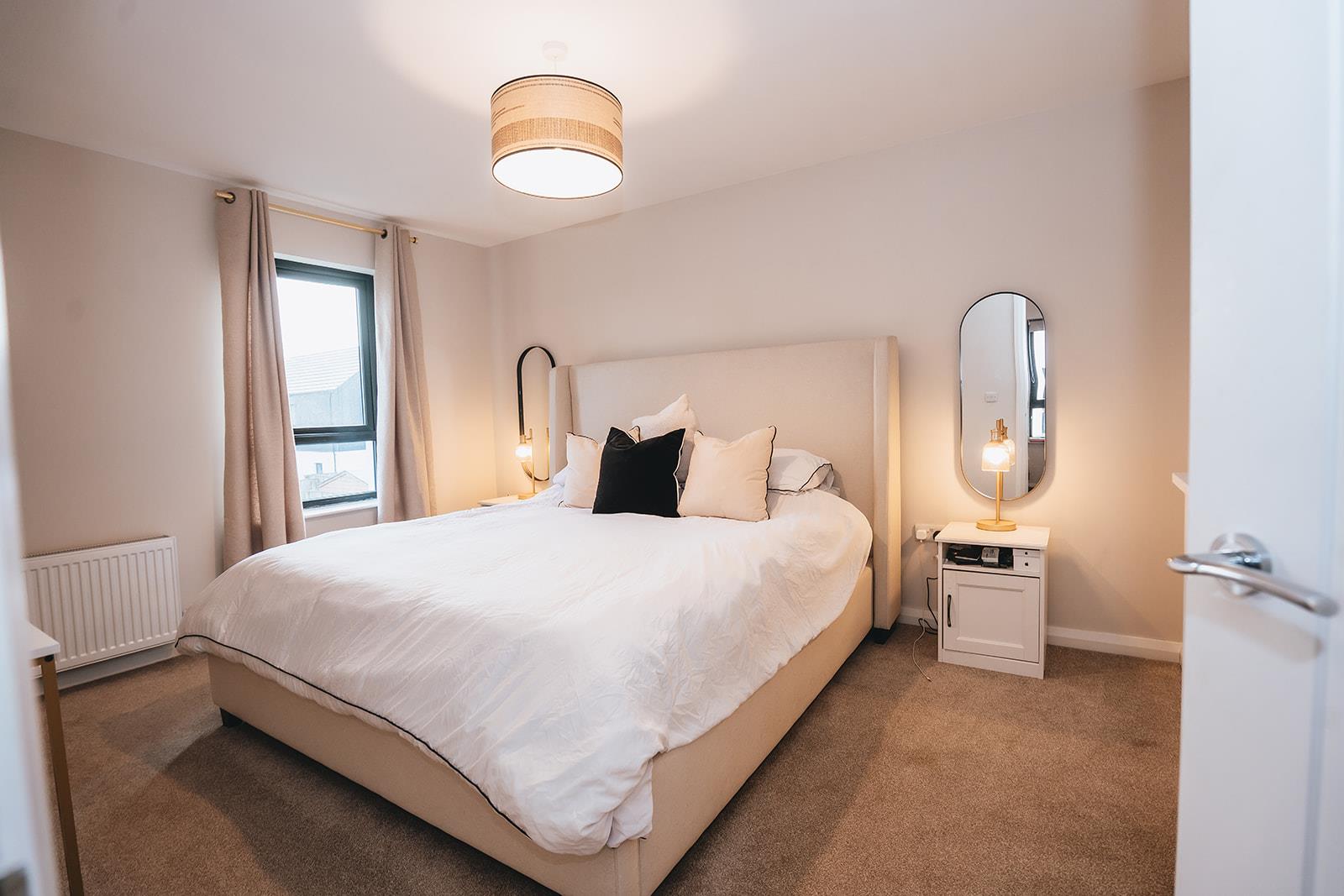 A very generous master bedroom with TV point. En-suite 2.5m x 1.0m comprising low flush wc, wall hung wash hand basin with tiled splashback and mixer tap, tiled shower cubicle with thermostatic shower, tiled floor.