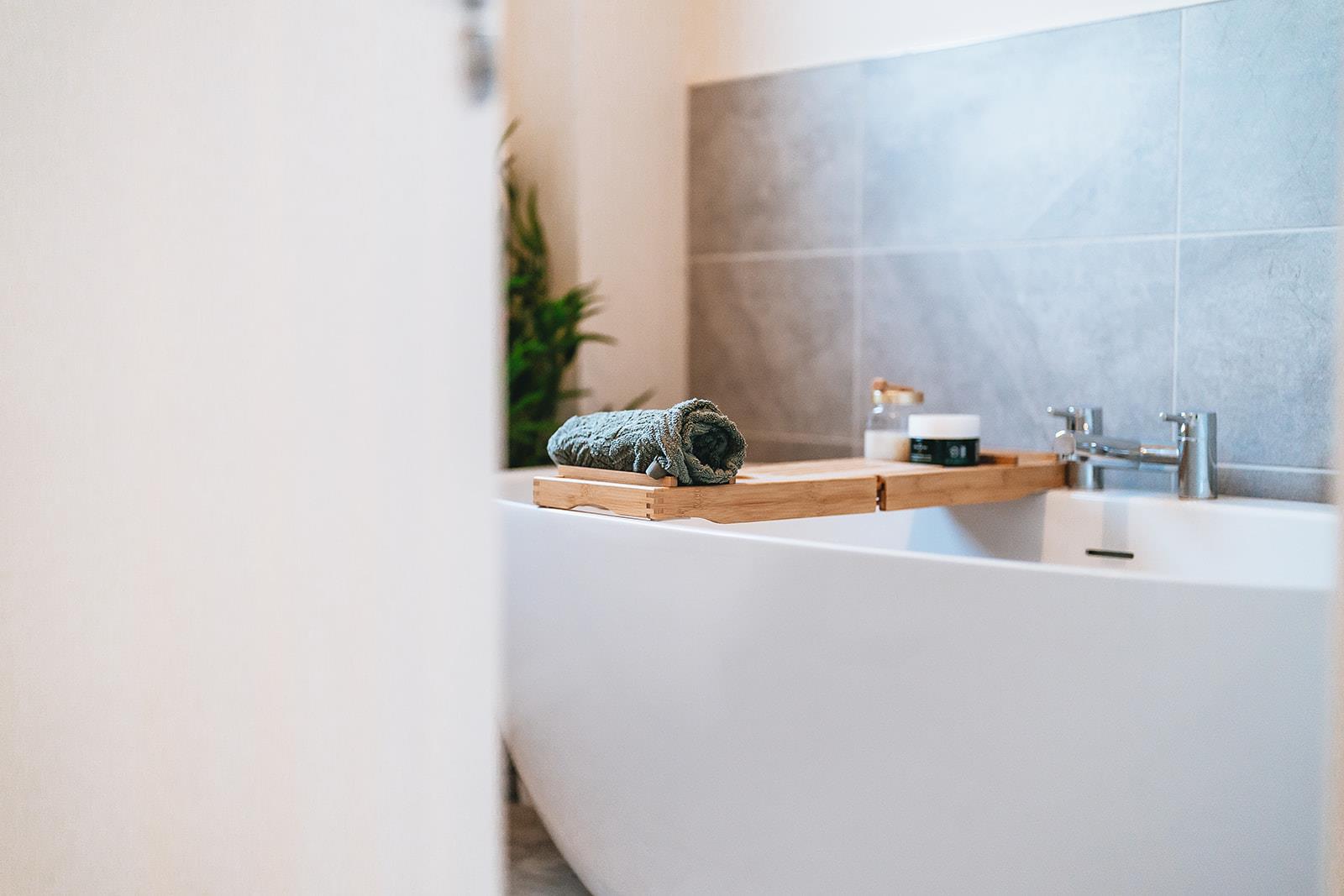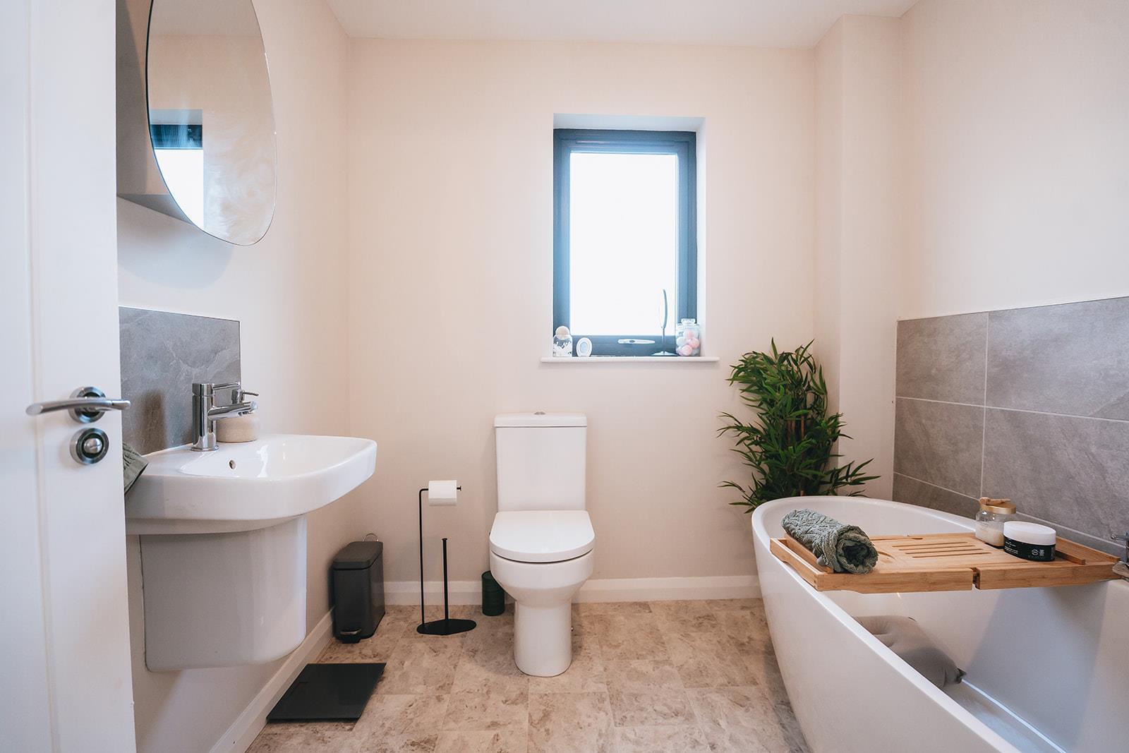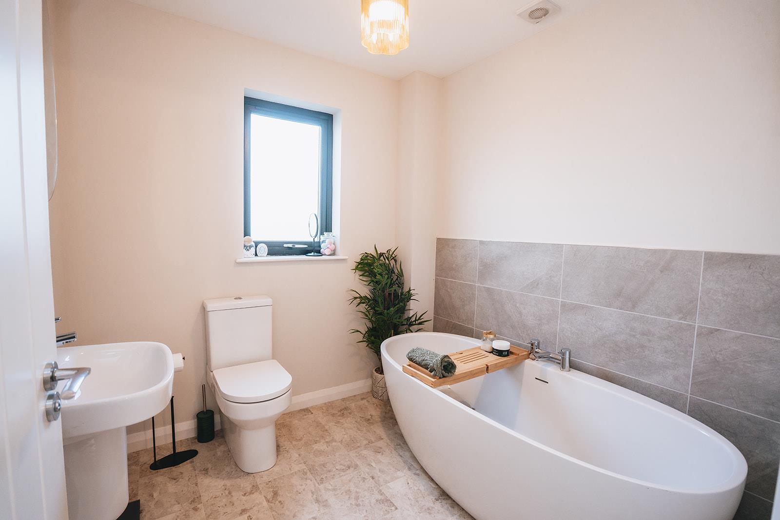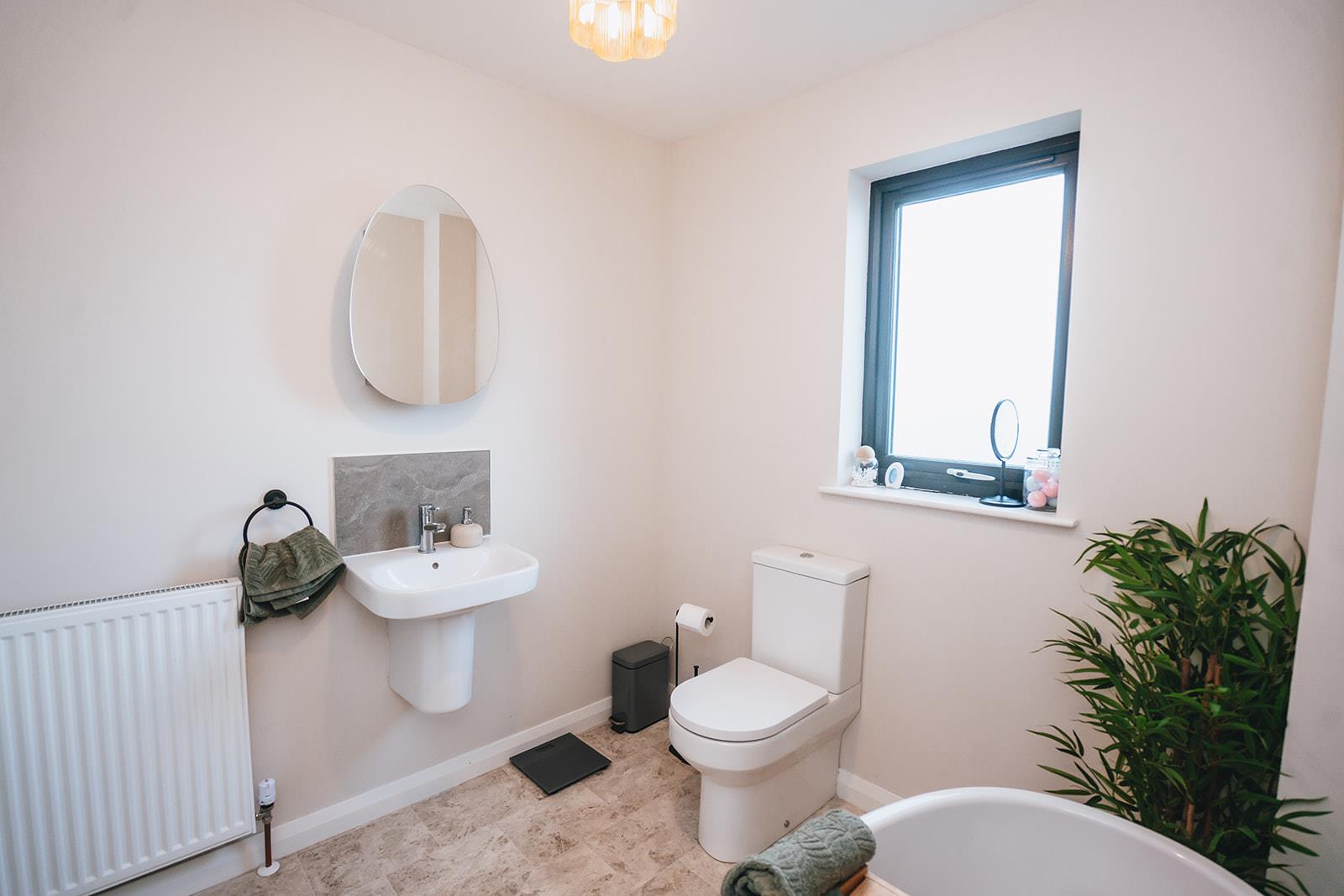 Stunning family bathroom comprising a freestanding bath with mixer tap, low flush wc, wall hung wash hand basin with tiled splashback and mixer tap.