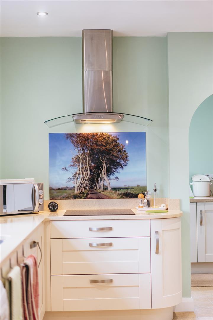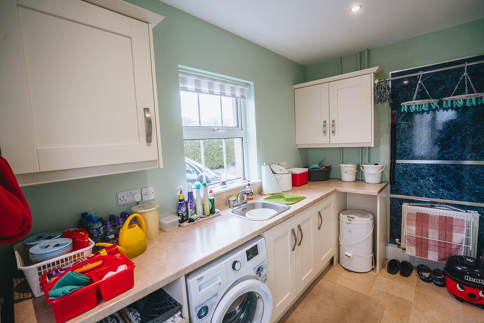 Comprising a range of high and low level units, laminated worksurface incorporating stainless steel sink inset, plumbed for washing machine, space for tumble dryer, low voltage spotlighting and Karndean flooring.