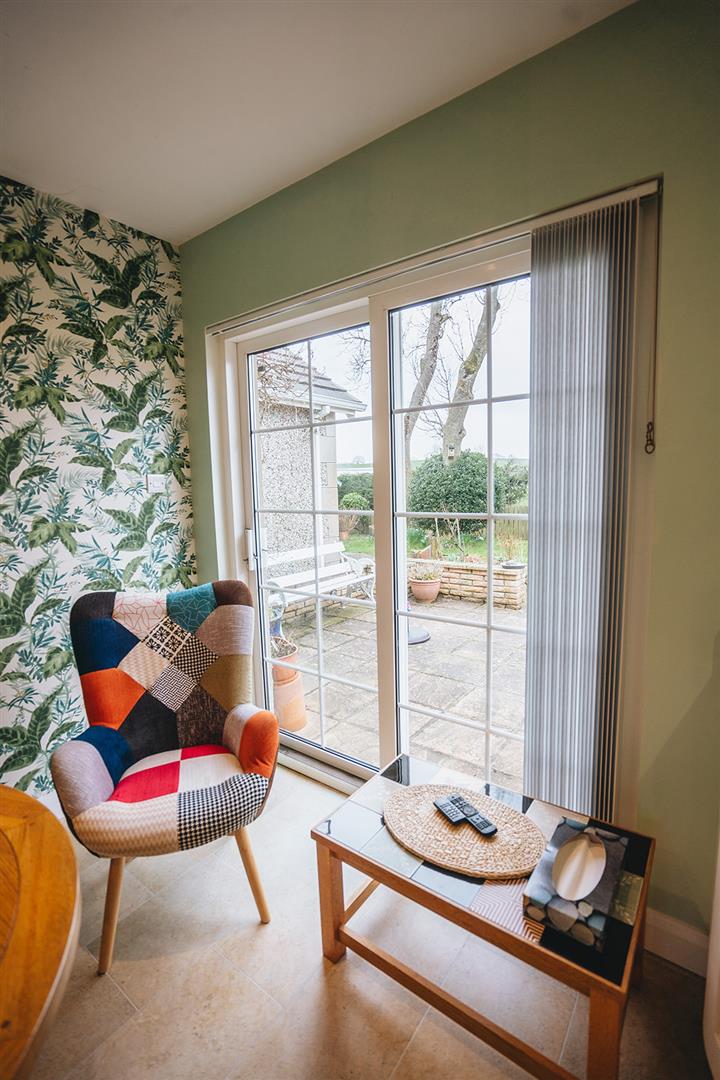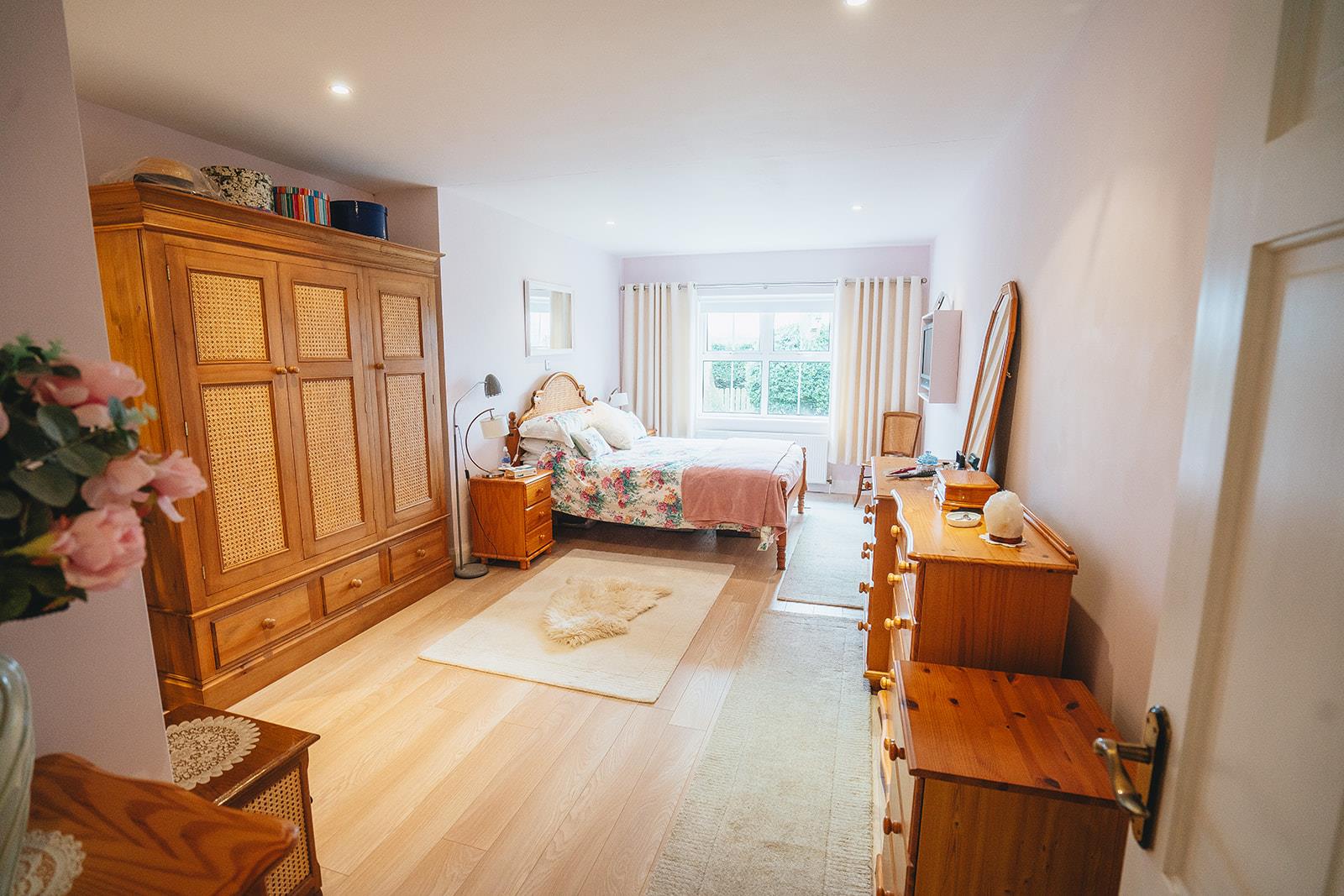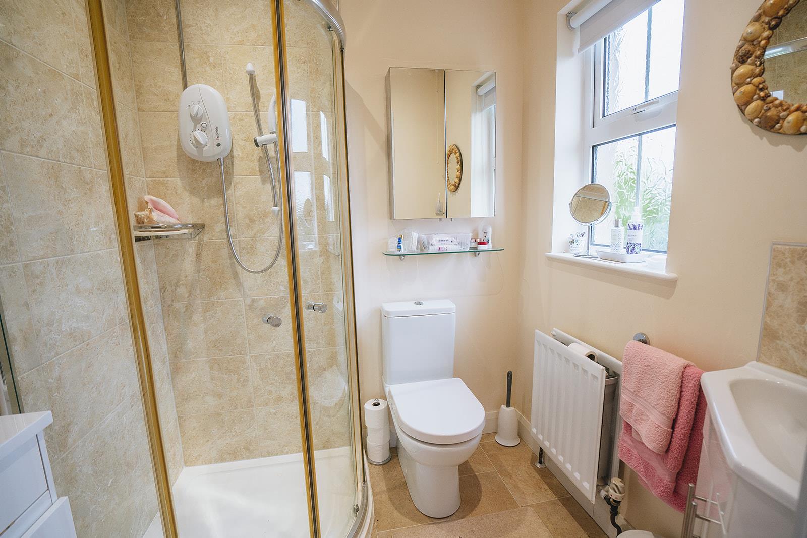 This room was extended in 2012 providing a spacious double bedroom and ensuite. Wood laminate flooring, low voltage spotlighting and wall lights. En-suite 1.5m x 1.9m Comprising corner vanity unit with tiled splashback, low flush wc, corner tiled shower cubicle with Essentials electric shower and low voltage spotlighting.