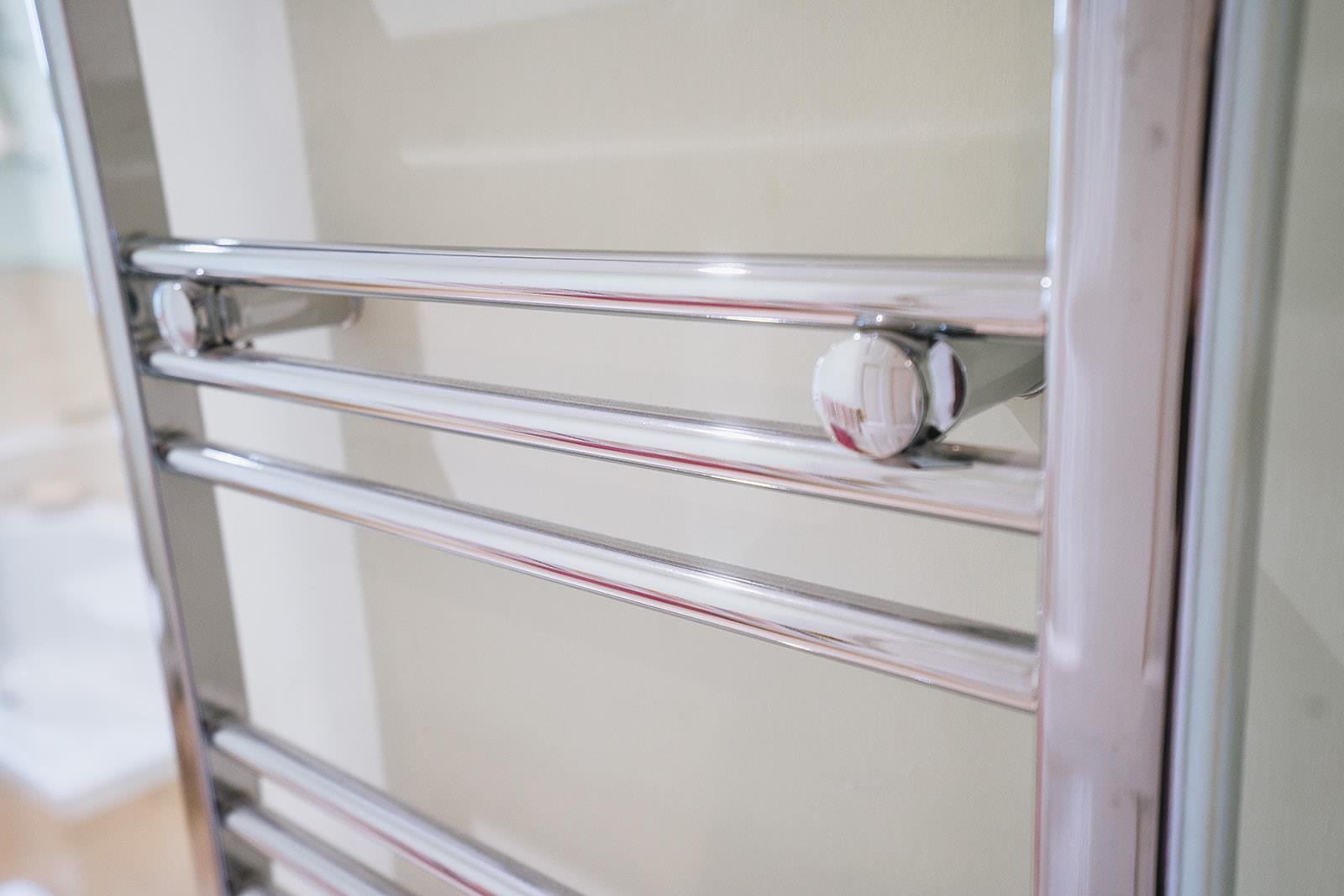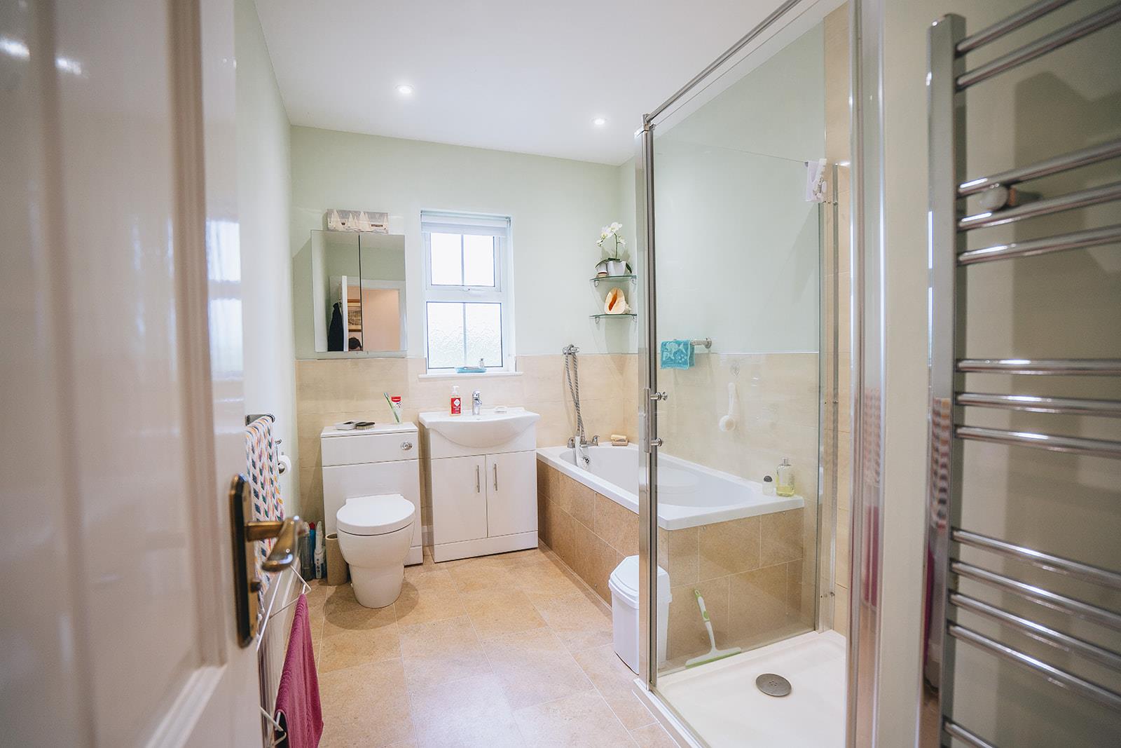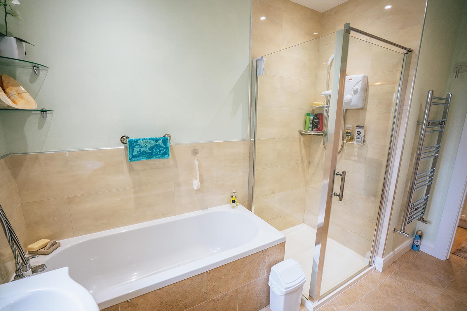 Family bathroom comprising panel bath with shower attachment, low flush wc, vanity unit with mixer taps, tiled shower cubicle with Expressions 520TS electric shower, heated towel rail, low voltage spotlighting, part tiled walls and Karndean flooring.