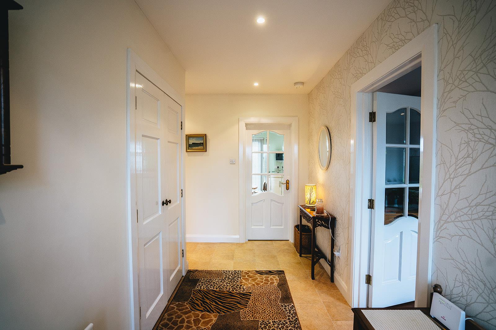 A glazed door leads to the reception hall with Karndean flooring, double cloakspace telephone point, low voltage spotlighting and built-in hotpress. A fold down ladder offers access to the floored roofspace with shelving storage and lights.