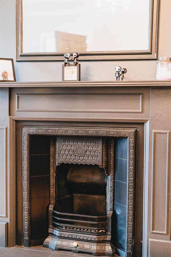 A bright living space with box window, coving, open fireplace in wooden surround with cast iron inset and tiled hearth.