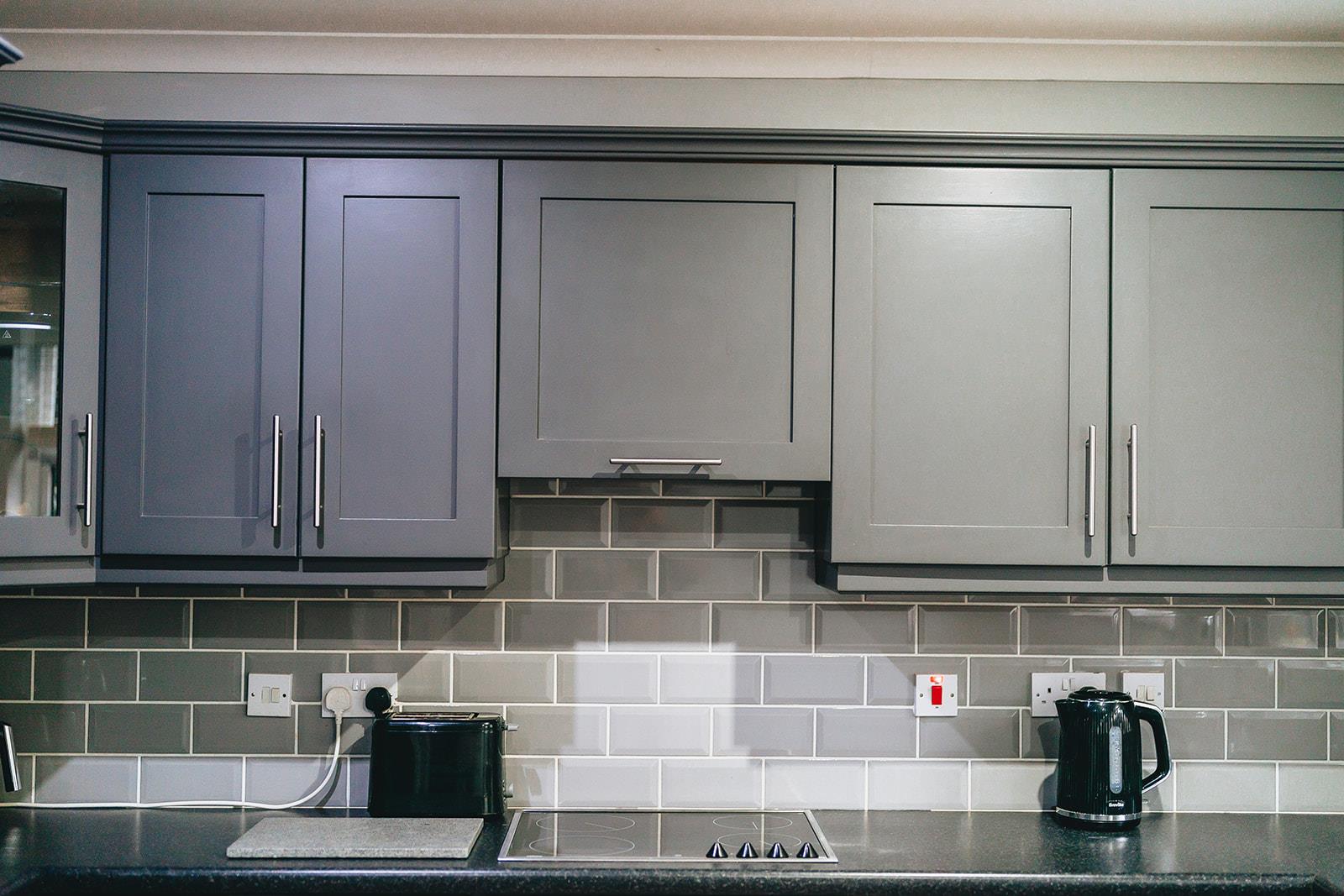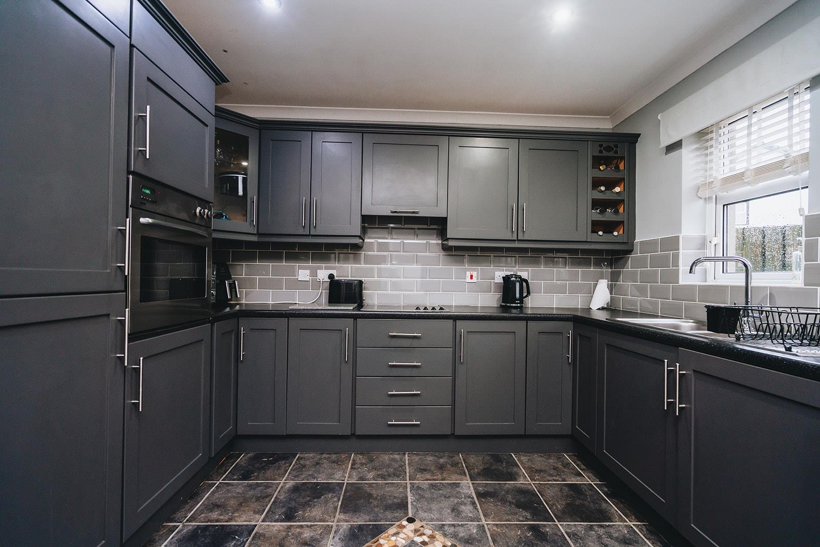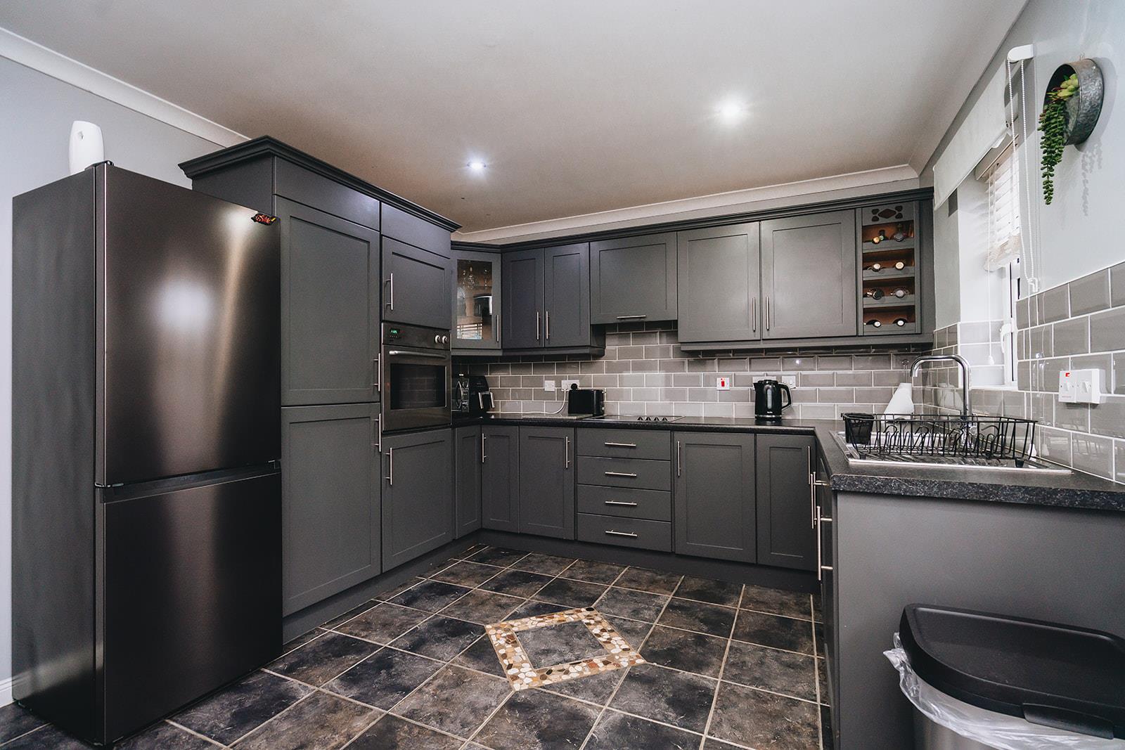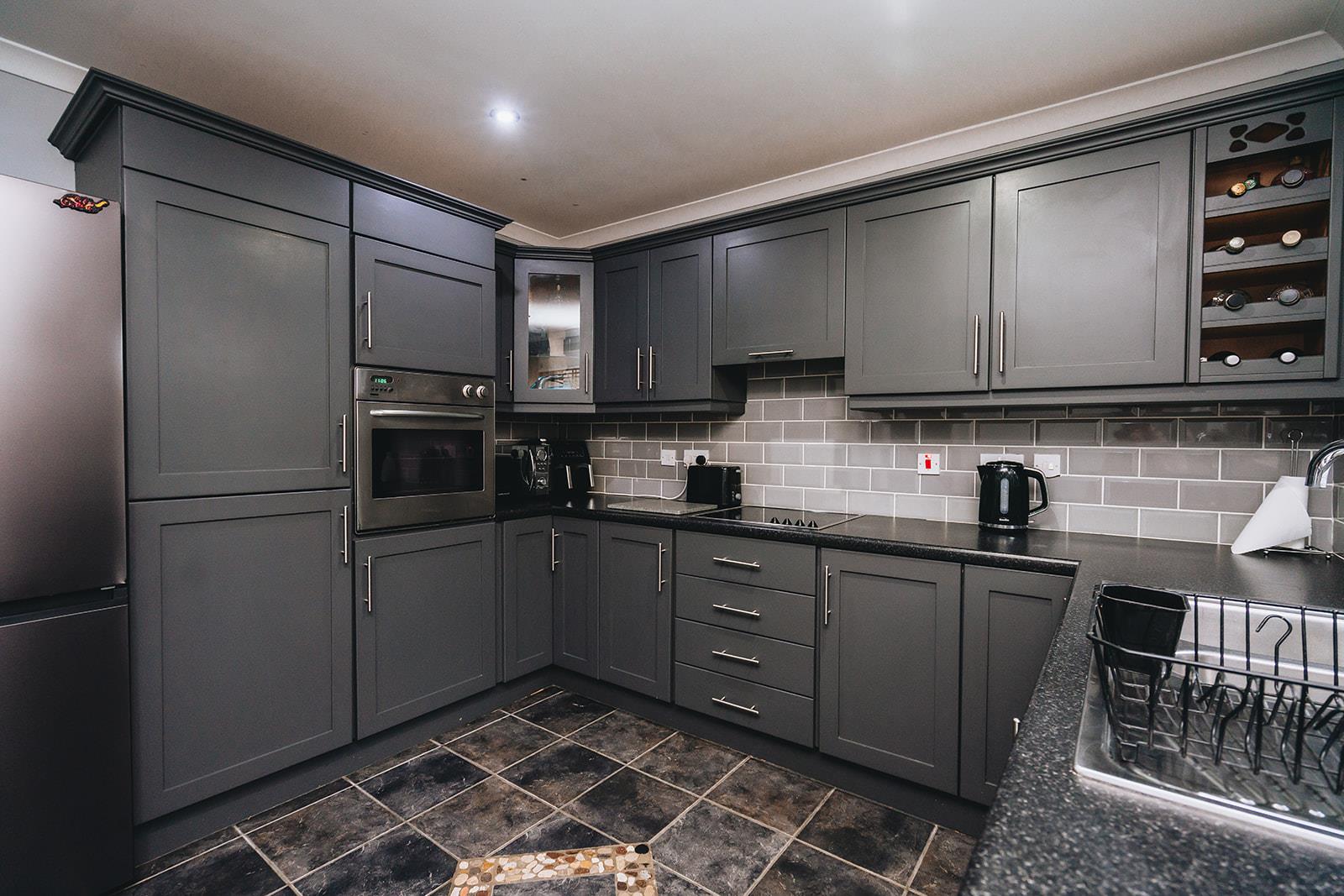 Comprising a range of high and low level units, laminated worksurface incorporating stainless steel sink inset, tiled above worktop, tiled floor, oil fired burner, plumbed for washing machine and space for tumble dryer.