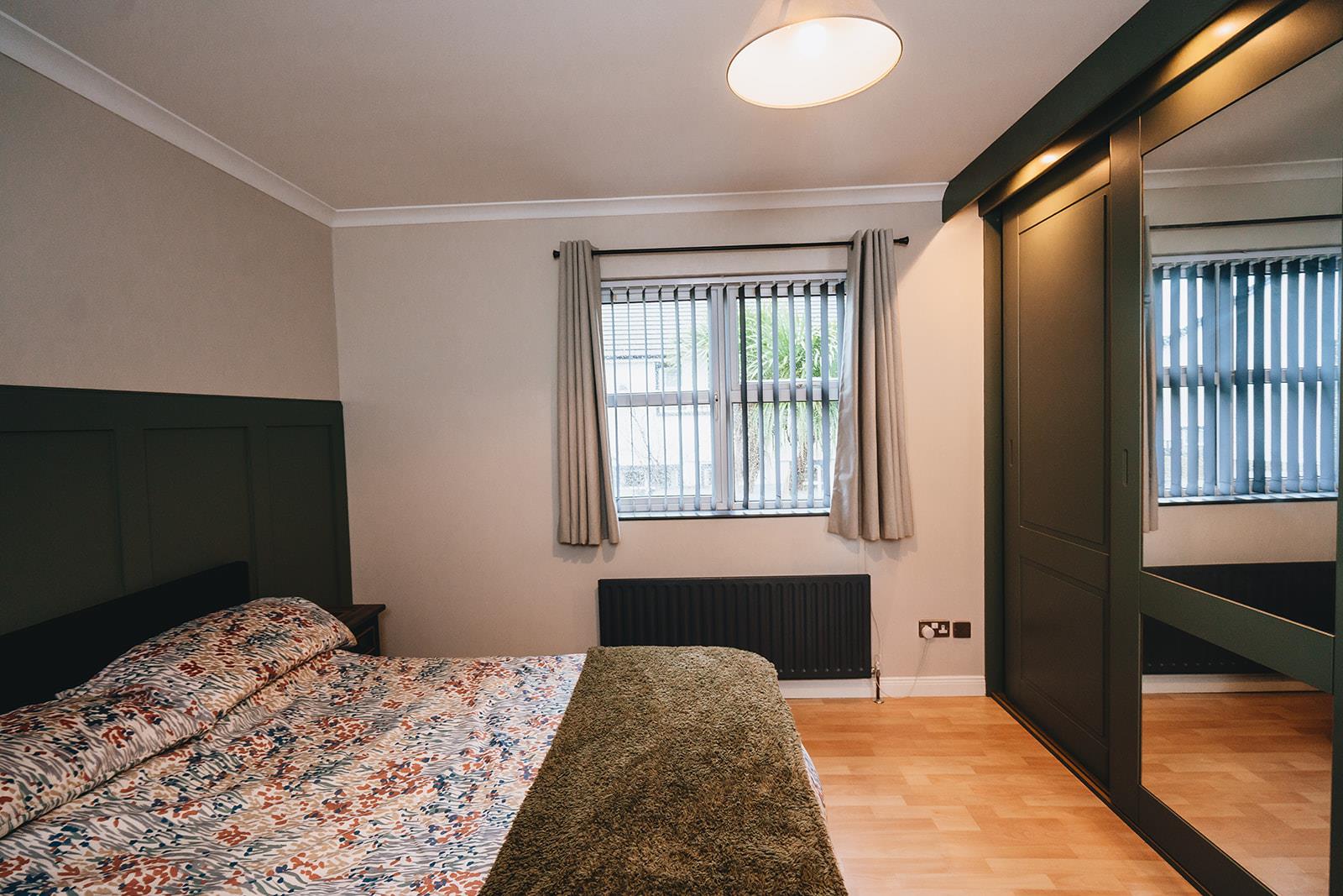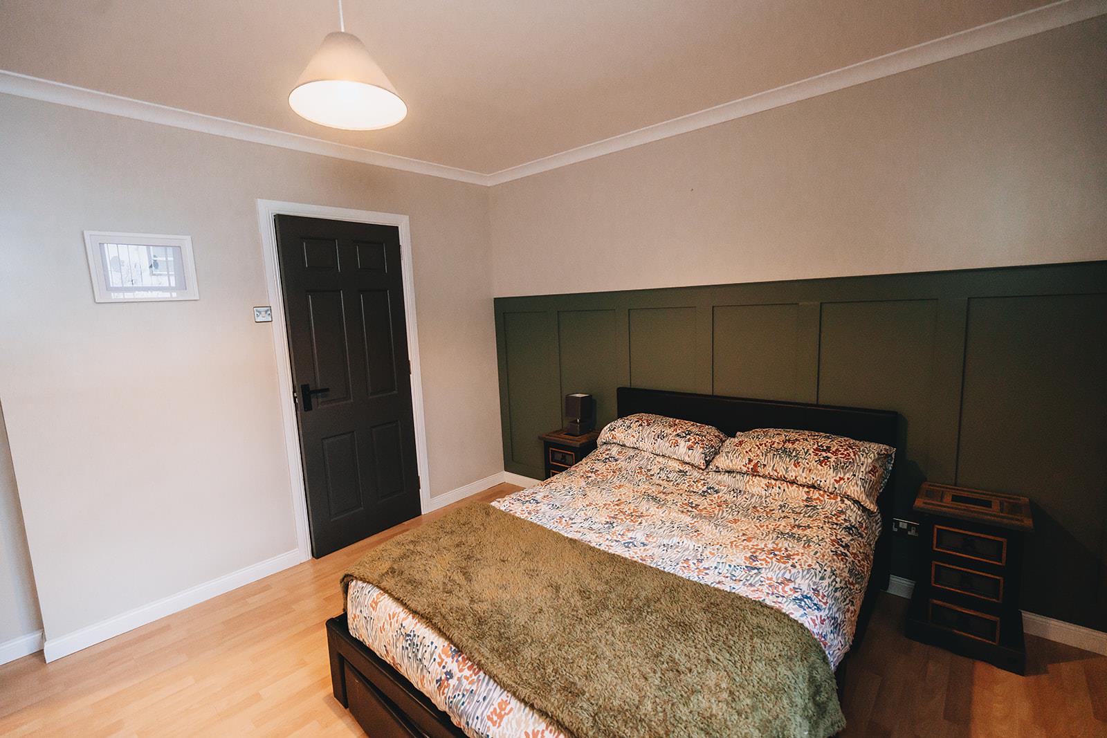 A double room with fitted sliding robes with downlighters, wood laminate flooring, feature wood panelled wall, coving, TV point and stainless steel sockets. Ensuite comprising tiled shower cubicle with Briston Smile electric shower, low flush wc, pedestal wash hand basin and tiled floor.