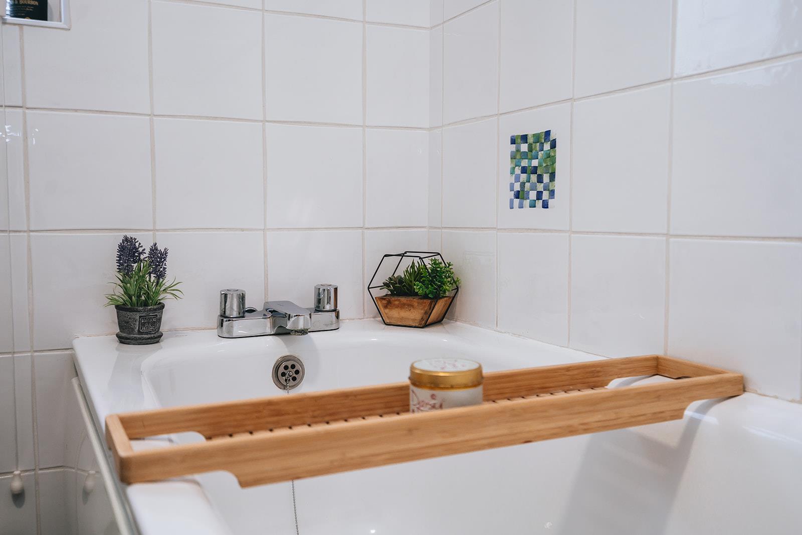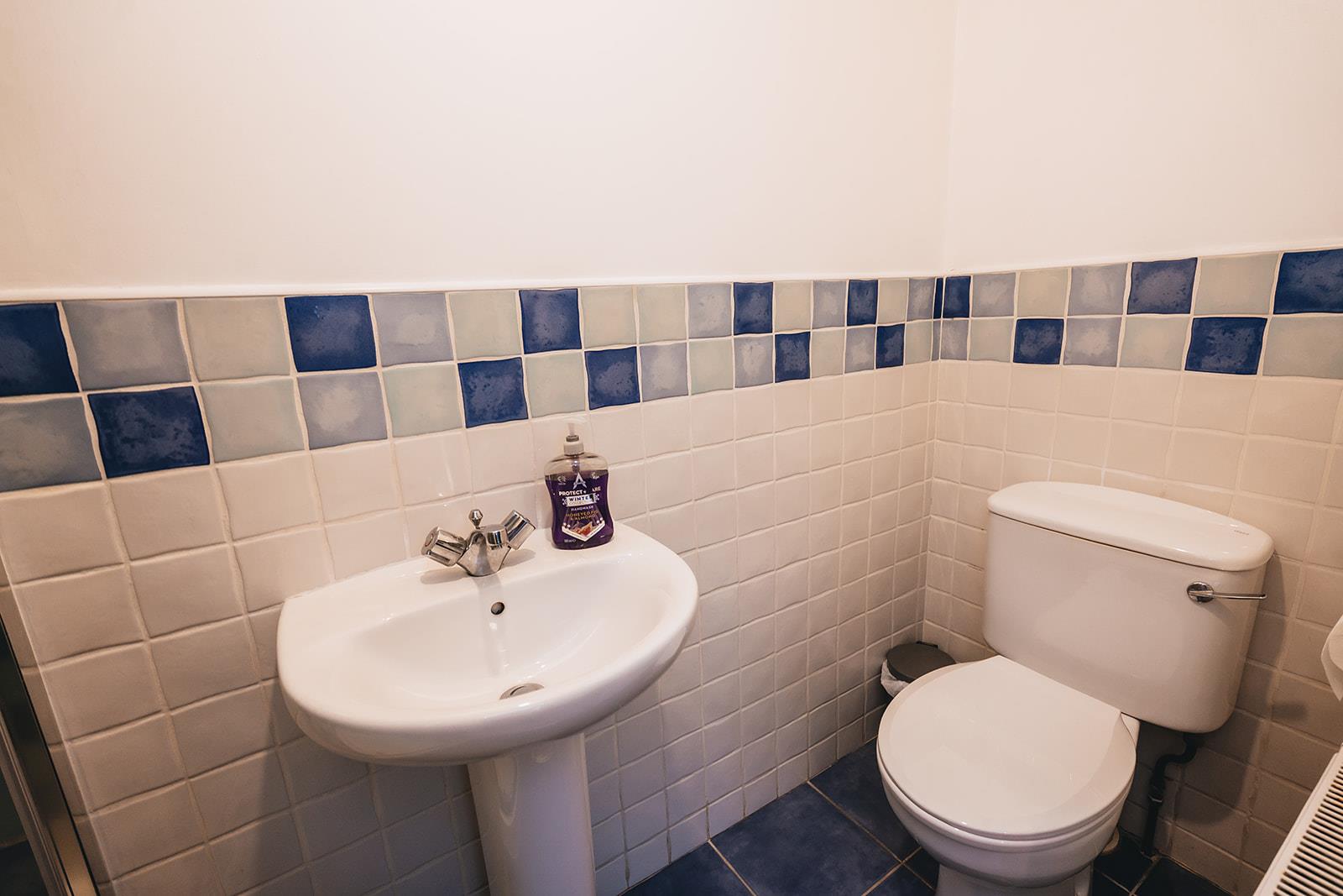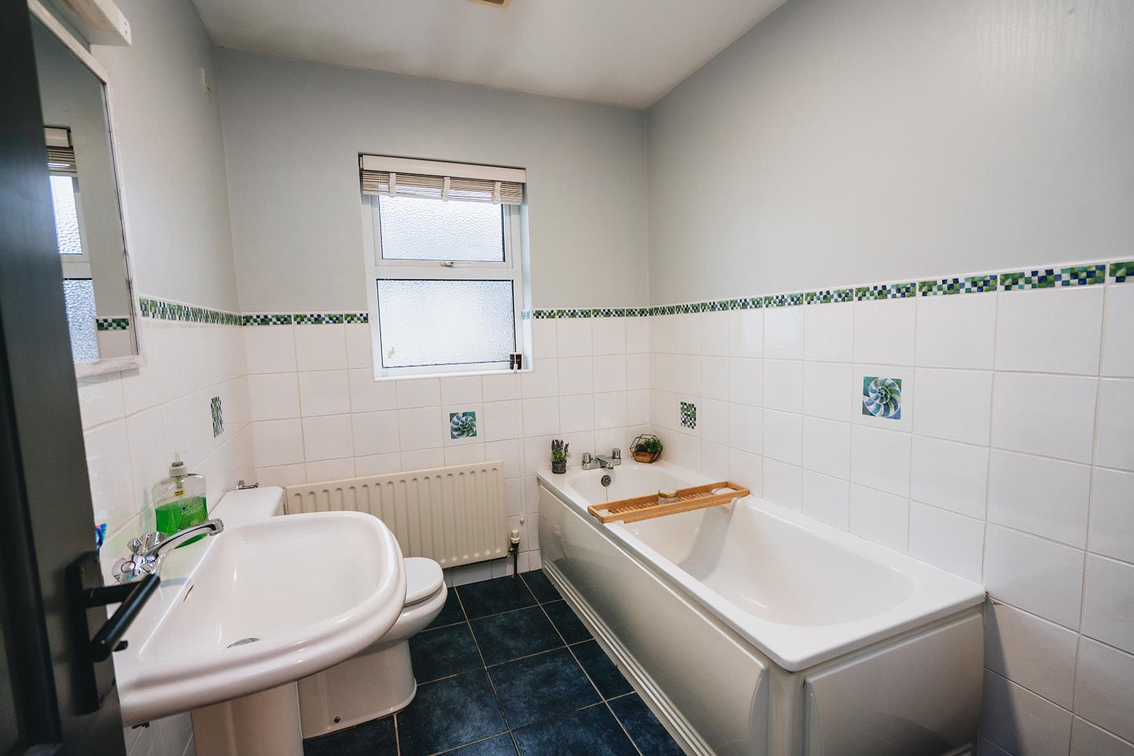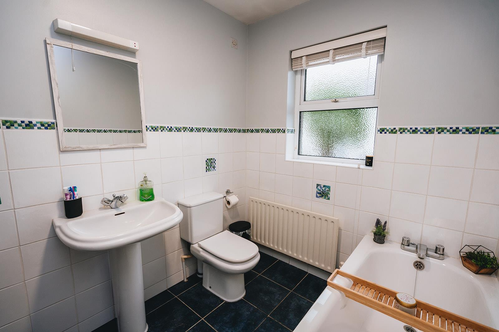 Family bathroom comprising panel bath, low flush wc, pedestal wash hand basin, part tiled walls and tiled floor.