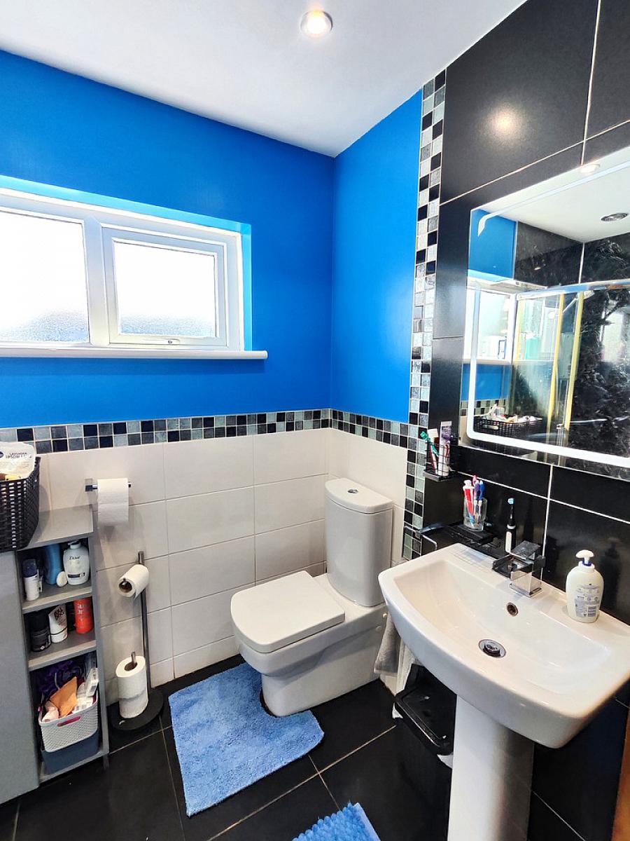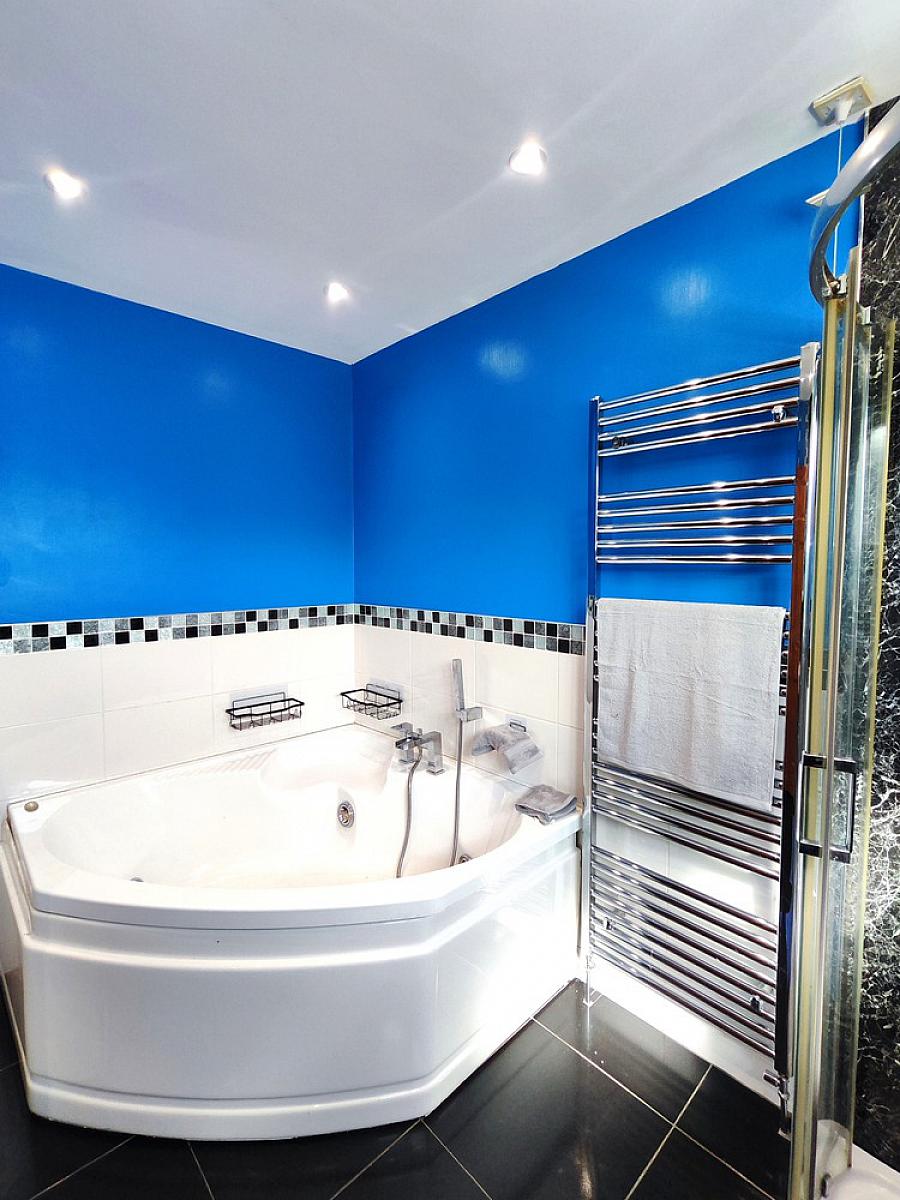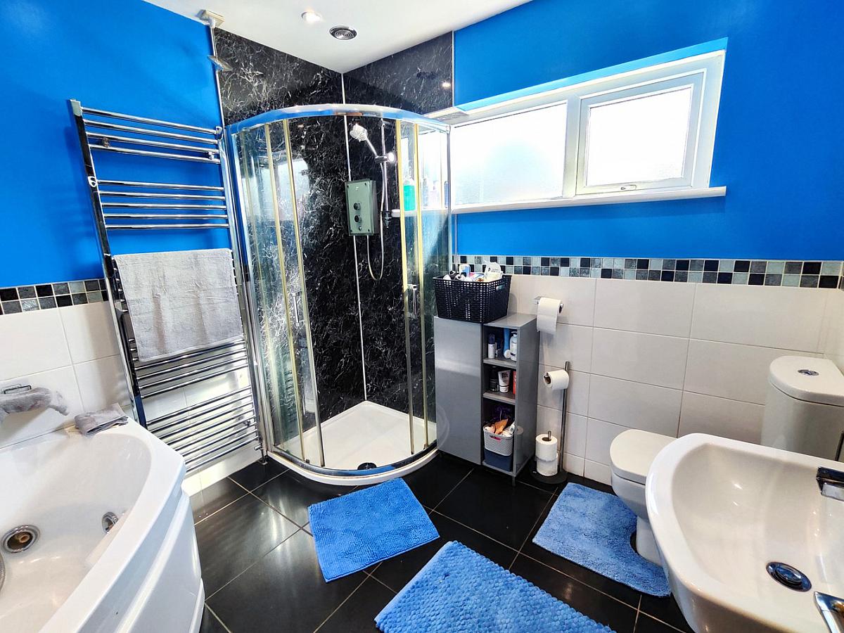 Suite comprising fully cladded electric shower cubicle, low flush WC, Corner "Jacuzzi" bath with water fall tap & shower attachment, pedestal wash hand basin, part tiled walls, chrome heated towel rail, extractor fan, tiled floor and bathroom mirror with LED.