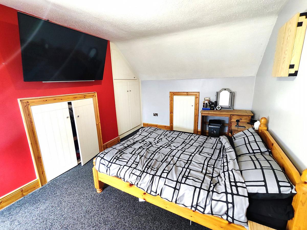 With built in storage into eaves and fully shelved walk-in dressing room.