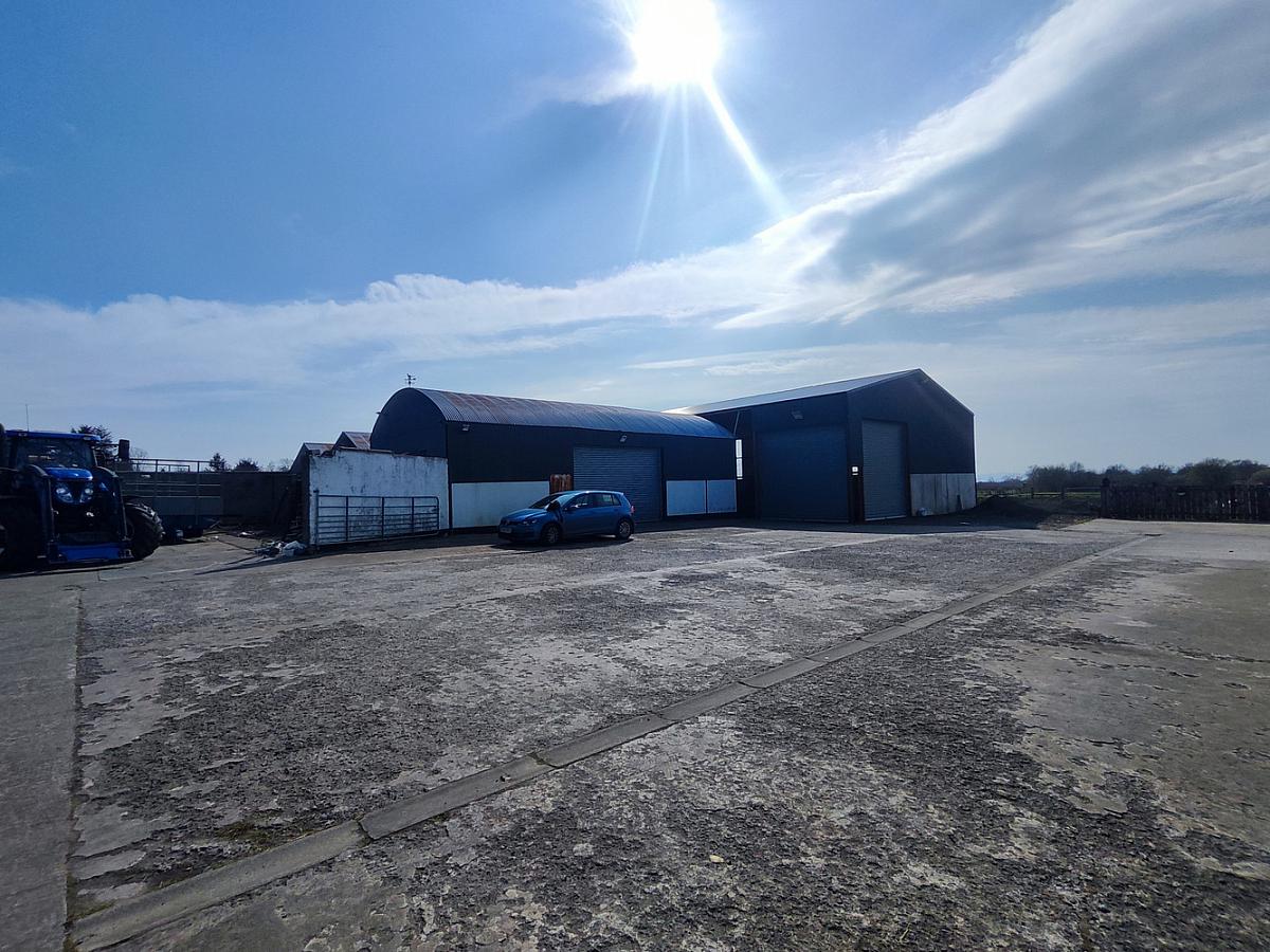 (Portal clad frame with concrete base) With double roller doors 15ft clearance approx. lights and mains power.