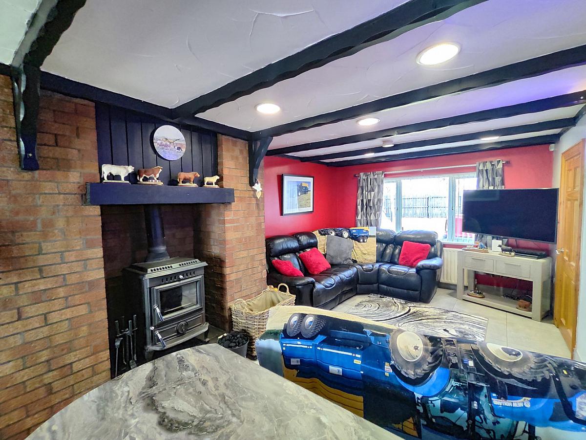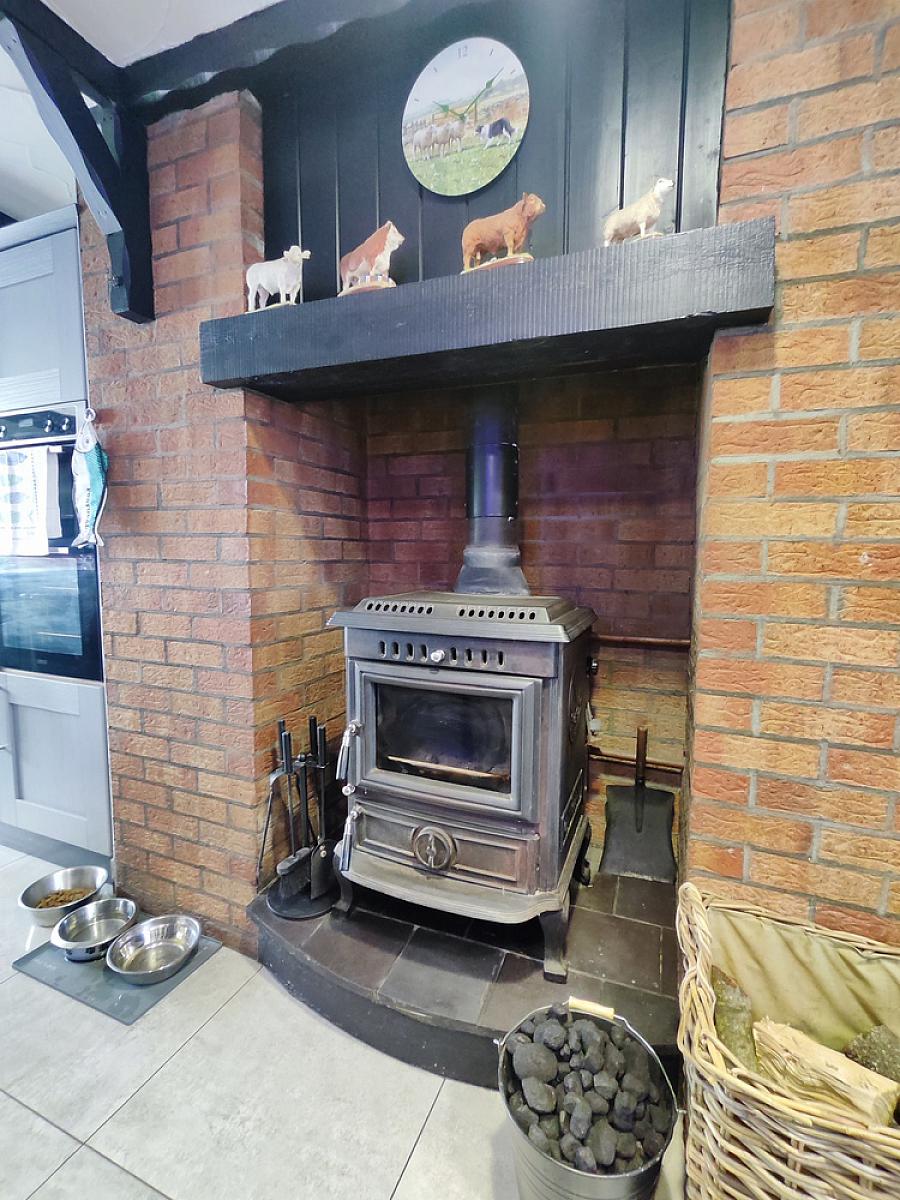 With Inglenook fireplace with multi fuel stove, points for wall lights, brush steel light fittings and tiled floor.