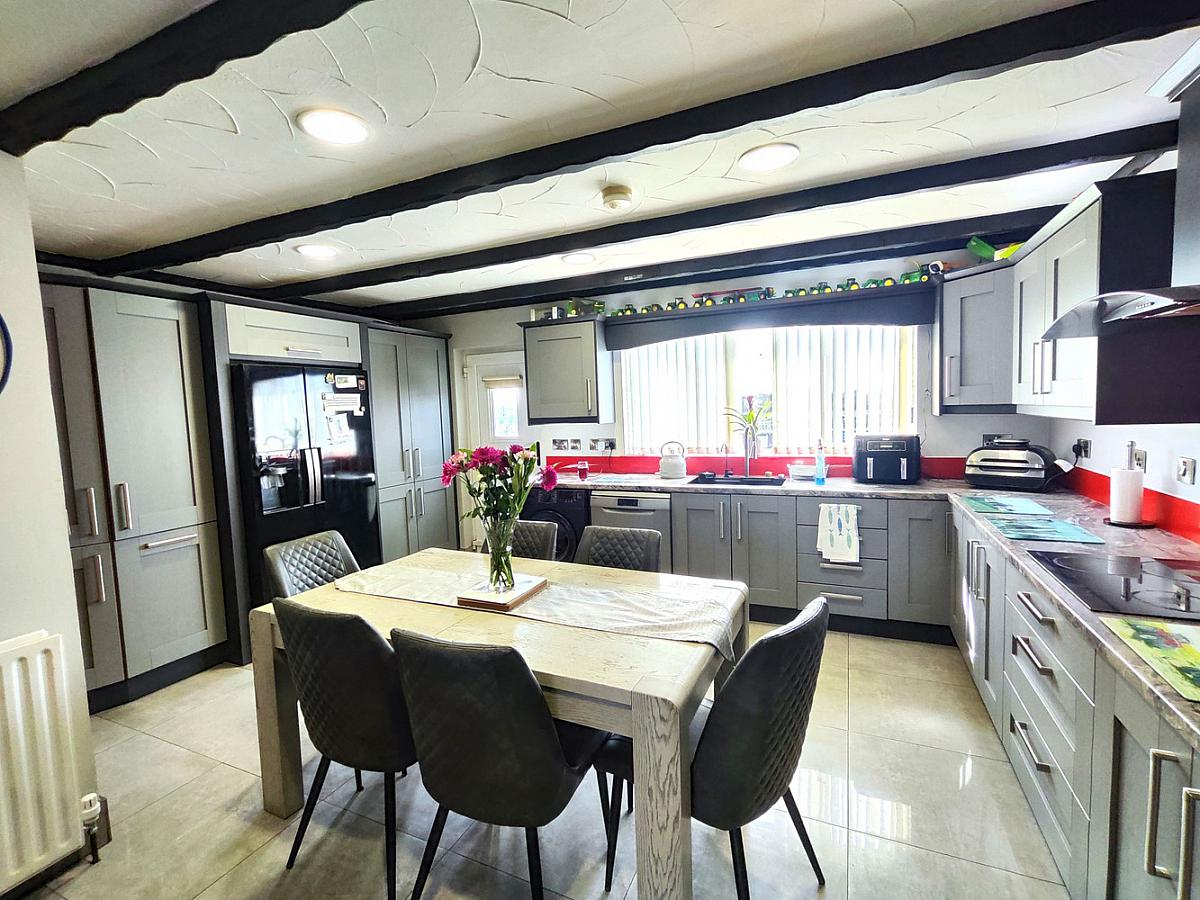 With a range of eye & low level fitted units, breakfast bar, 1 1/2 bowl sink unit with mixer tap, integrated eye level double oven, integrated "Hotpoint" induction hob with extractor fan overhead, space & plumbing for American style fridge freezer, beam ceiling, recessed ceiling lights, concealed low level lighting and tiled floor.