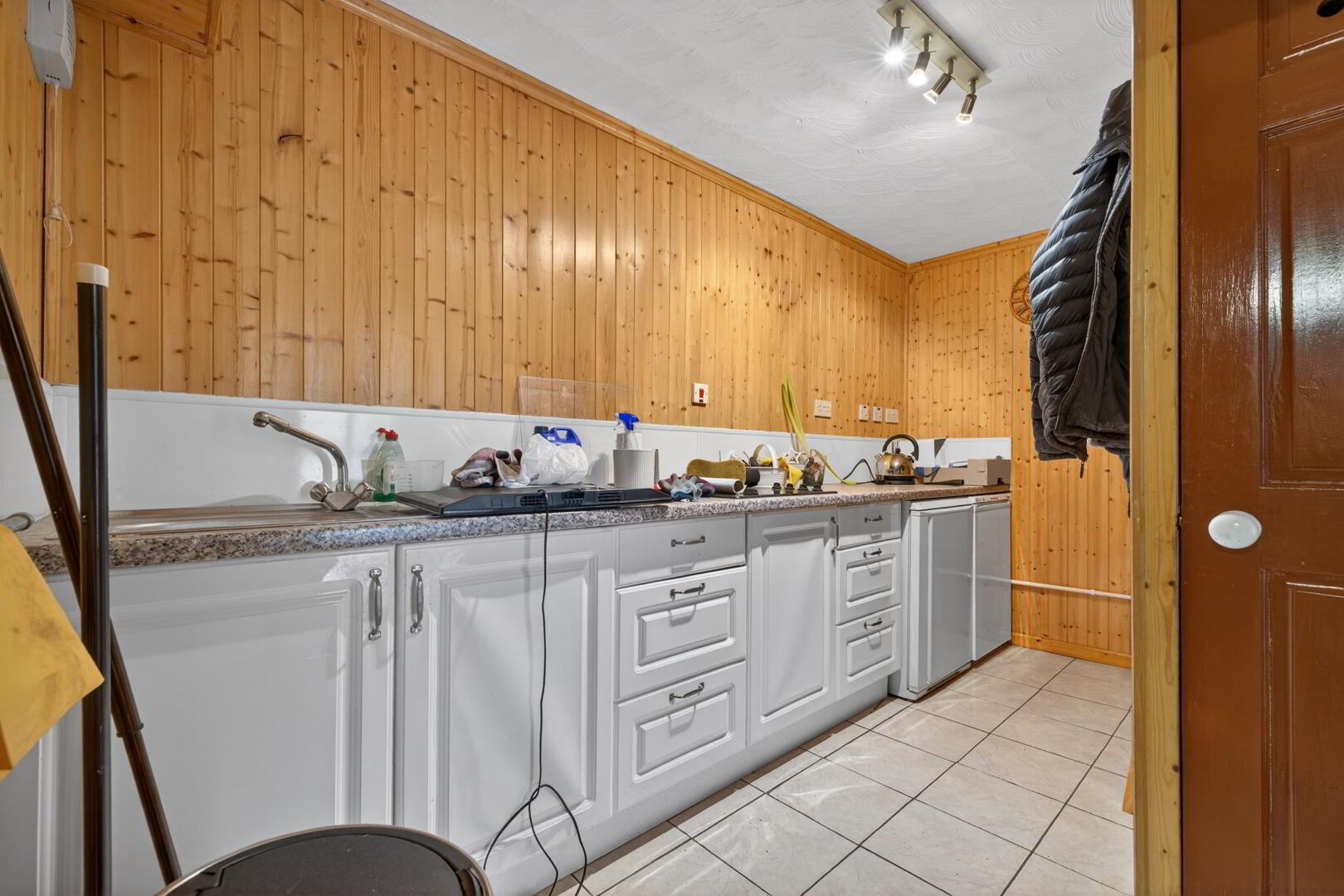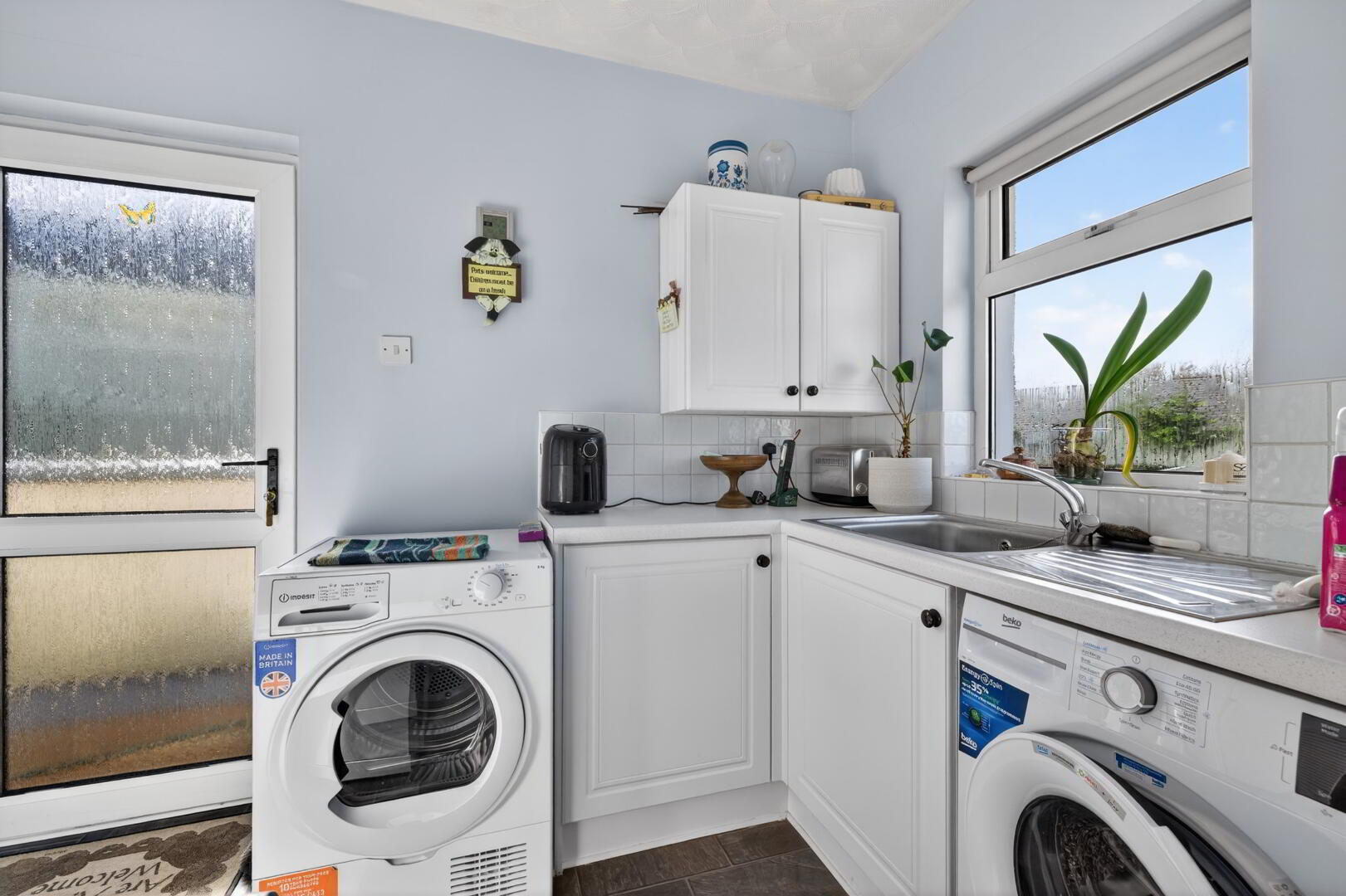 Complimentary range of units including space for washing machine, stainless steel single sink and drainer unit with mixer tap, partially tiled surround, hotpress (shelved), door to exterior